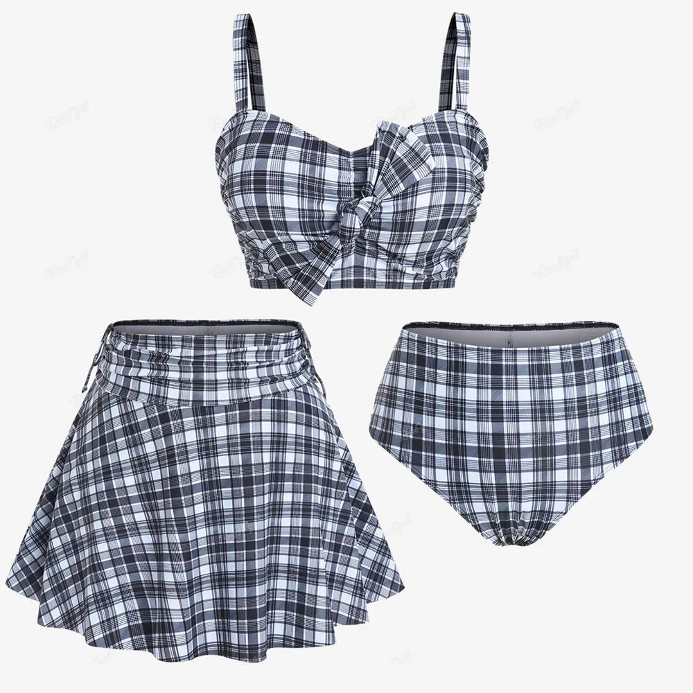 ROSEGAL Women Plus Size Three Piece Tankini Swimsuit Vintage Bowknot Plaid Tummy Control Bathing Suit High Waisted Padded Bikini