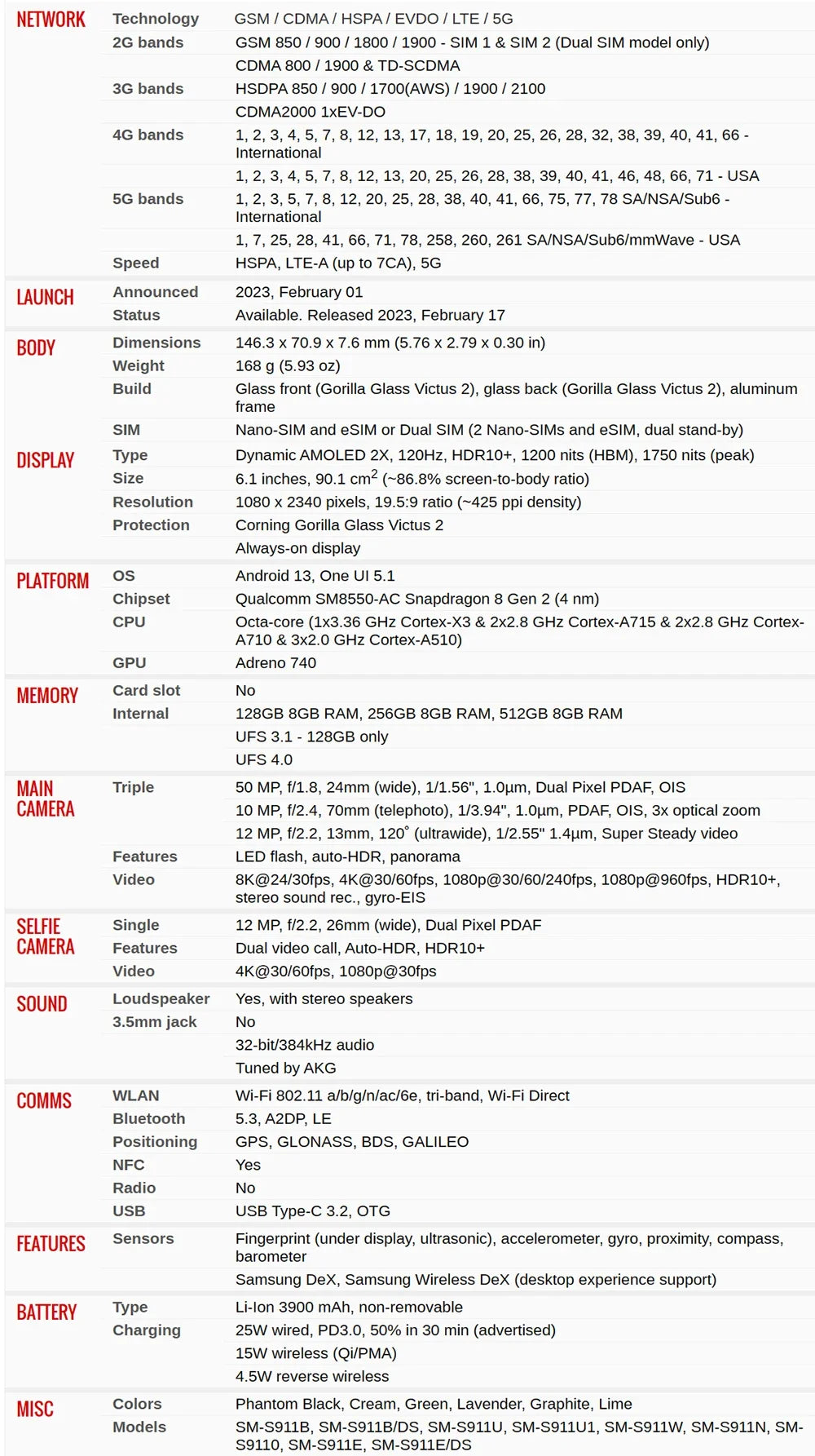 Versioni: SM-S911B, SM-S911B/DS, SM-S911U, SM-S911U1, SM-S911W, SM-S911N, SM-S9110, SM-S911E, SM-S911E/DS