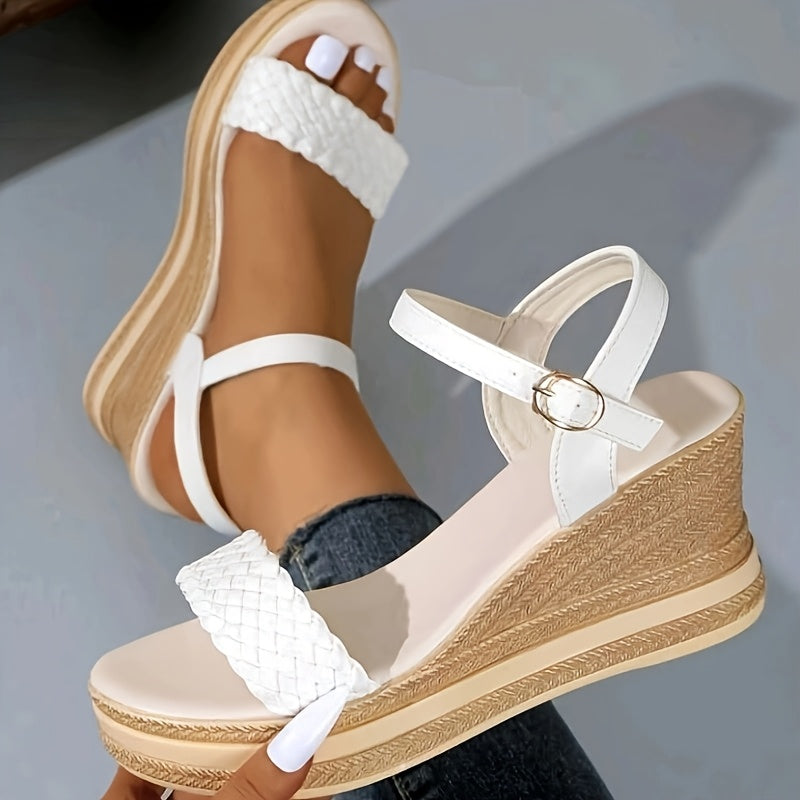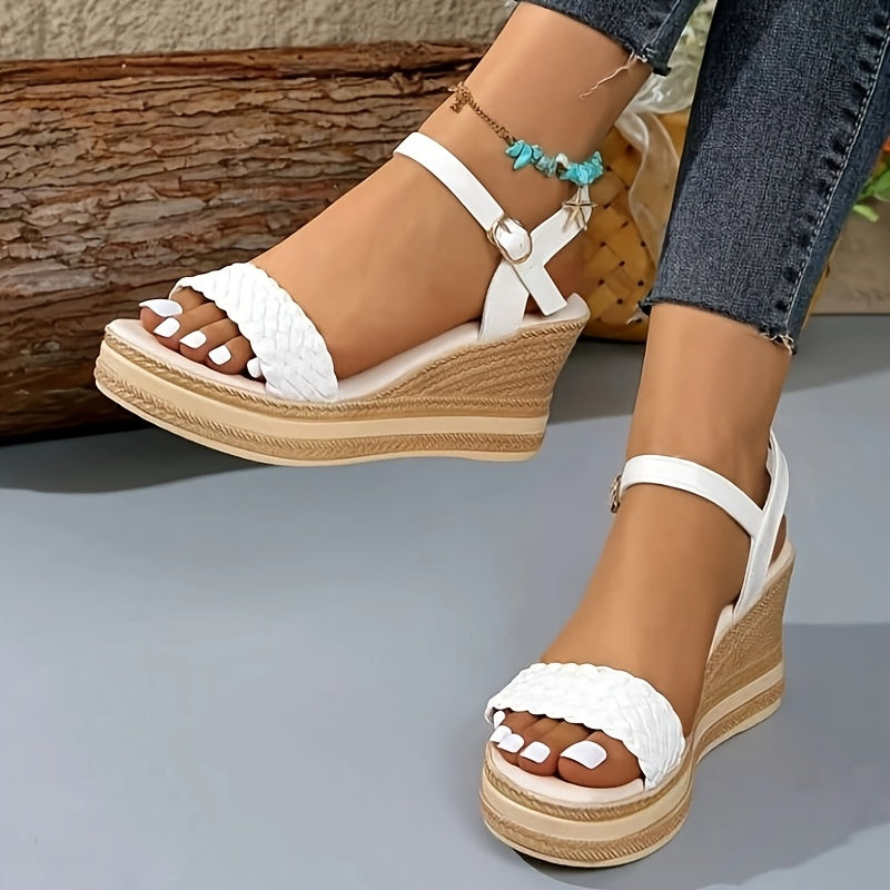 Sandali Eleganti con Tacco a Zeppa Spessa da Donna - Cinturino alla Caviglia Aperto con Fibbia Regolabile, Parte Superiore in PU e Suola Antiscivolo in Gomma, Scarpe Casual o Eleganti Bianche, Sandalo con Motivo Incrociato, Chiusura Sicura per Tutti i Gio