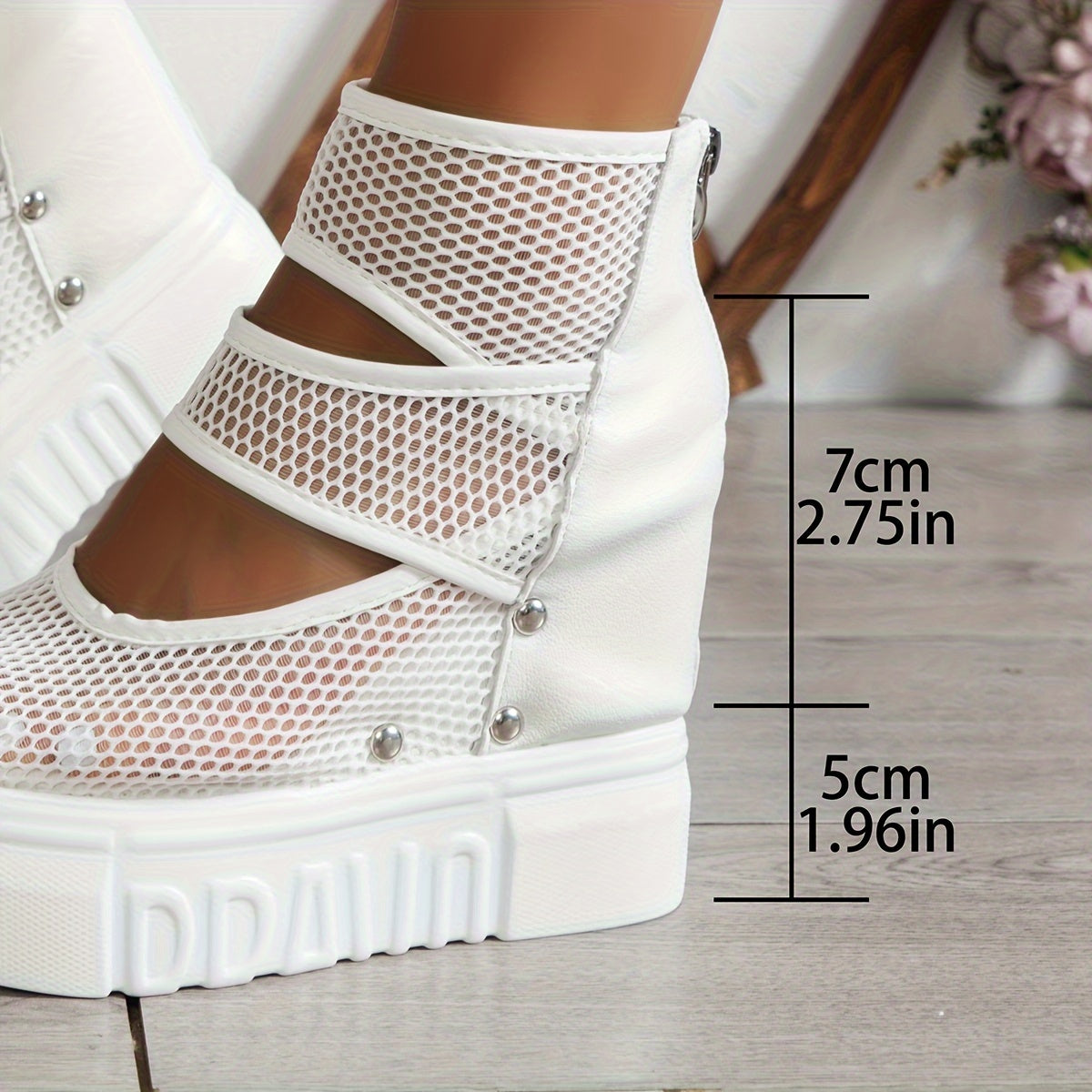 Sandali eleganti da donna con plateau a zeppa con cerniera posteriore, sandali con borchie a suola morbida in tinta unita, scarpe da vacanza traspiranti in rete