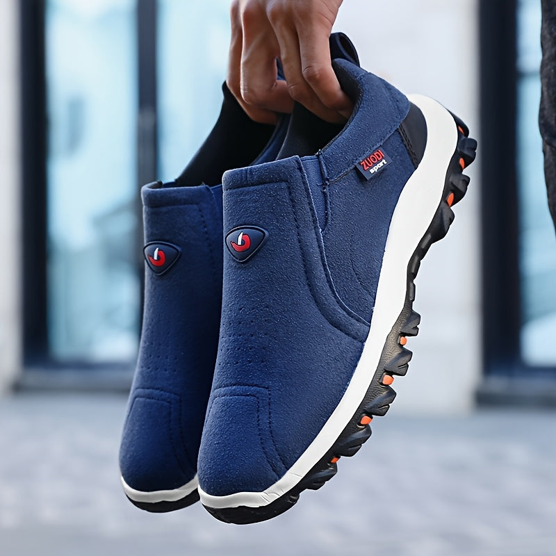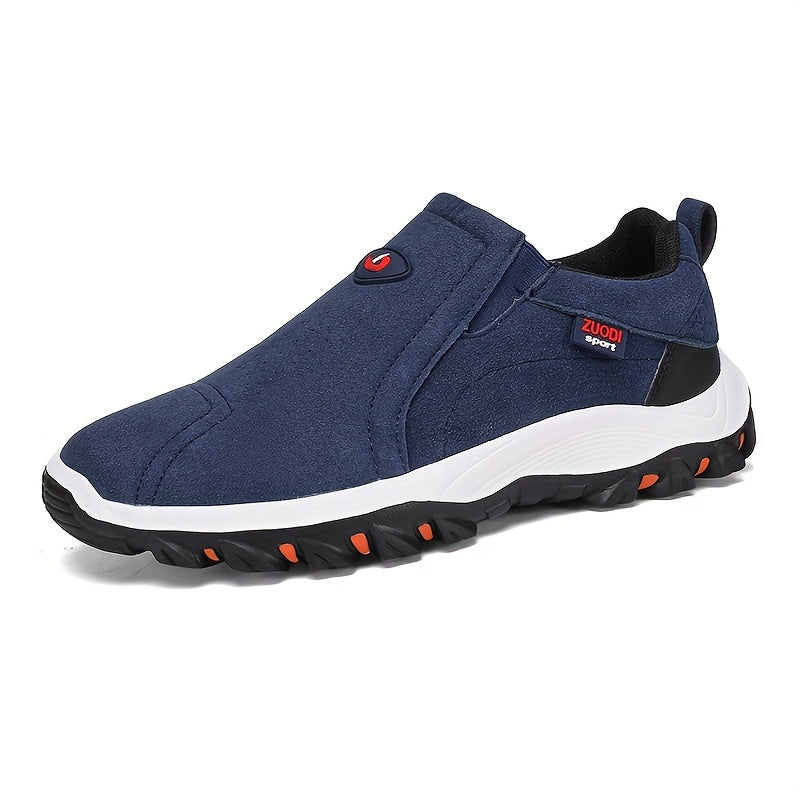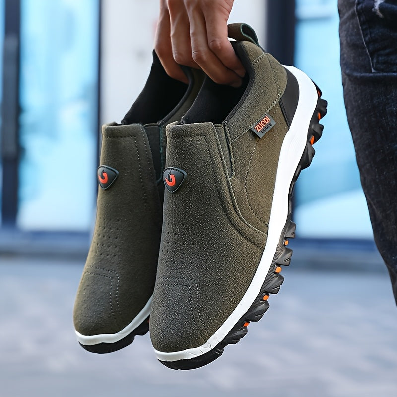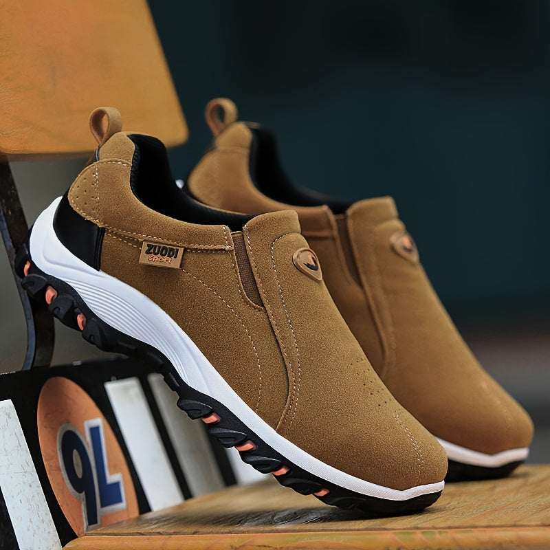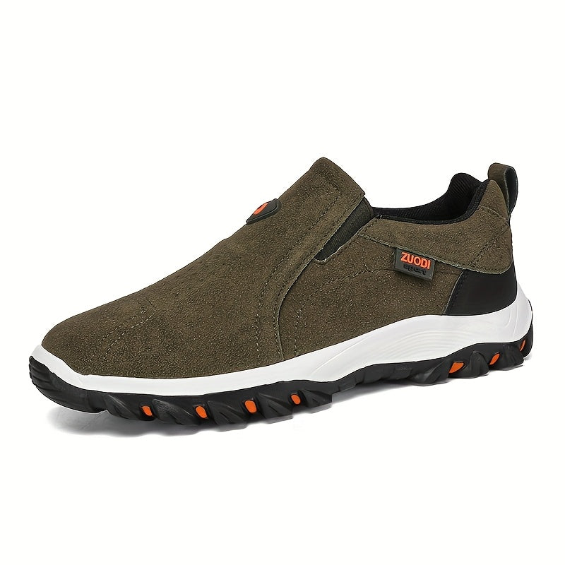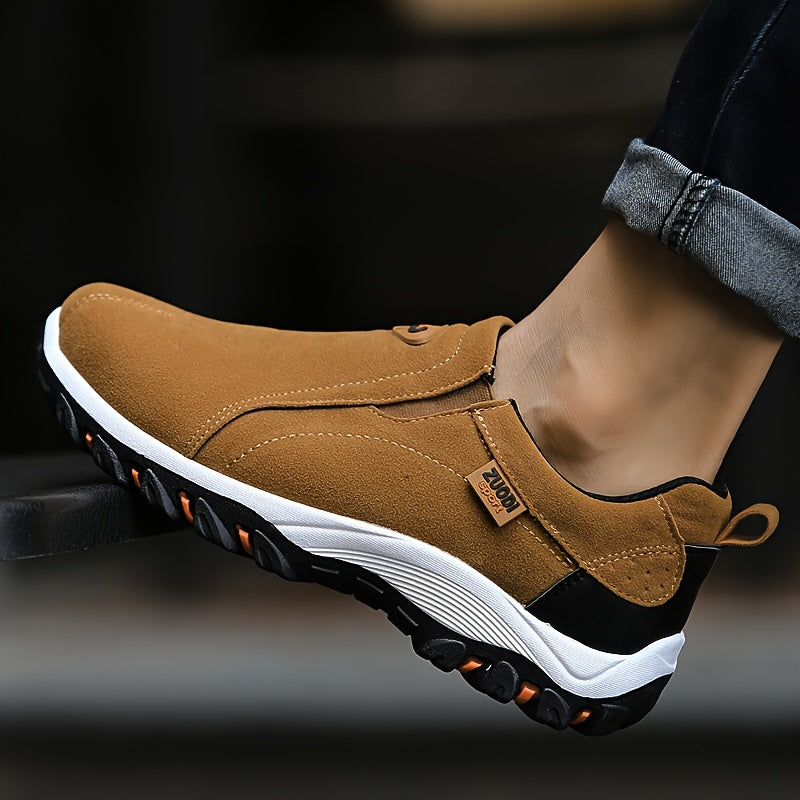 Scarpe da Ginnastica Slip-On alla Moda per Uomo - Tomaia Marrone, Suola Nera e Arancione, Fodera in Tessuto Confortevole, Design Basso Casual per Abbigliamento Informale, Escursionismo e Attività all'Aperto, Scarpe per Tutte le Stagioni | Design di Scarpa