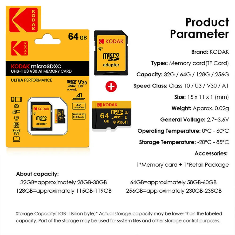 Scheda di memoria Micro Sd originale Kodak Scheda SD da 64 GB 128 GB Scheda Flash Micro SDXC Class10 Scheda di memoria SD da 256 GB 32 GB per la registrazione della fotocamera