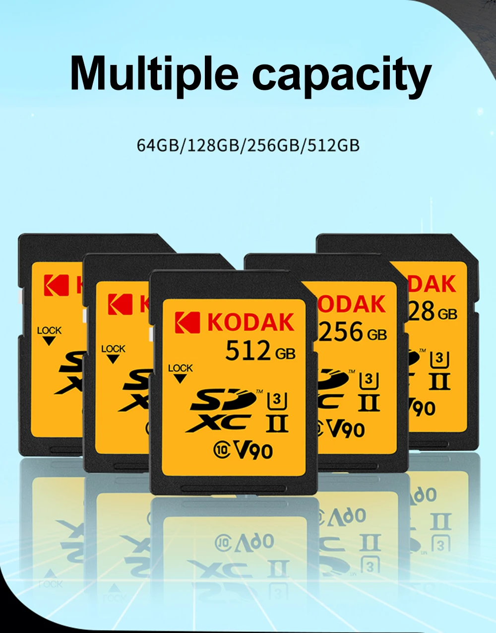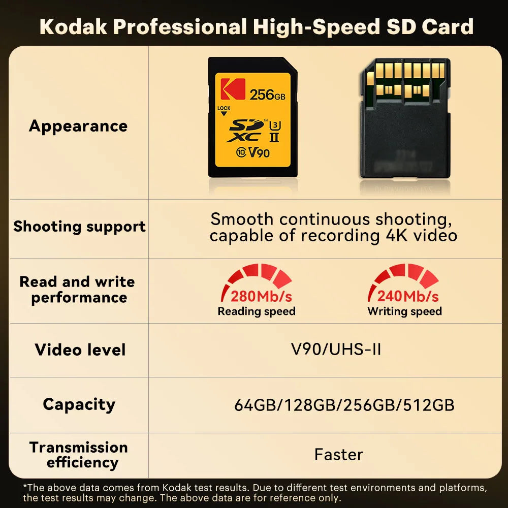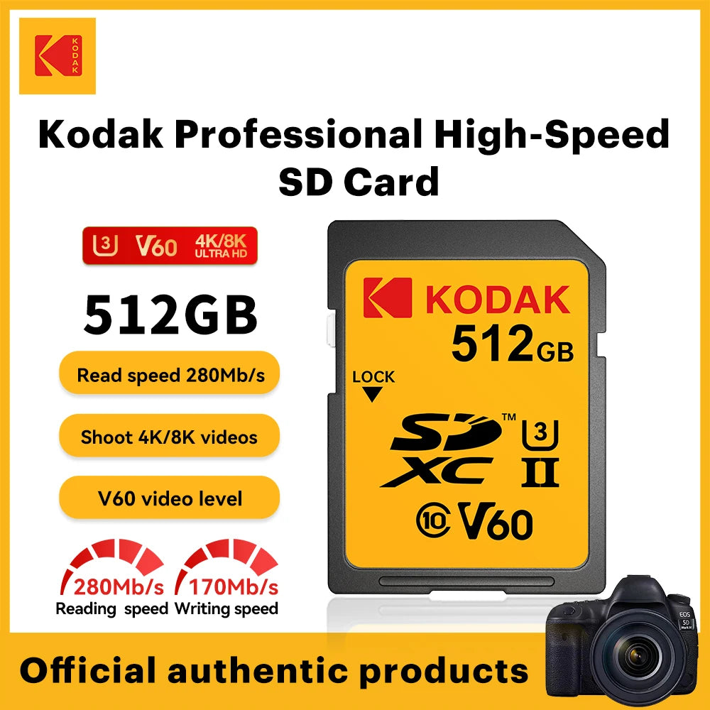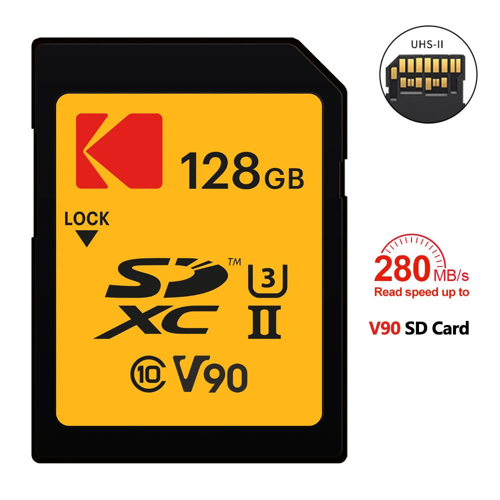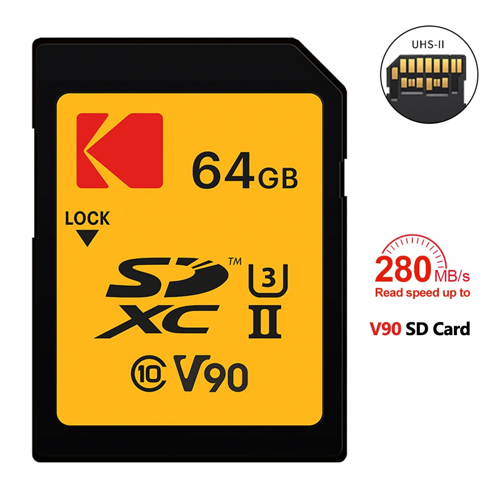 Scheda SD Kodak V90/V60/V30 Scheda di memoria per fotocamera professionale Velocità di lettura fino a 280 MB/s 128 GB 256 GB 512 GB SDXC UHS II Supporto 4K 8K