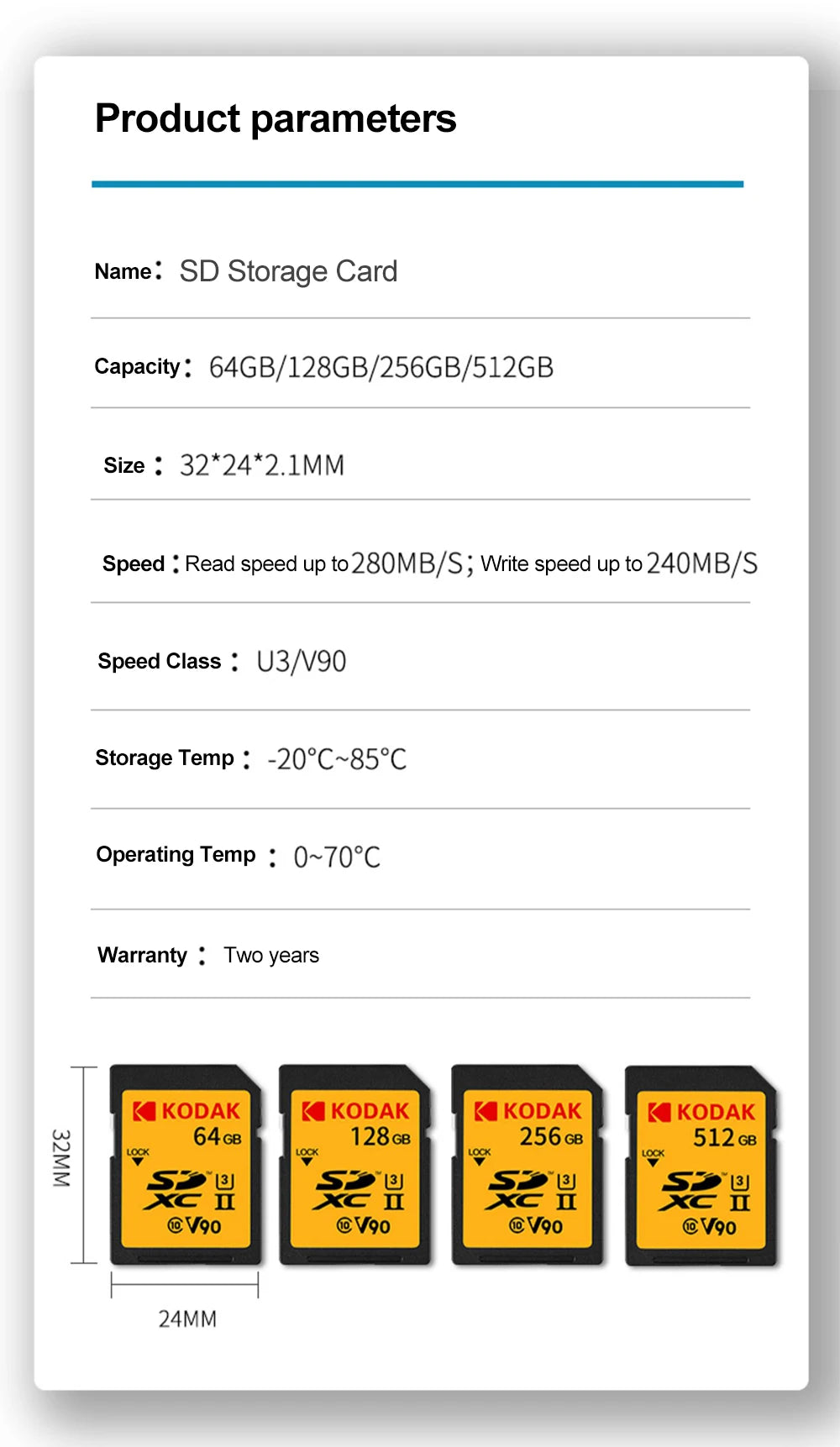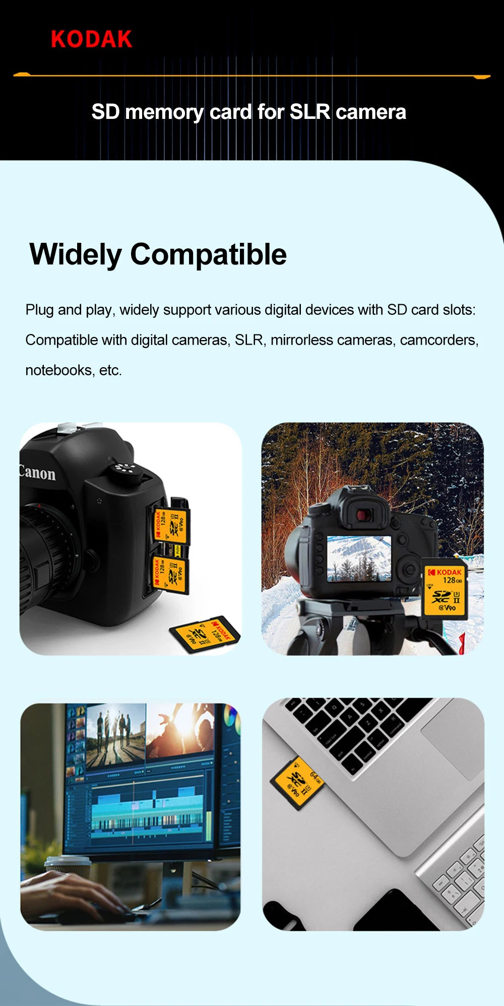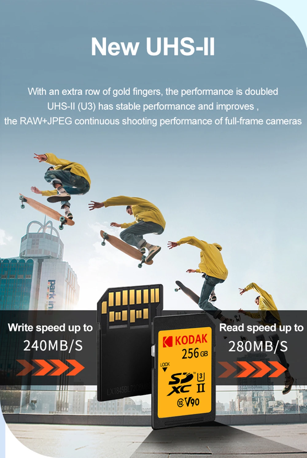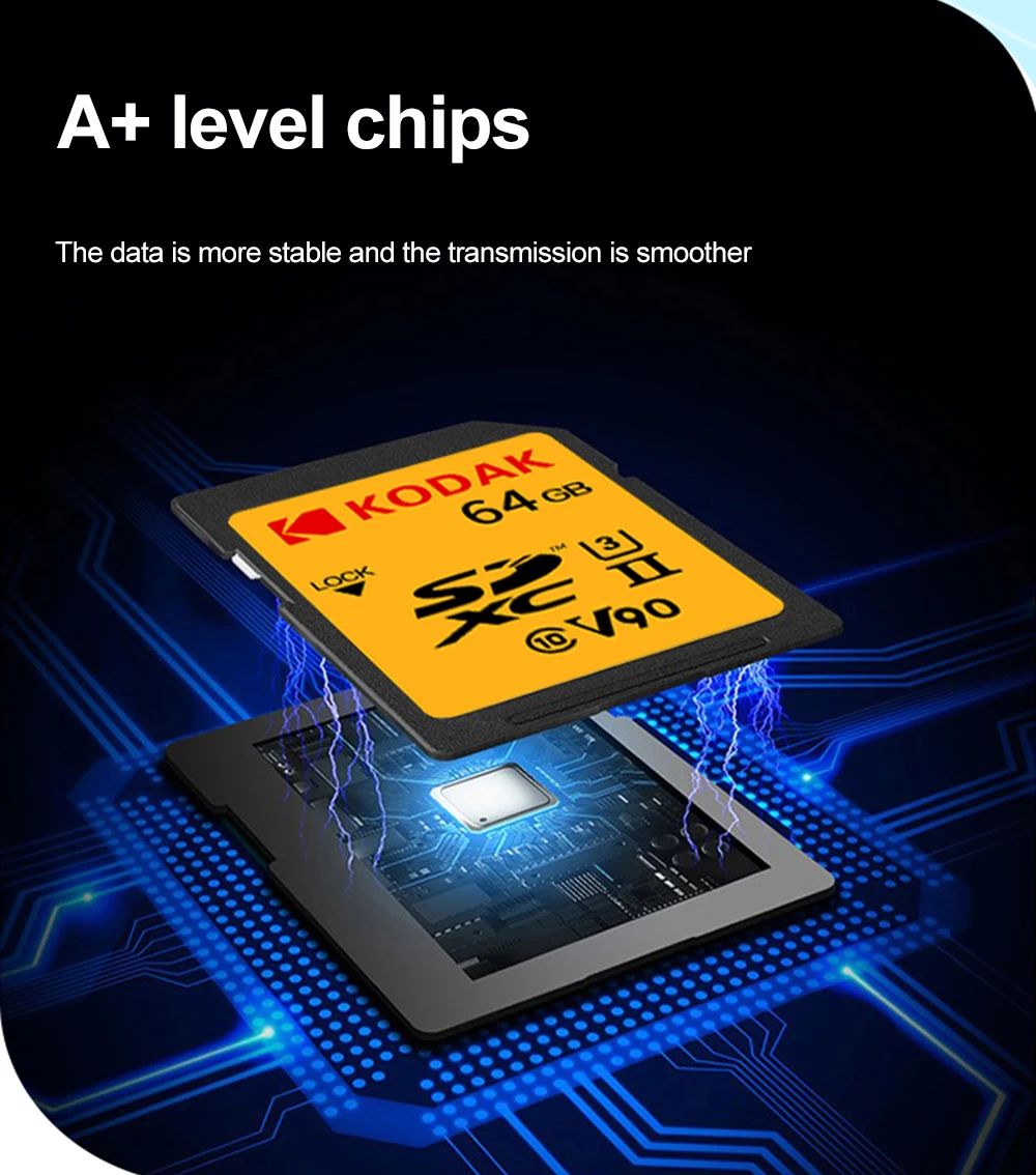 Scheda SD Kodak V90/V60/V30 Scheda di memoria per fotocamera professionale Velocità di lettura fino a 280 MB/s 128 GB 256 GB 512 GB SDXC UHS II Supporto 4K 8K