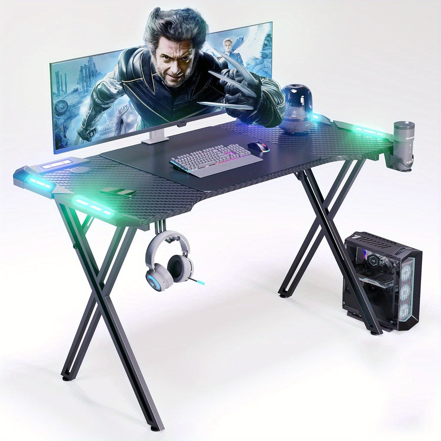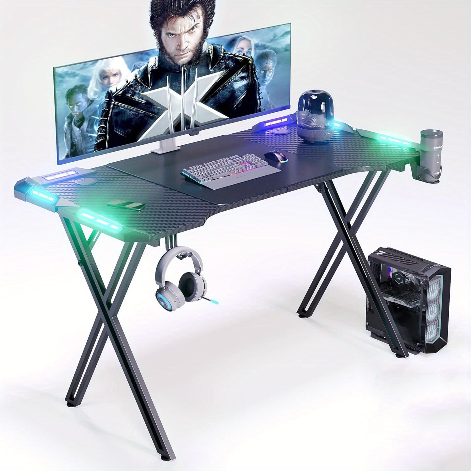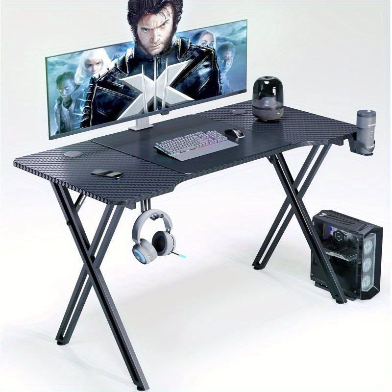Scrivania da gioco include supporto per cuffie e supporto per bicchieri e foro per cavi. Coating in fibra di carbonio per scrivania da gioco per PC fatta con telaio X.