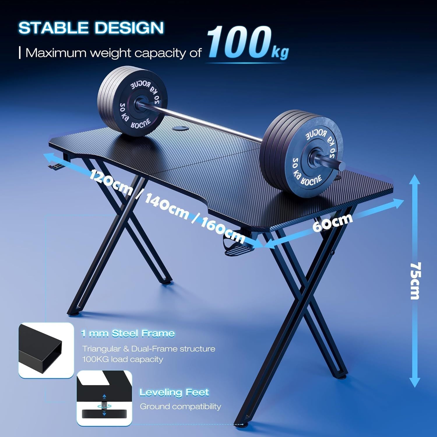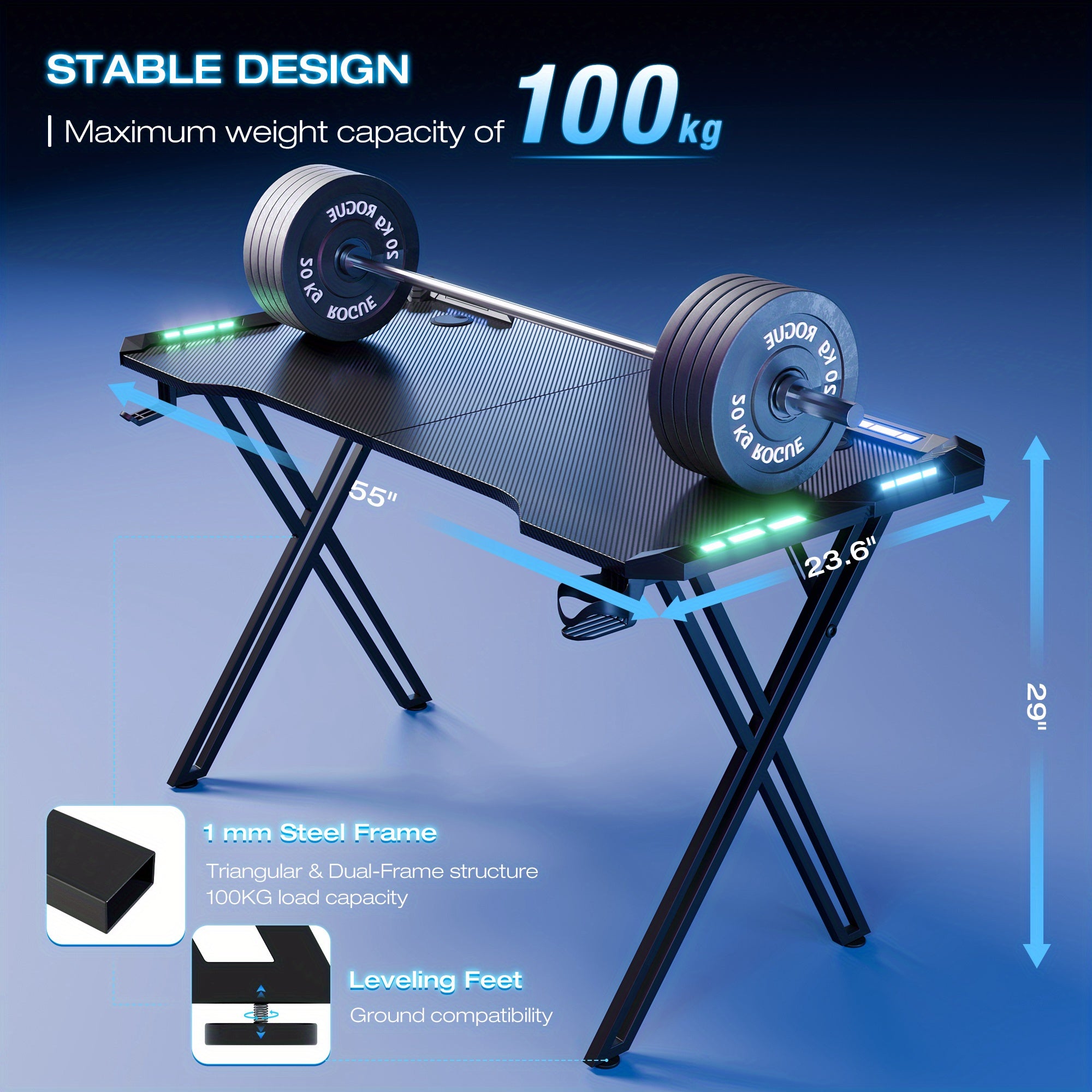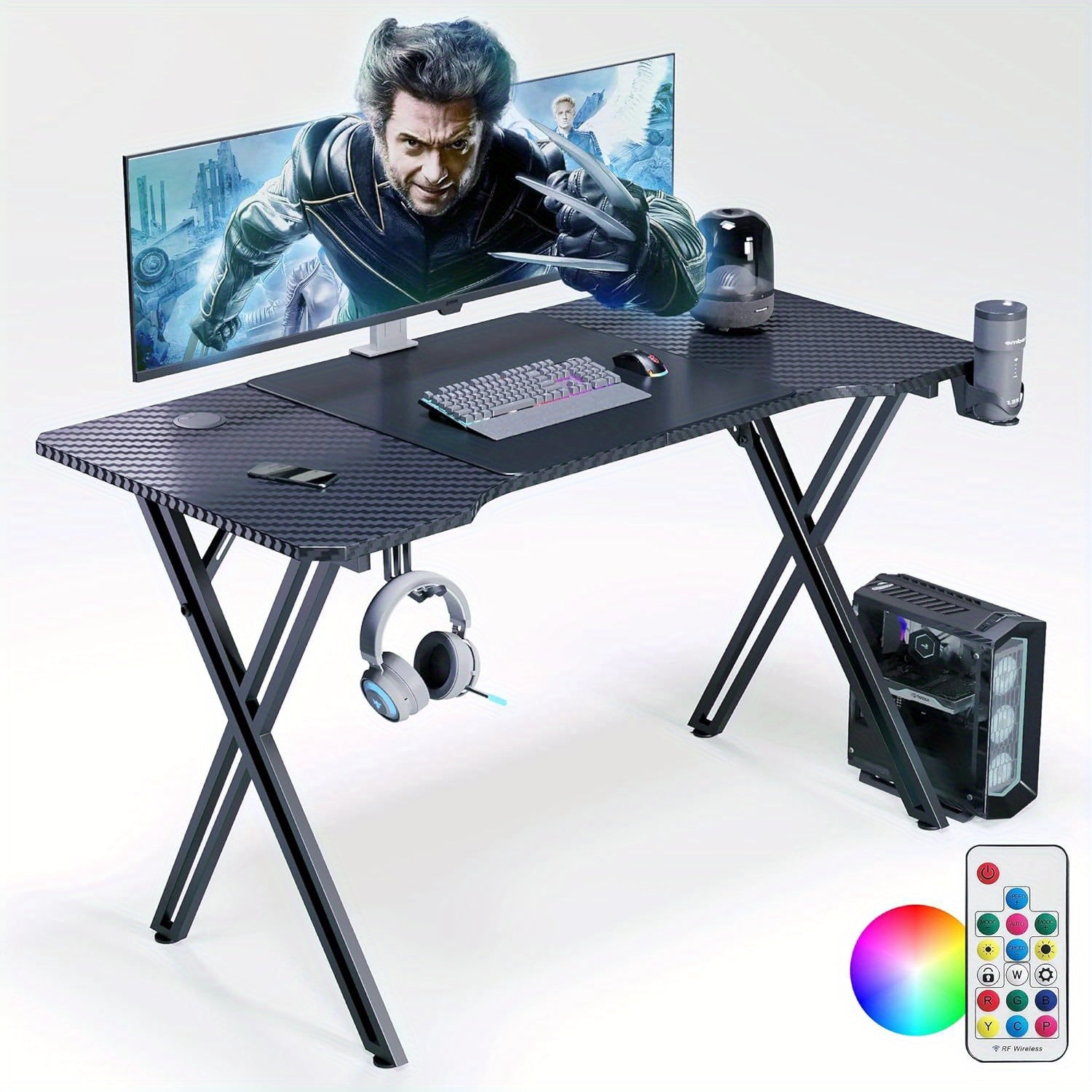 Scrivania da gioco include supporto per cuffie e supporto per bicchieri e foro per cavi. Coating in fibra di carbonio per scrivania da gioco per PC fatta con telaio X.