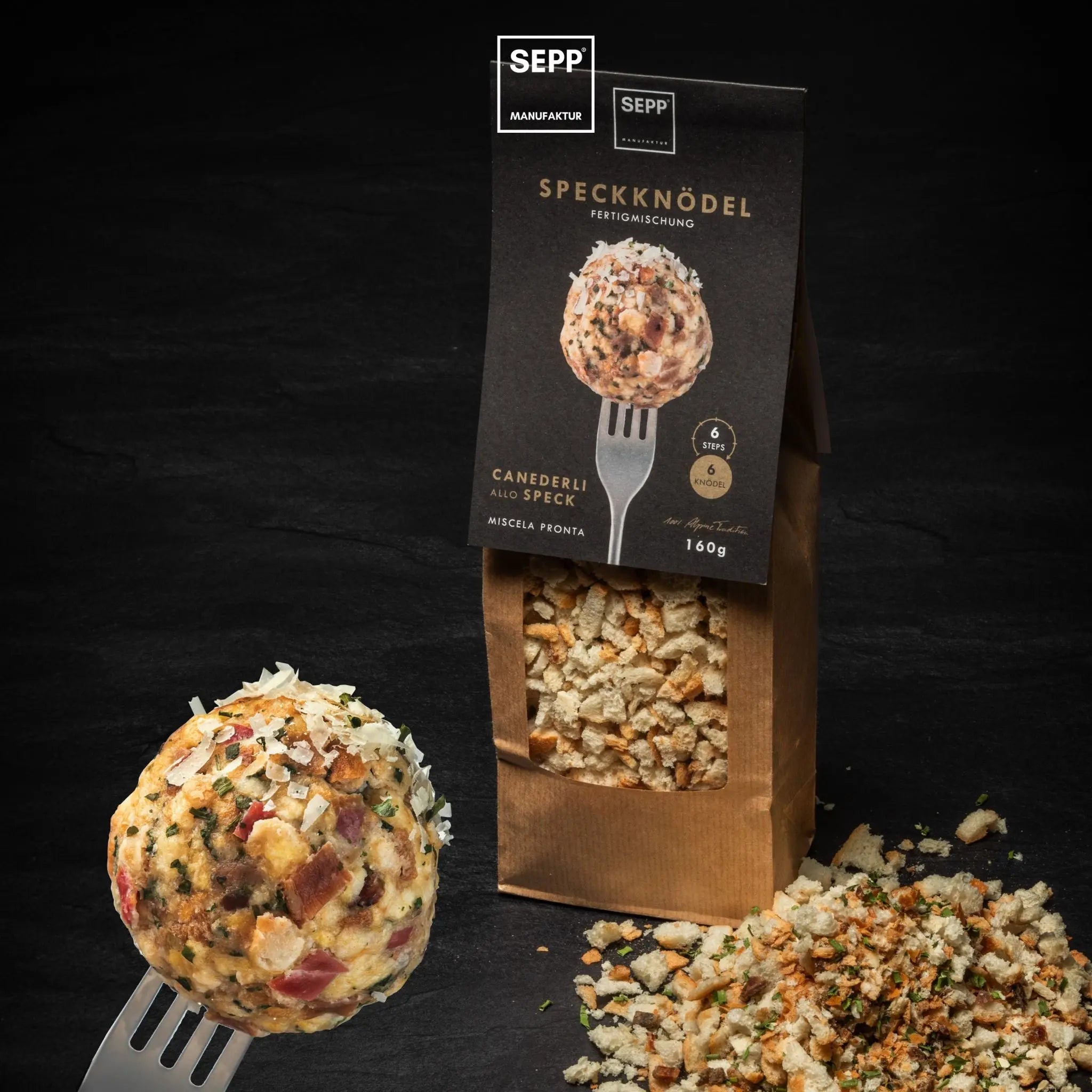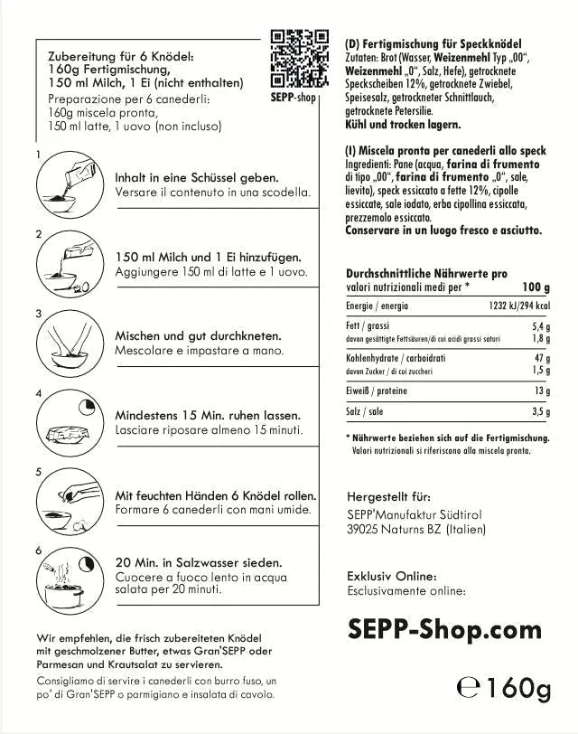 Fertigmischung für SEPP'Speckknödel Zutaten: Brot (Wasser, Weizenmehl Typ "00", Weizenmehl "0", Salz, Hefe), getrocknete Speckscheiben 12%, getrocknete Zwiebel, Speisesalz, getrockneter Schnittlauch, getrocknete Petersilie.
