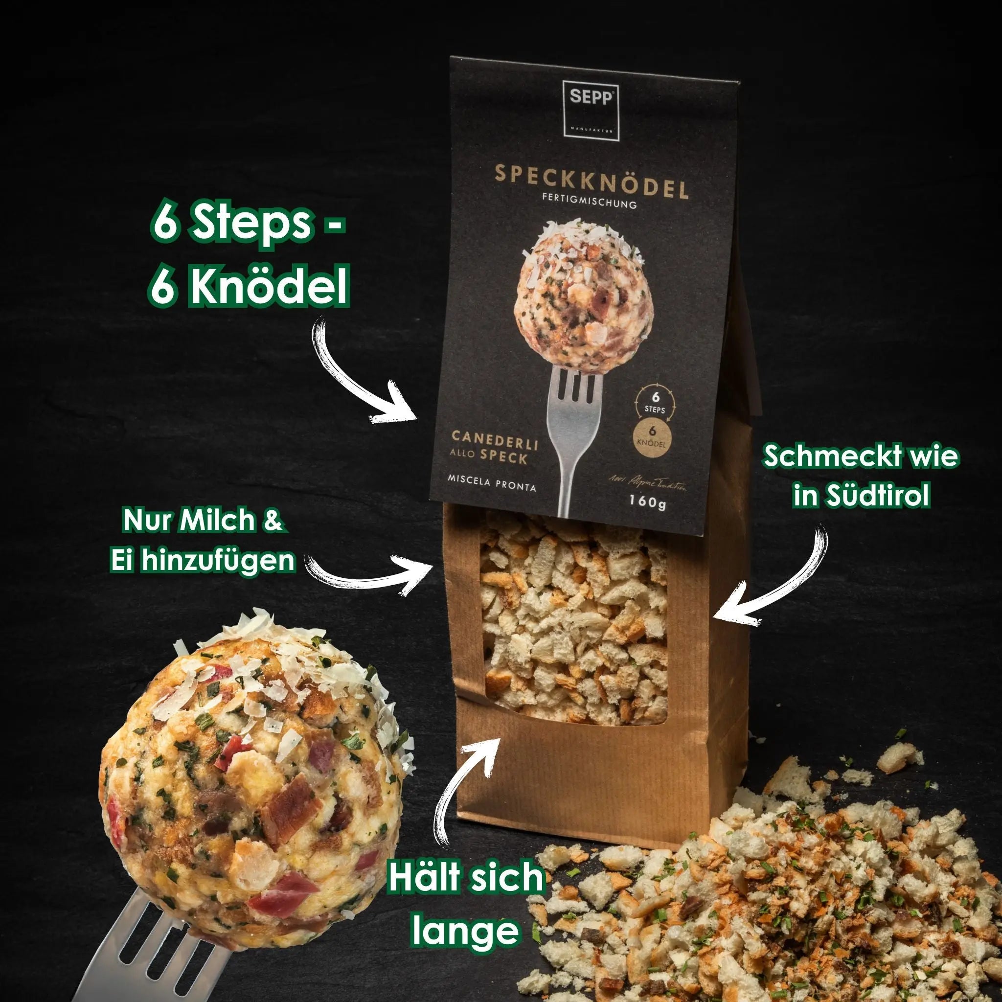 Ob als Hauptgericht oder als Beilage – unsere SEPP'Speckknödel begeistern mit ihrer herzhaften Note und angenehmen Textur. Am besten schmecken sie mit Rindssuppe oder Sauerkraut, aber auch zum Salat oder kalt mit Essig sind sie unwiderstehlich. So einfach war gute Südtiroler Hausmannskost noch nie! Wer die Küche Südtirols kennenlernen möchte, kommt an diesem kulinarischen Highlight nicht vorbei. Probiere es aus und genieße ein Stück Südtirol auf deinem Teller!