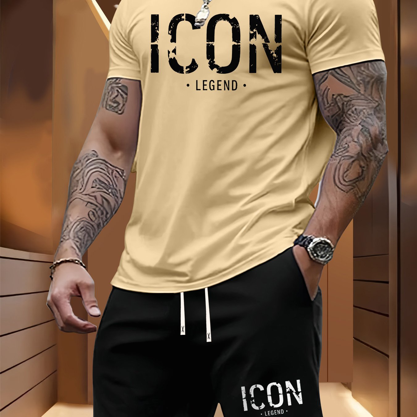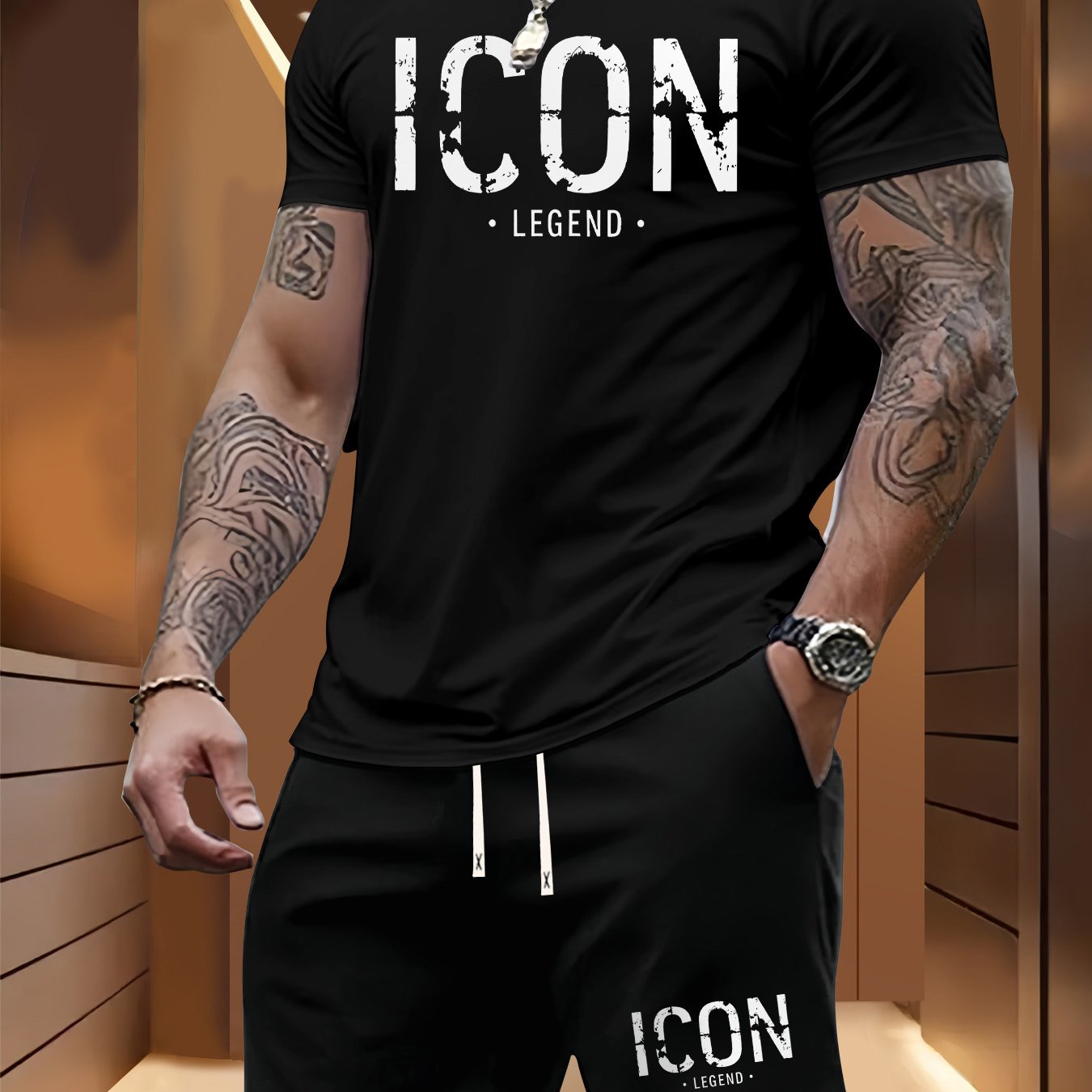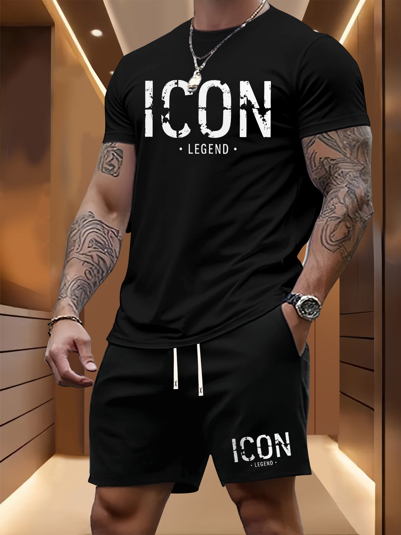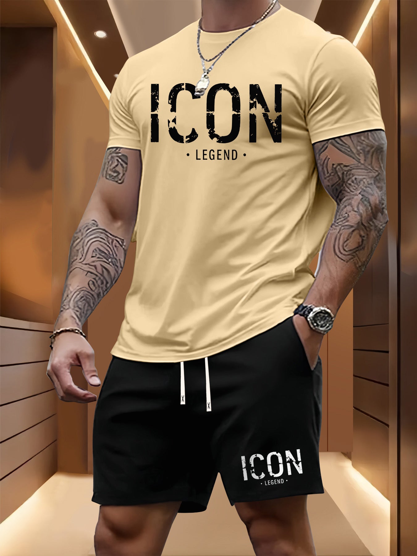 Set da due pezzi con stampa Icon Legend per l'estate - T-shirt casual a maniche corte con scollo a giro e pantaloncini con coulisse, nero e giallo, leggero misto di poliestere, perfetto per un look casual