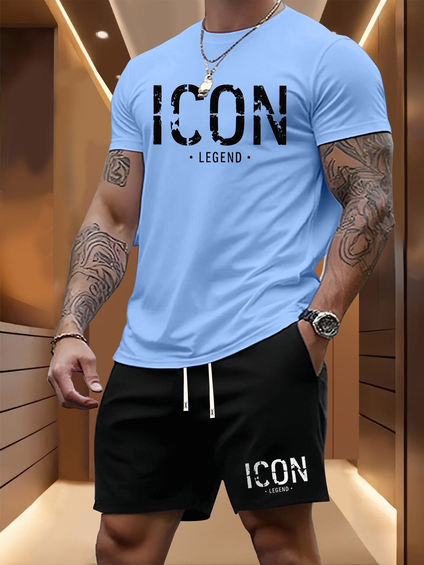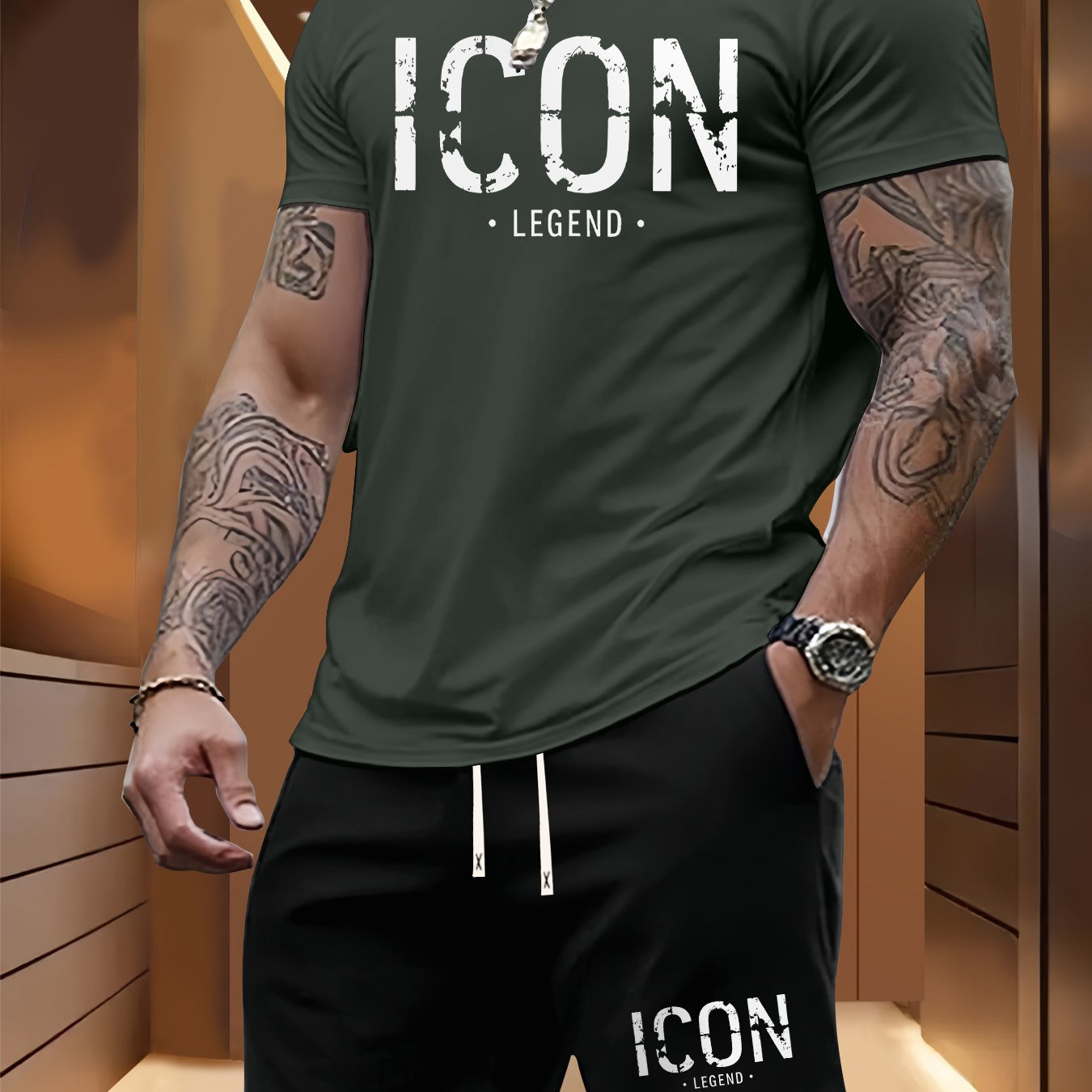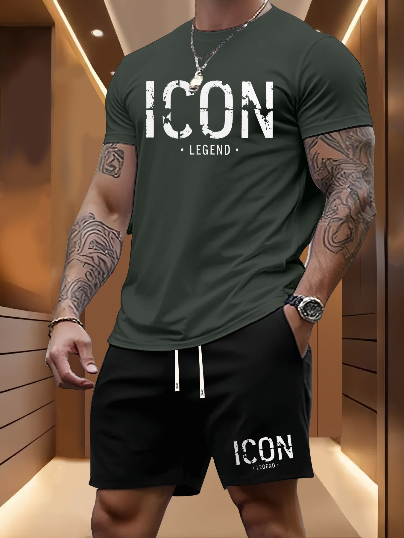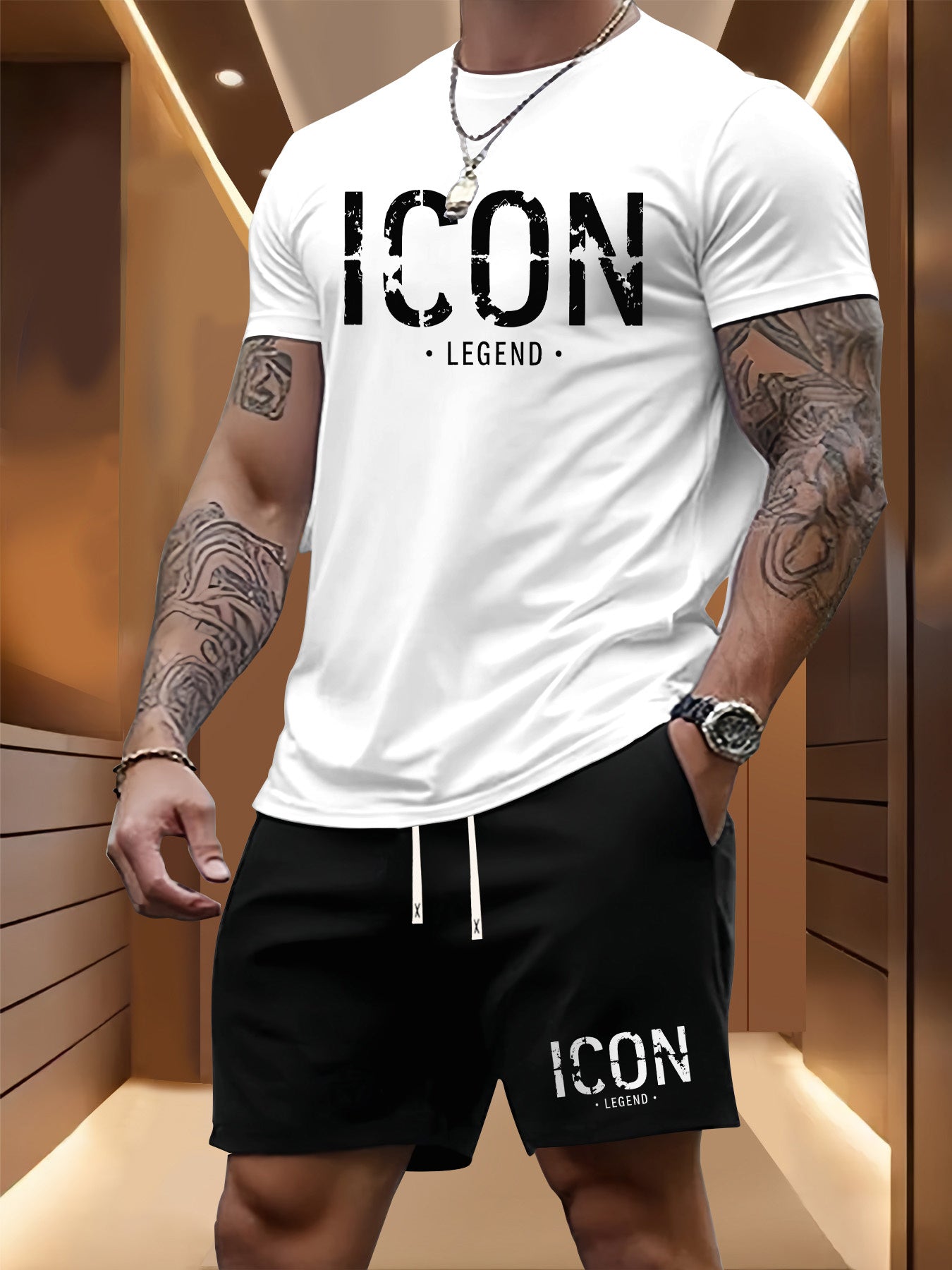 Set da due pezzi con stampa Icon Legend per l'estate - T-shirt casual a maniche corte con scollo a giro e pantaloncini con coulisse, nero e giallo, leggero misto di poliestere, perfetto per un look casual