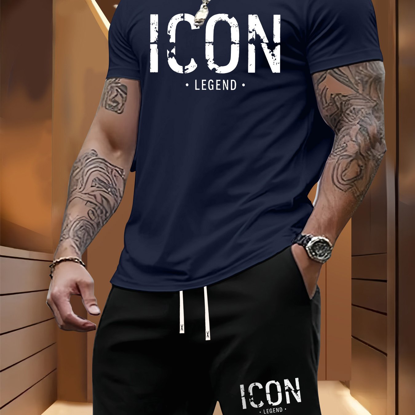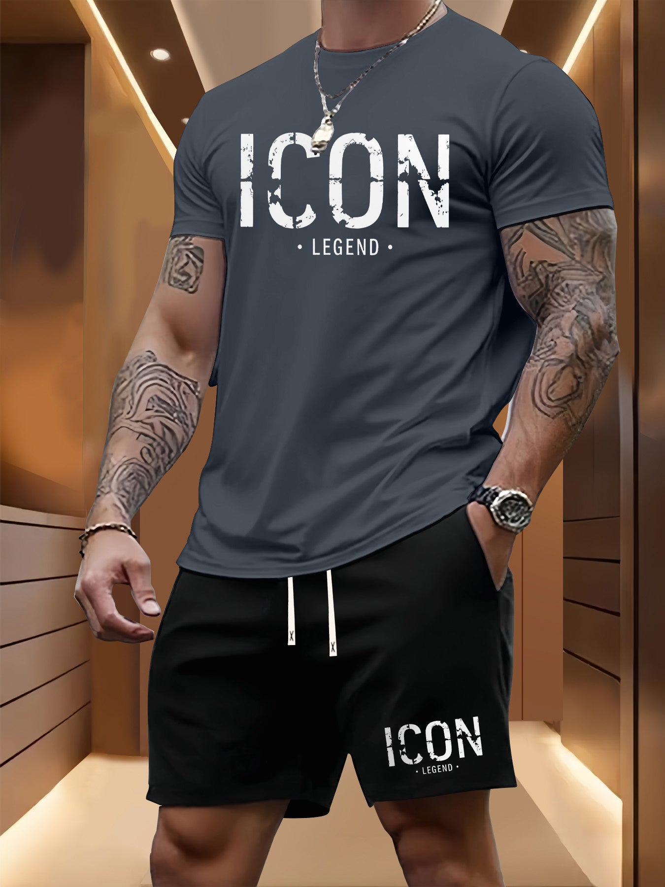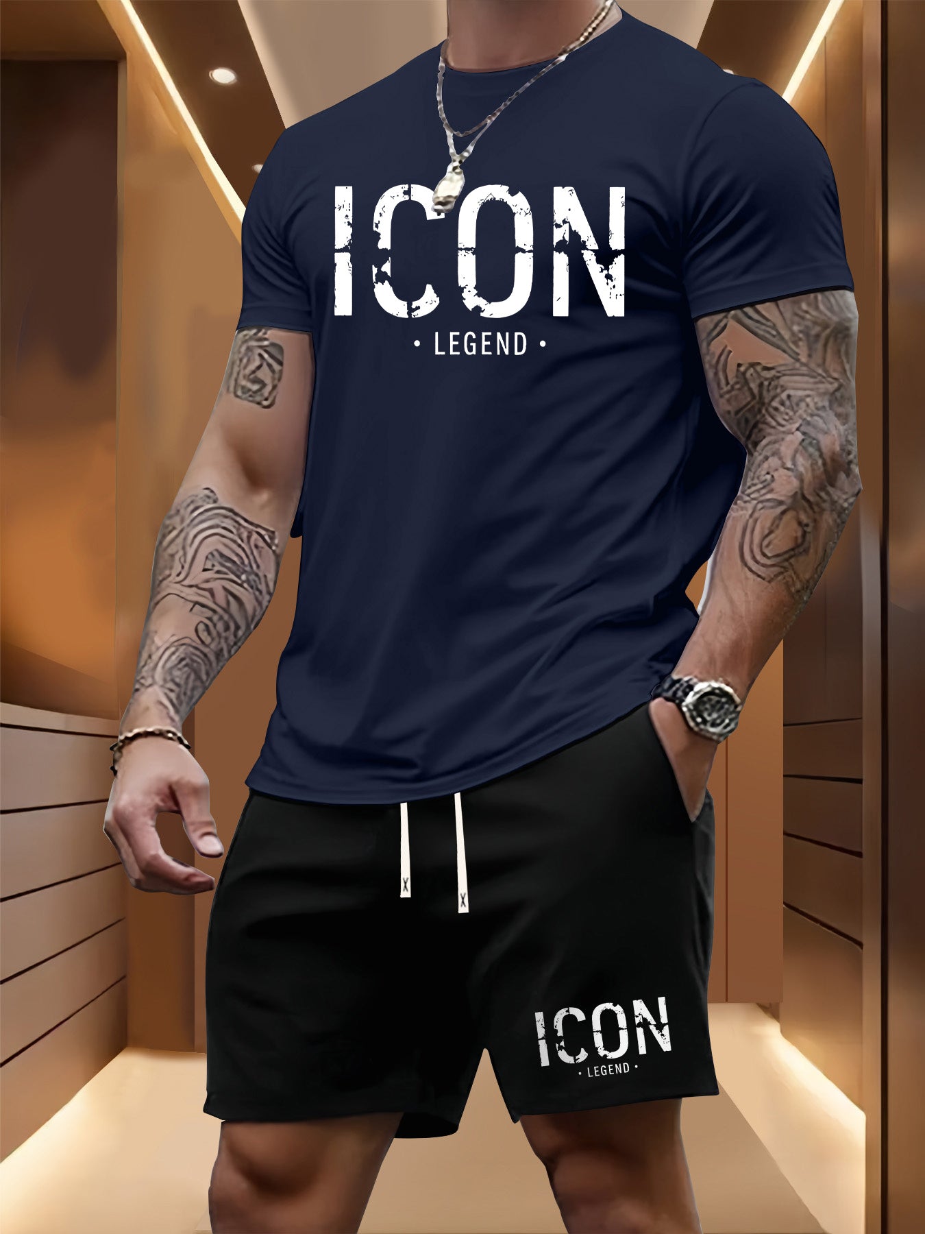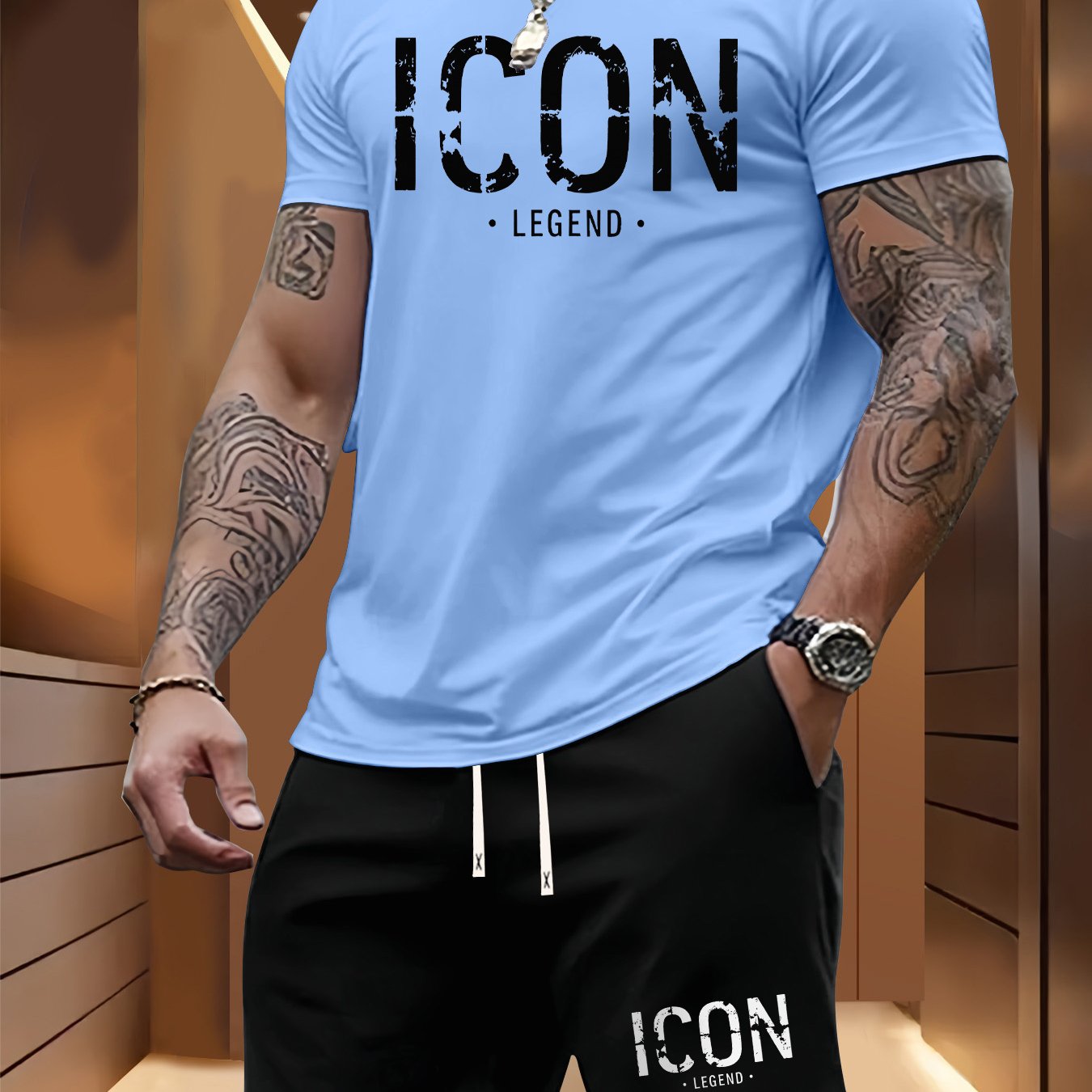 Set da due pezzi con stampa Icon Legend per l'estate - T-shirt casual a maniche corte con scollo a giro e pantaloncini con coulisse, nero e giallo, leggero misto di poliestere, perfetto per un look casual