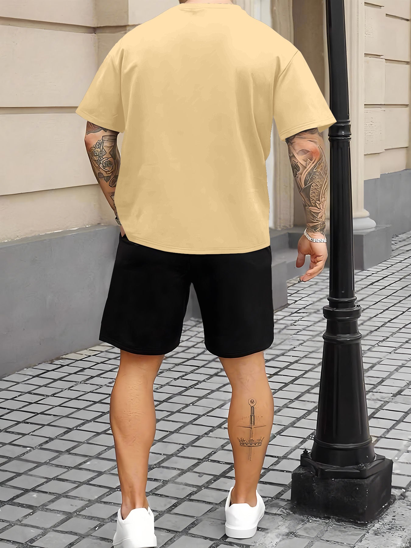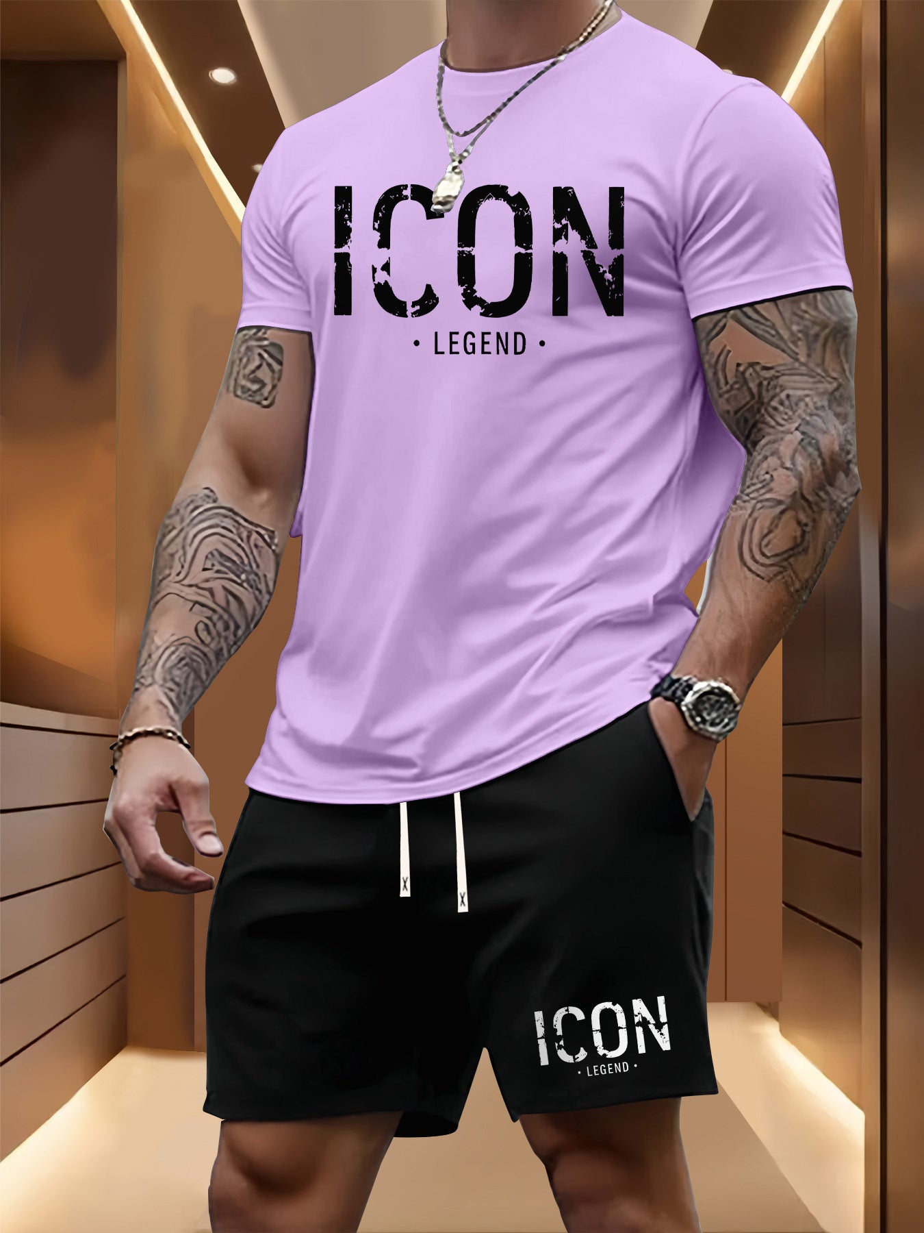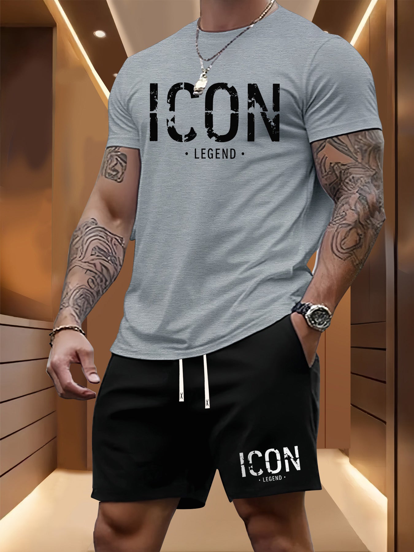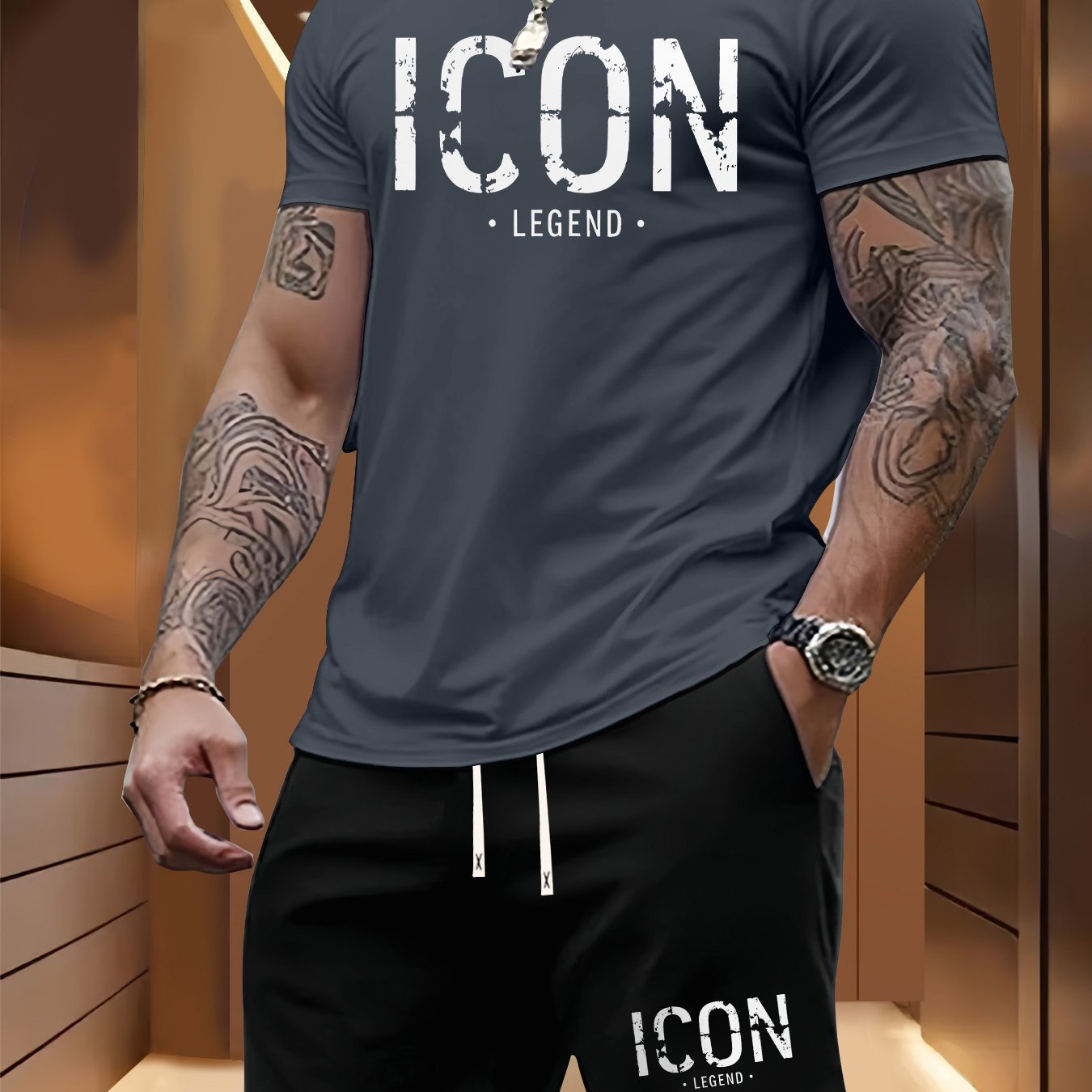 Set da due pezzi con stampa Icon Legend per l'estate - T-shirt casual a maniche corte con scollo a giro e pantaloncini con coulisse, nero e giallo, leggero misto di poliestere, perfetto per un look casual