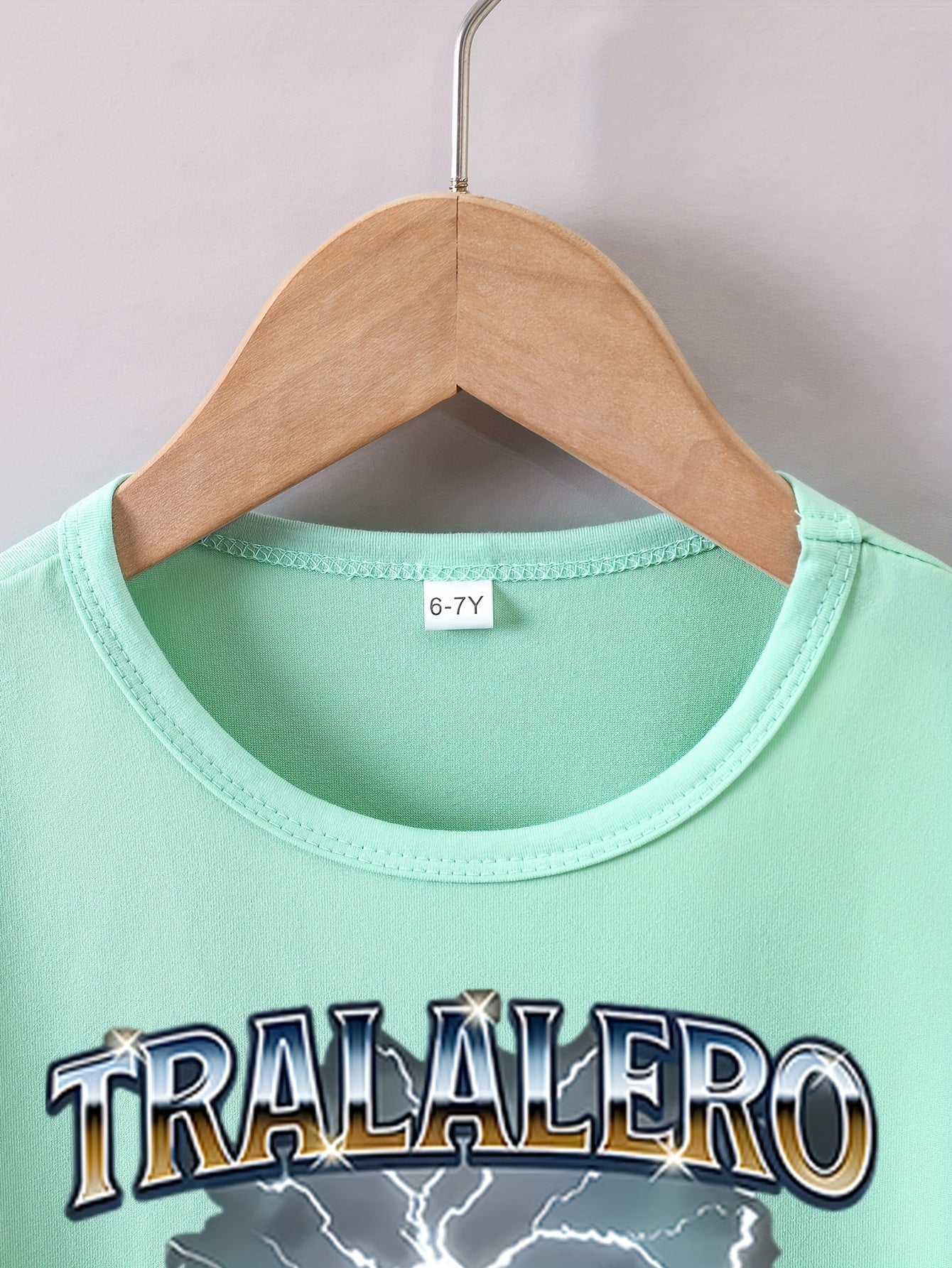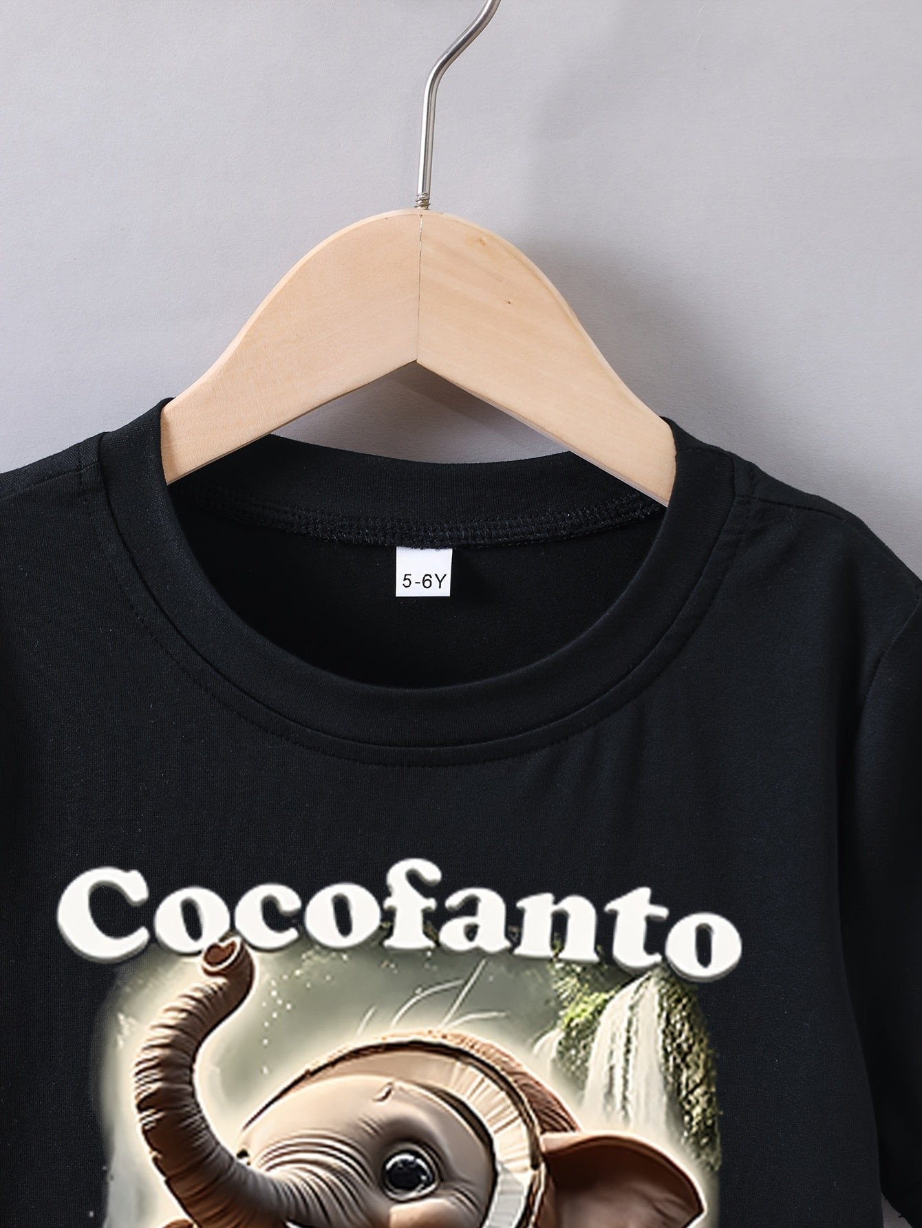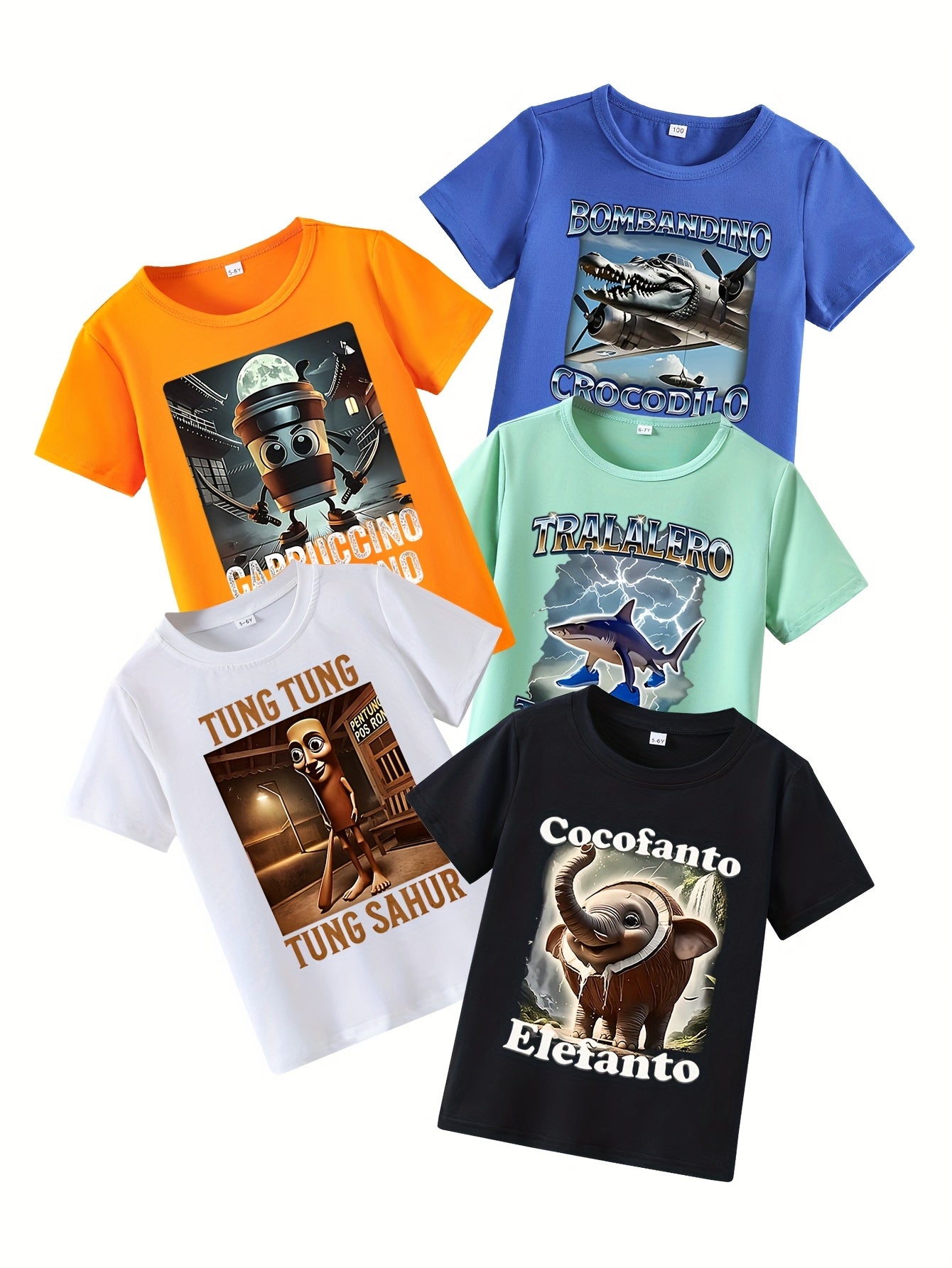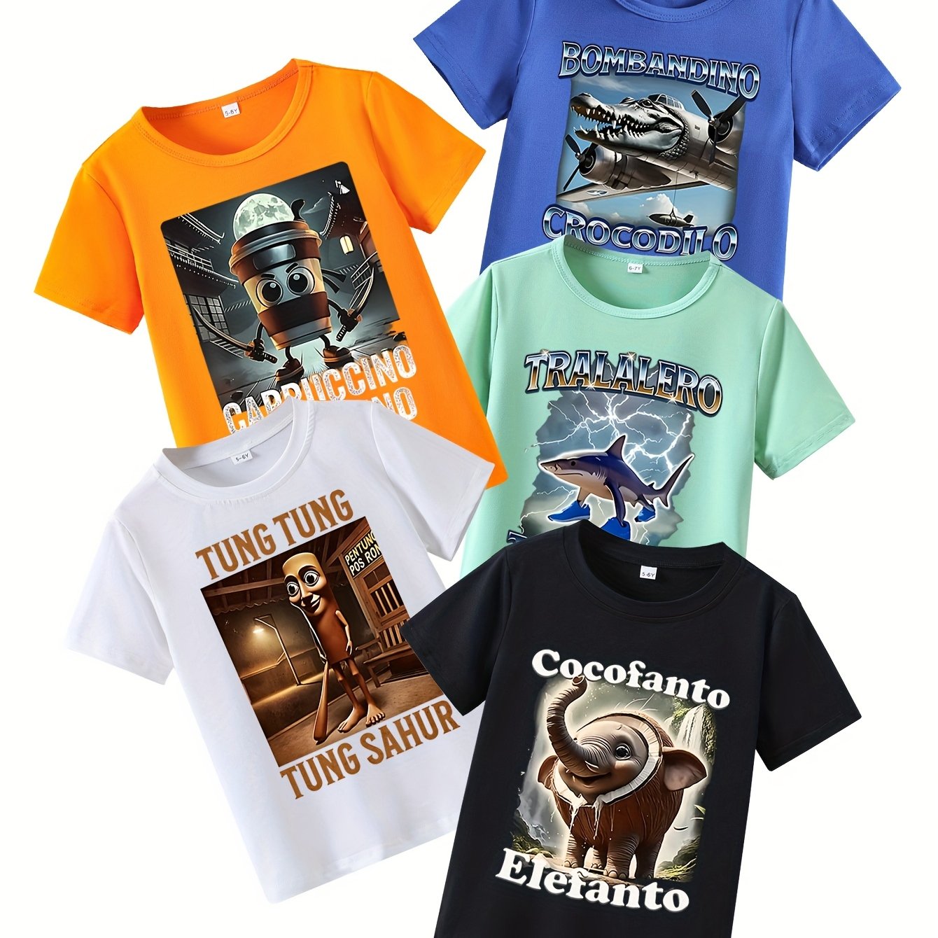 Set di 5 magliette estive a maniche corte per ragazzi con stampi di 'Coccodrillo Bomber, Cappuccino Assassin, Squalo Tralala, Dongdongdong, Elefante di Coccolata, Elemento di Rottura Cerebrale Italiano'.