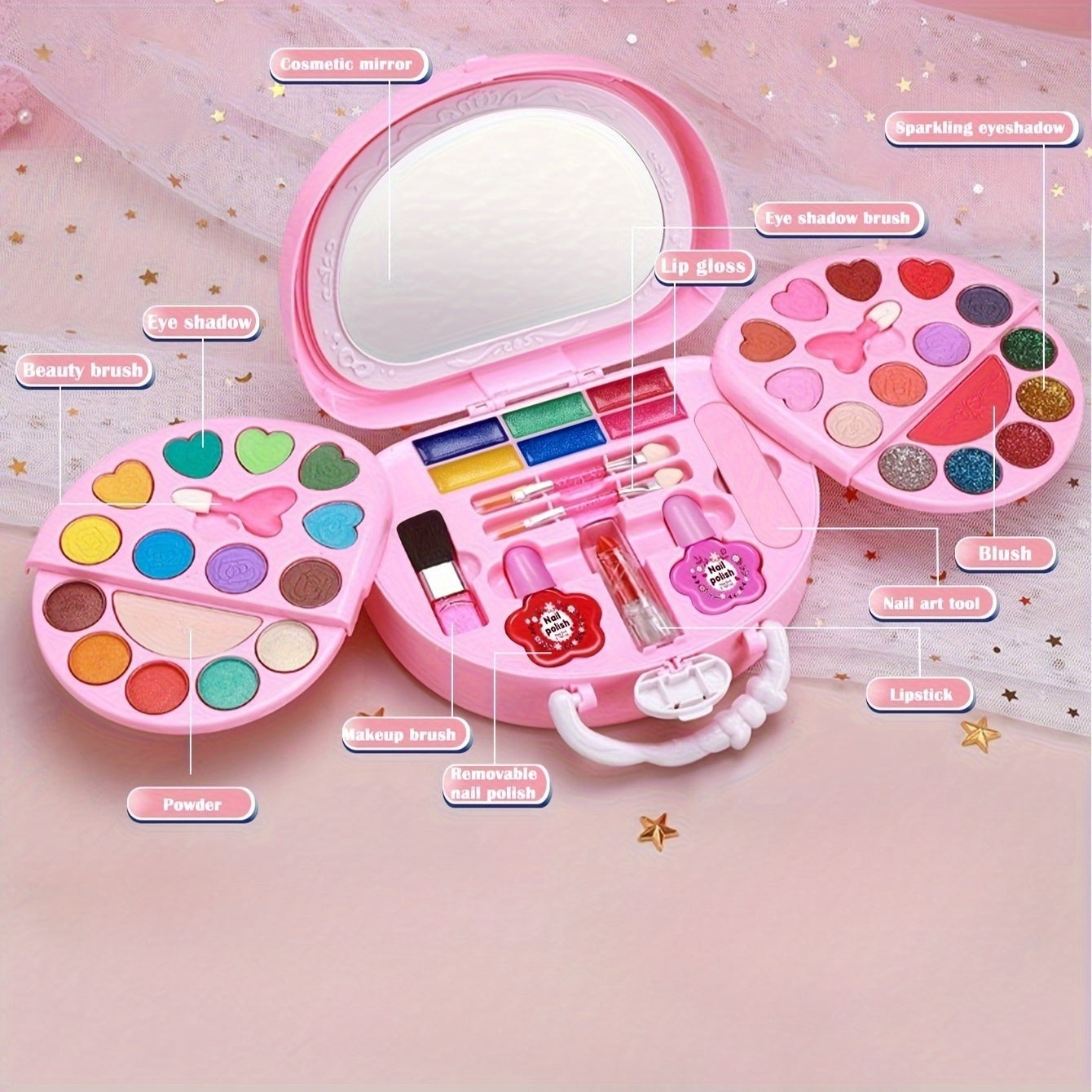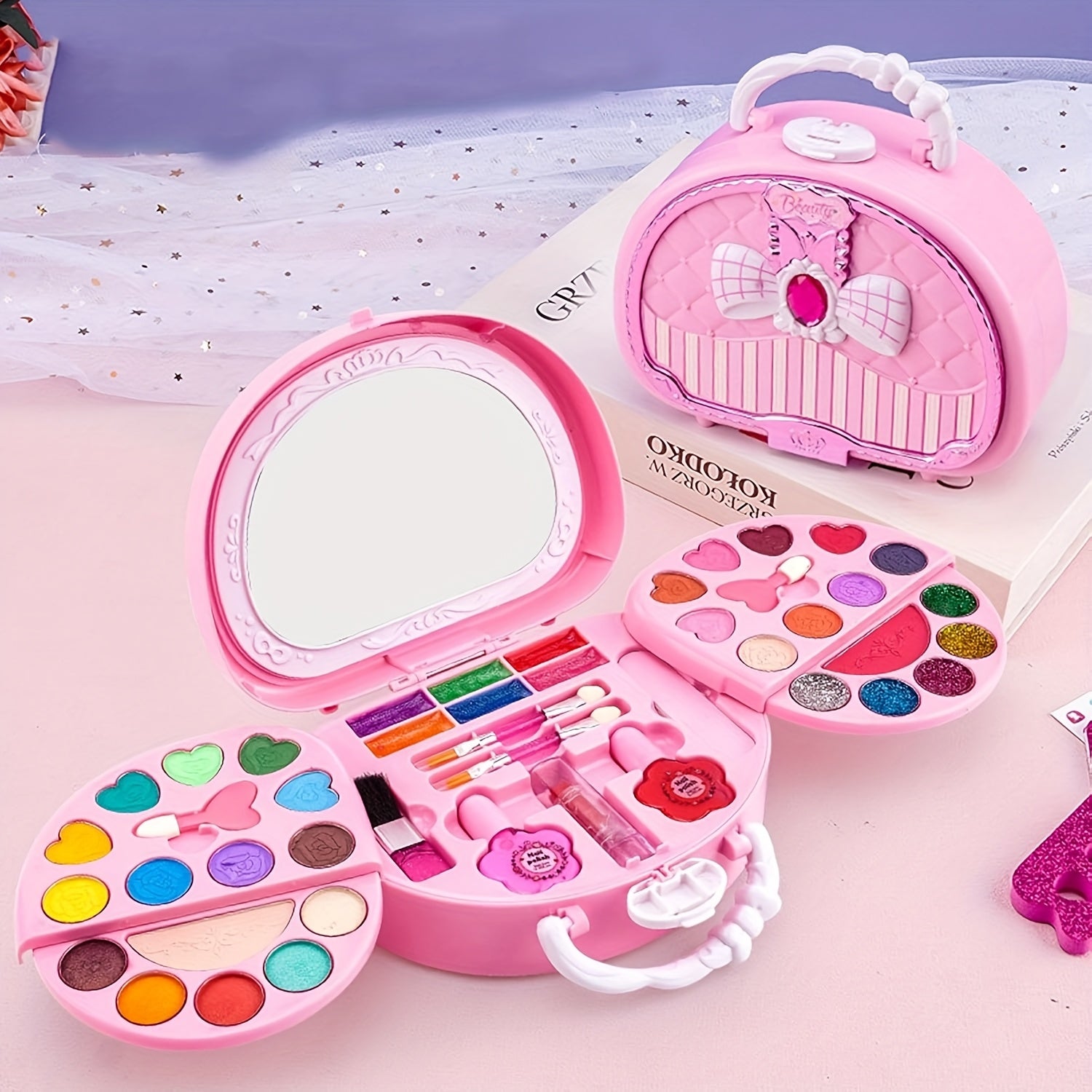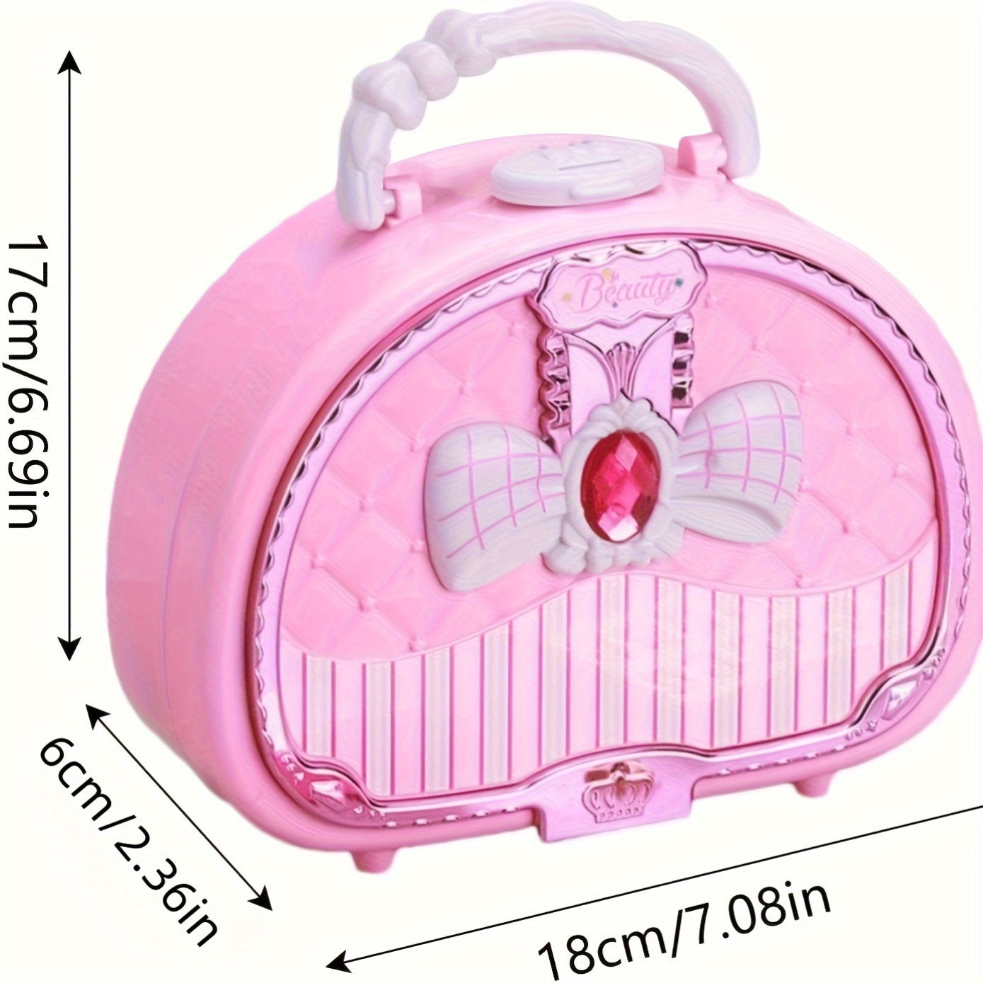 Set di giocattoli per il trucco delle ragazze - Custodia di vanità in plastica con specchio, blush, rossetti e pennelli - Regalo di compleanno per età 4-10 anni (Colori e posizionamento casuali), Design giocoso, Accenti decorativi con fiocchi