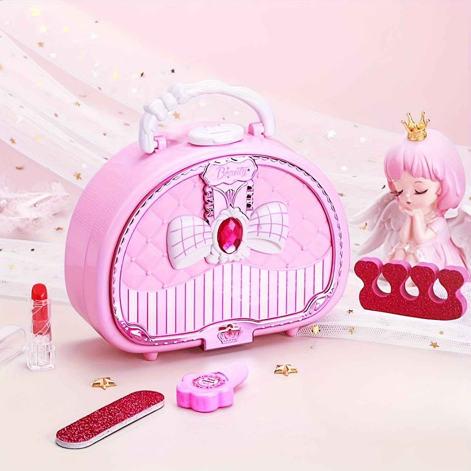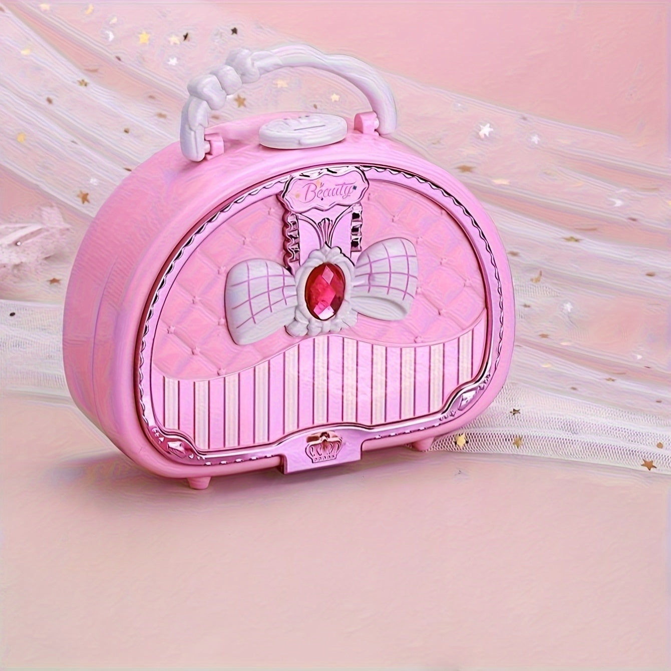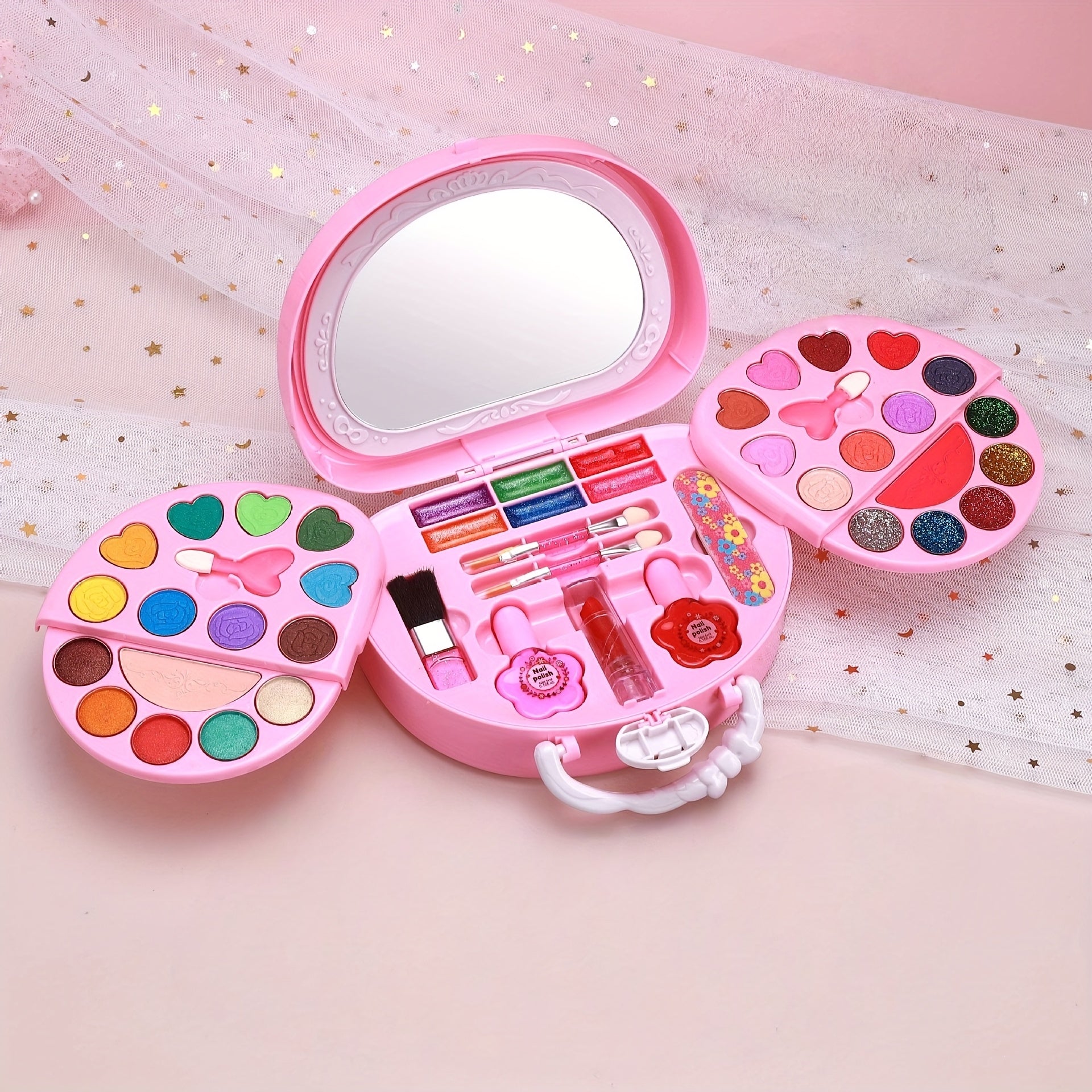 Set di giocattoli per il trucco delle ragazze - Custodia di vanità in plastica con specchio, blush, rossetti e pennelli - Regalo di compleanno per età 4-10 anni (Colori e posizionamento casuali), Design giocoso, Accenti decorativi con fiocchi