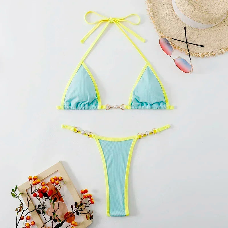 Sexy Halter Triangle Micro Thong Bikinis Sets Women Swimwear Pearl Chain Swimsuits Bathing Suit Mini Biquinis Patchwork Bikini