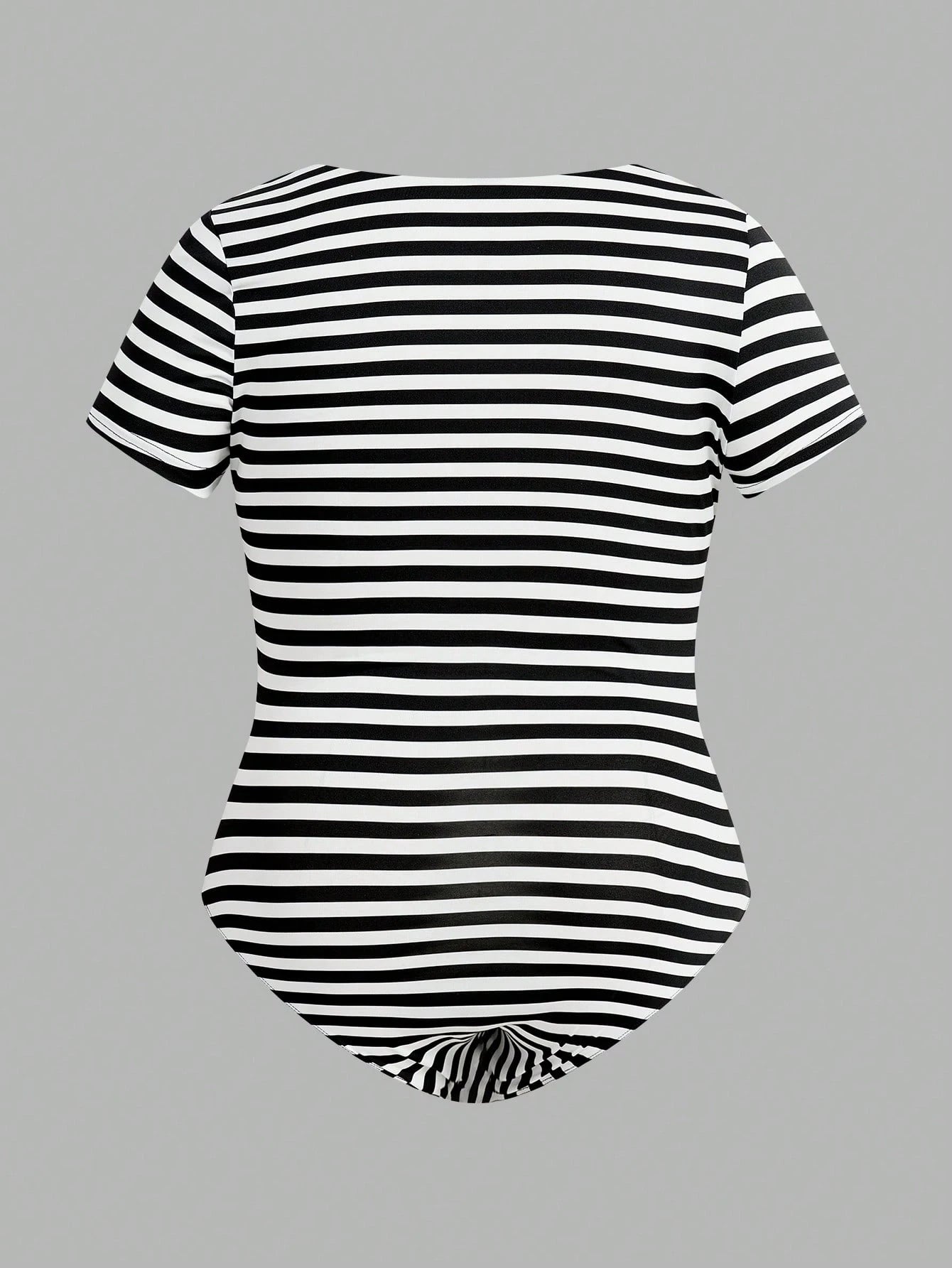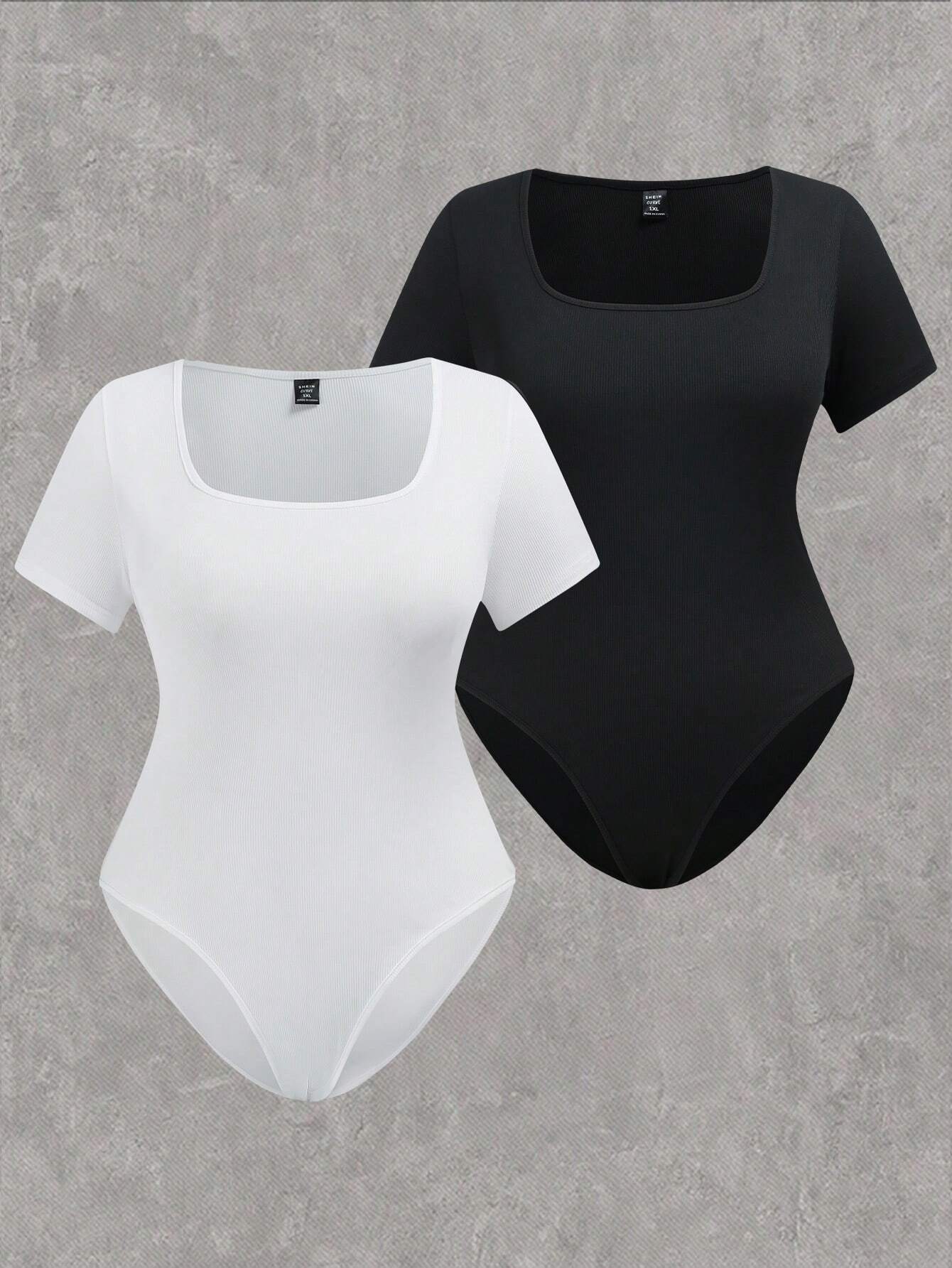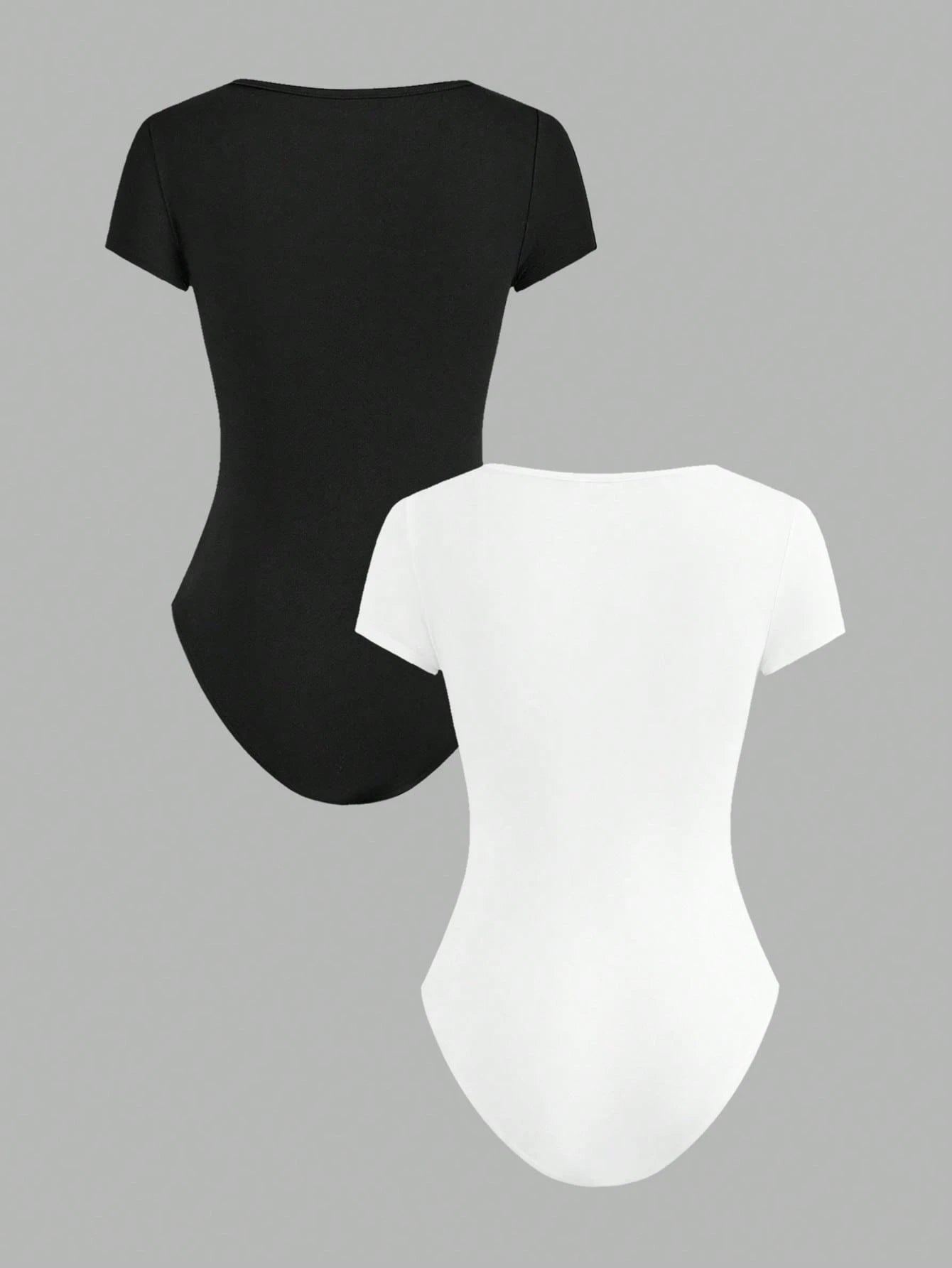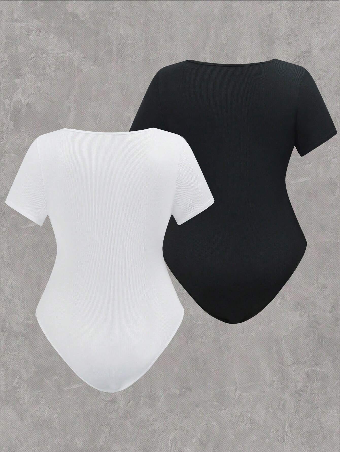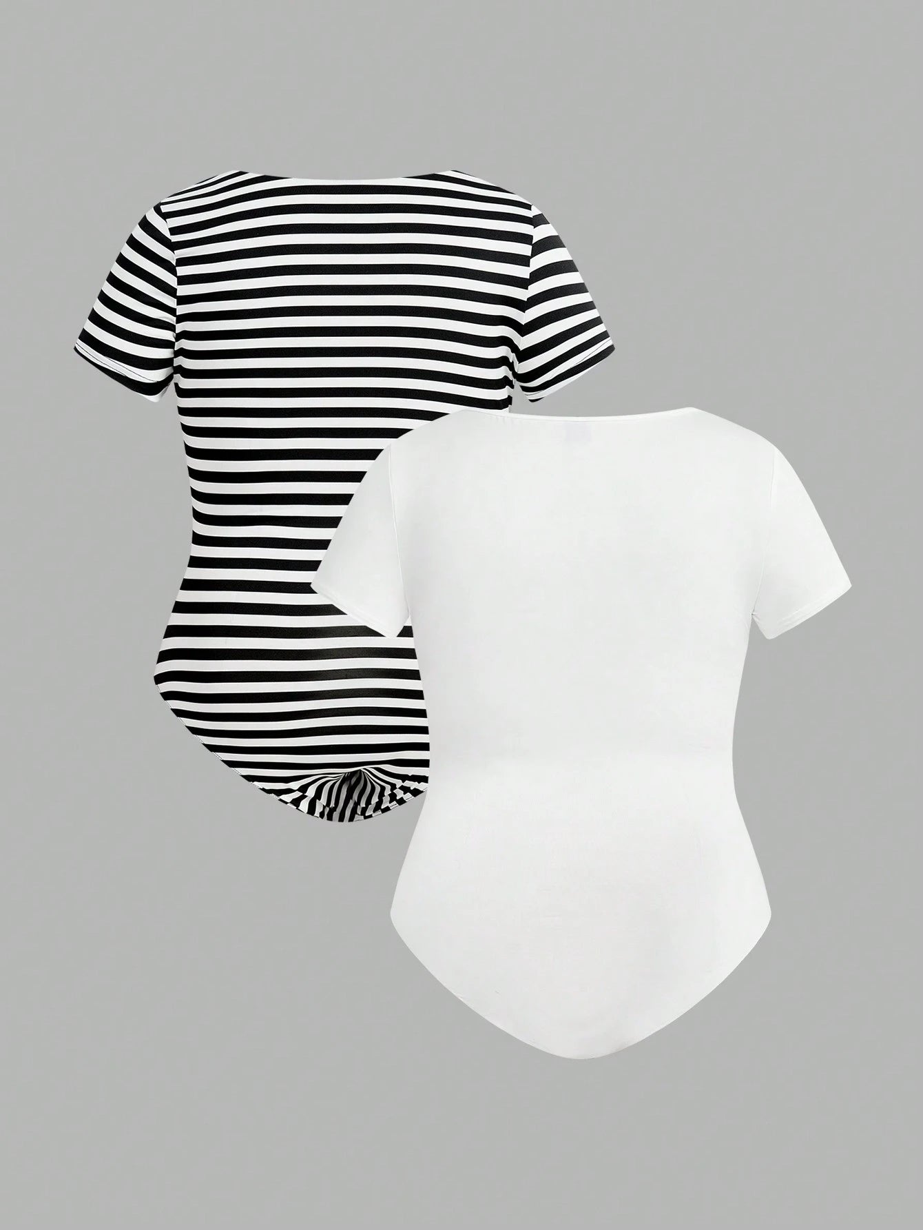 EZwear 2pcs/Set Plus Size Black & White Short Sleeve Bodysuit