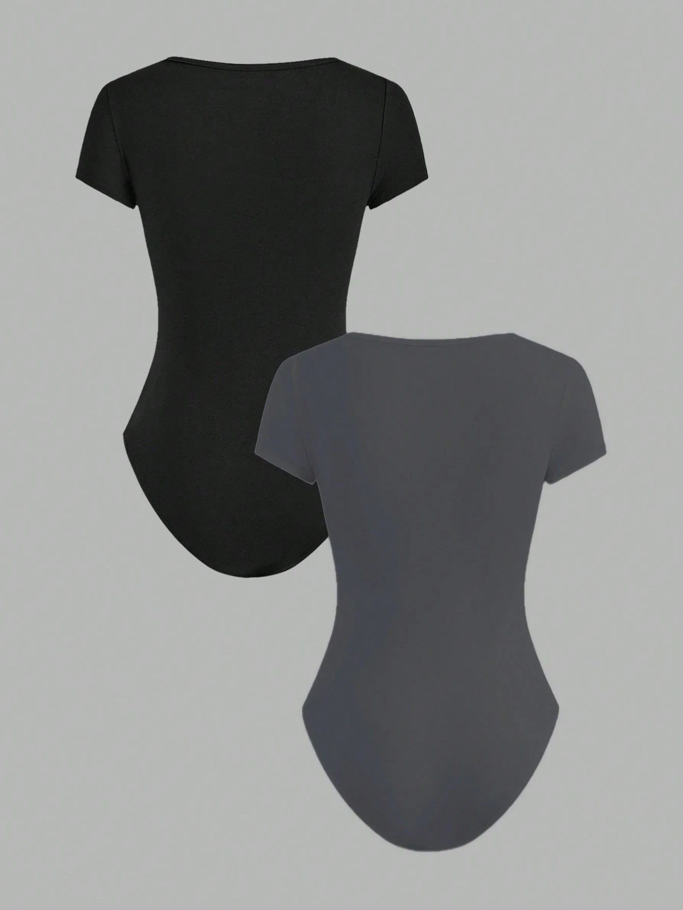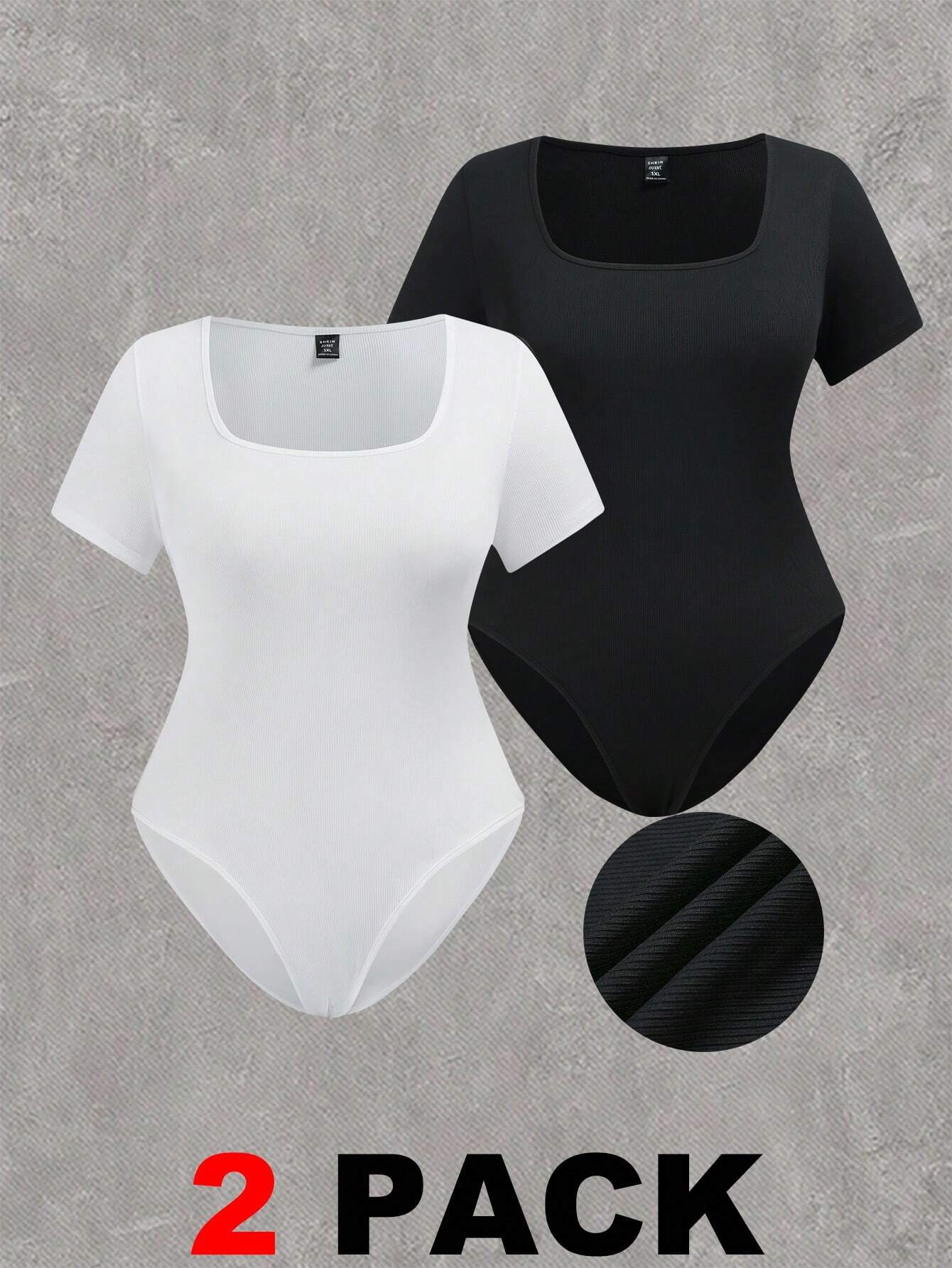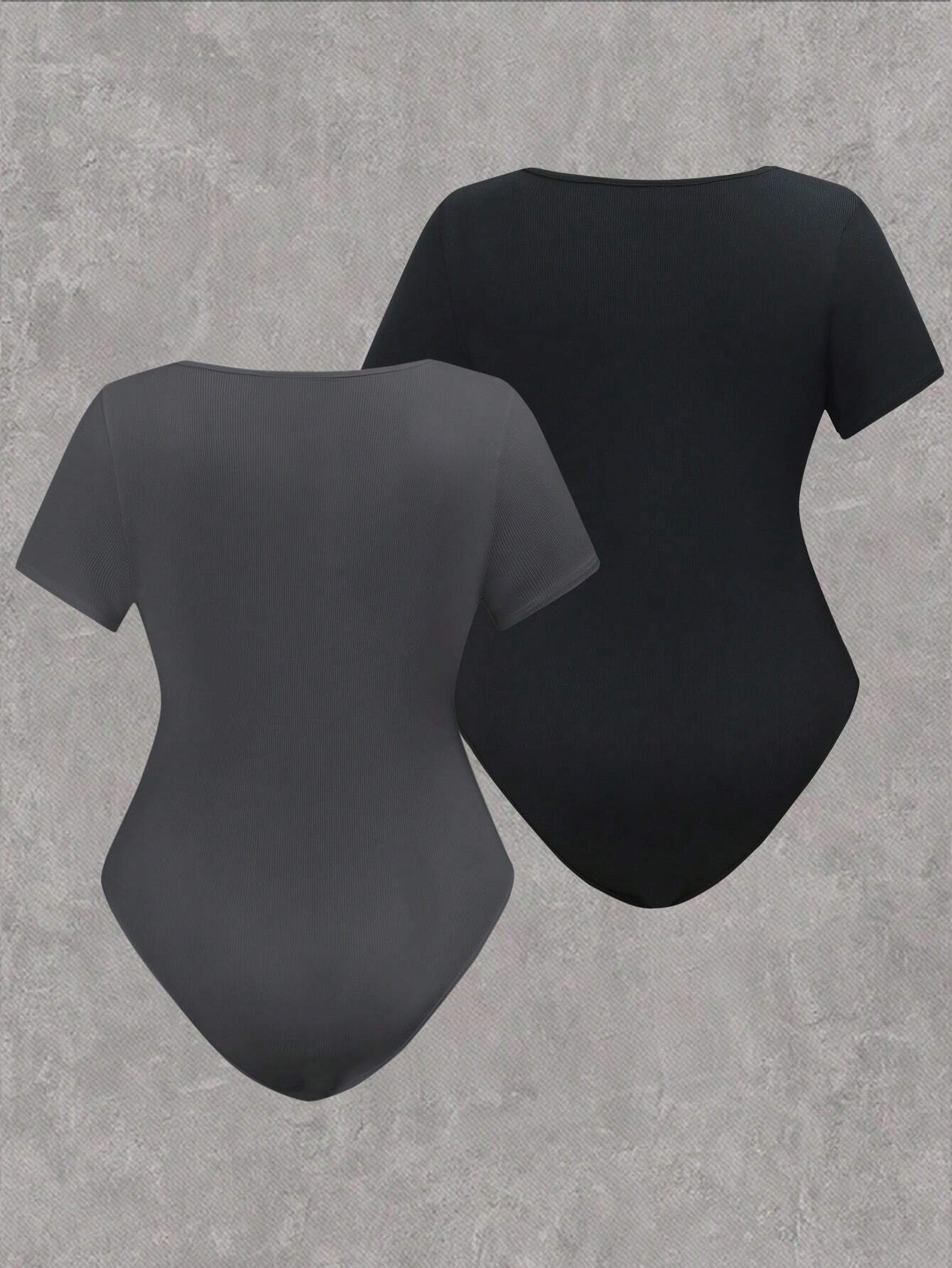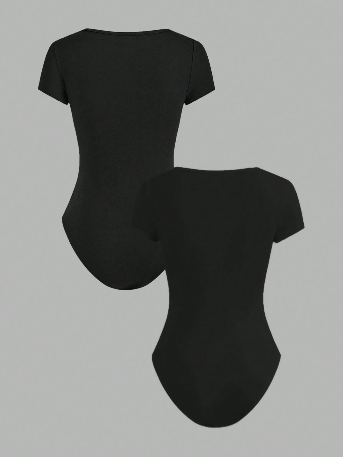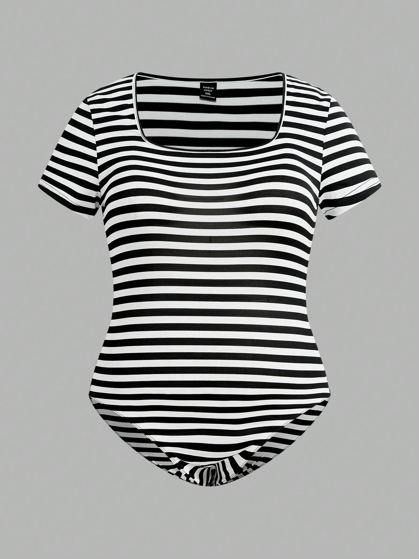EZwear 2pcs/Set Plus Size Black & White Short Sleeve Bodysuit