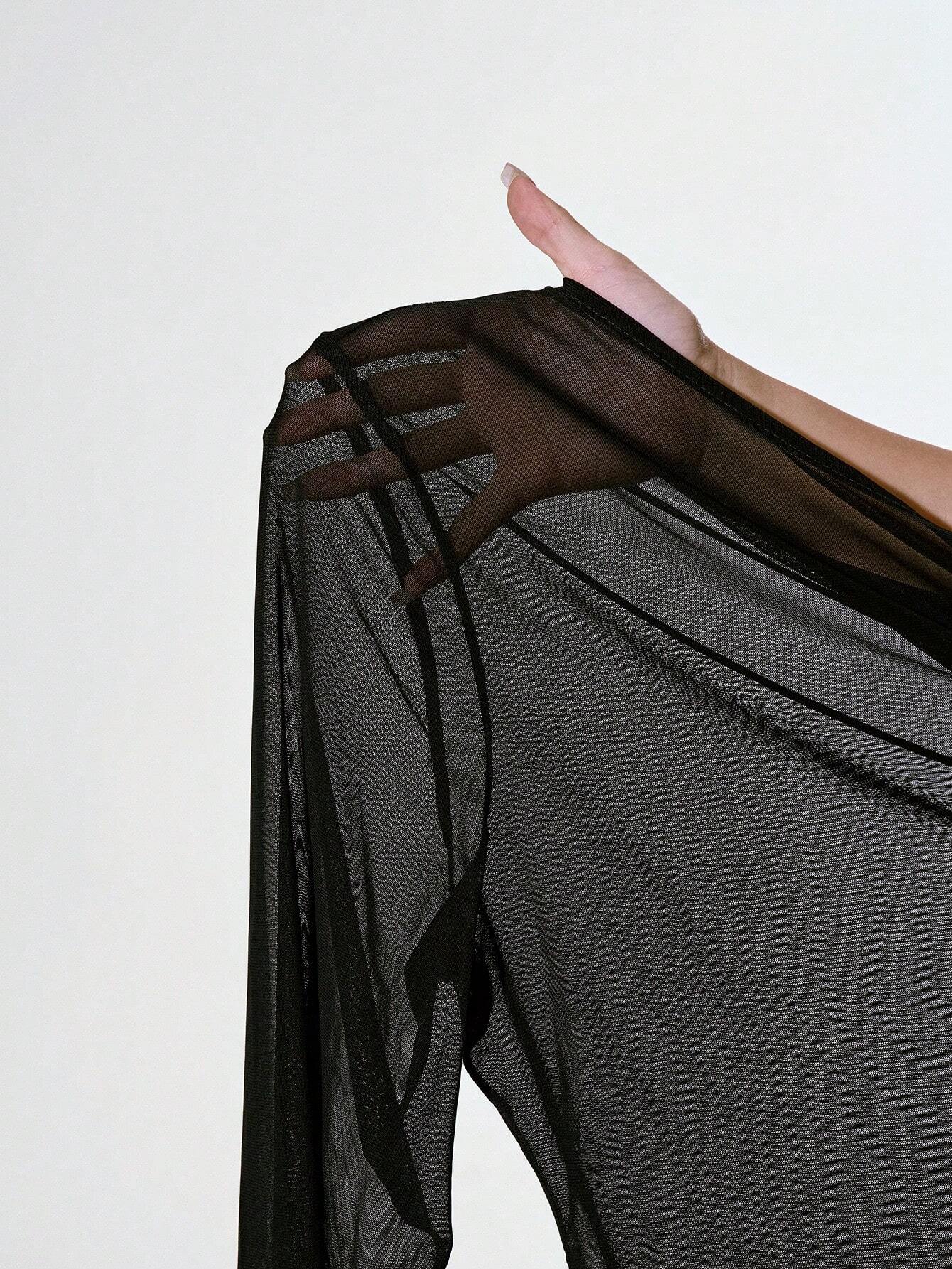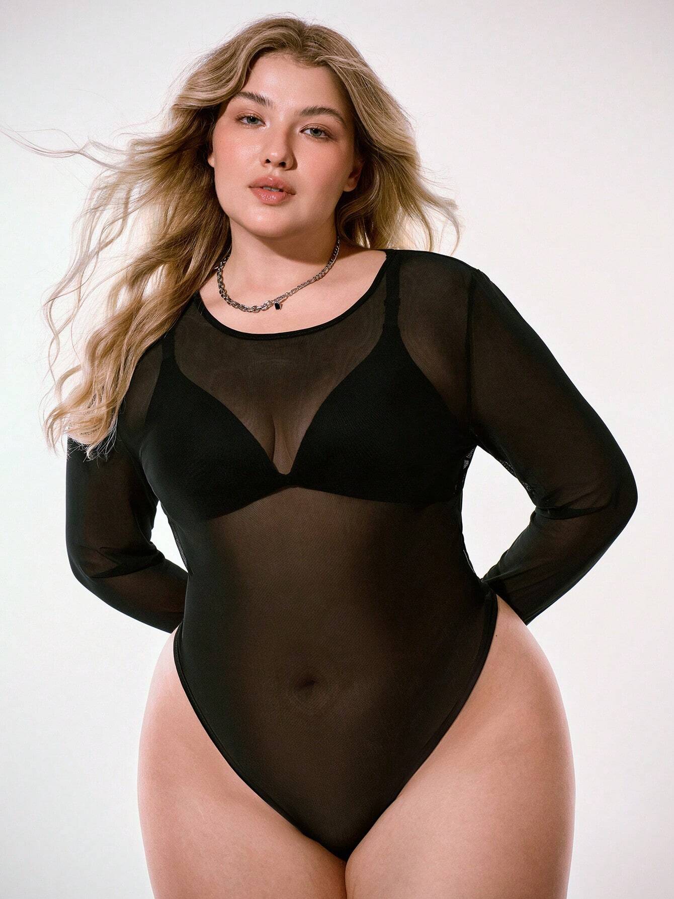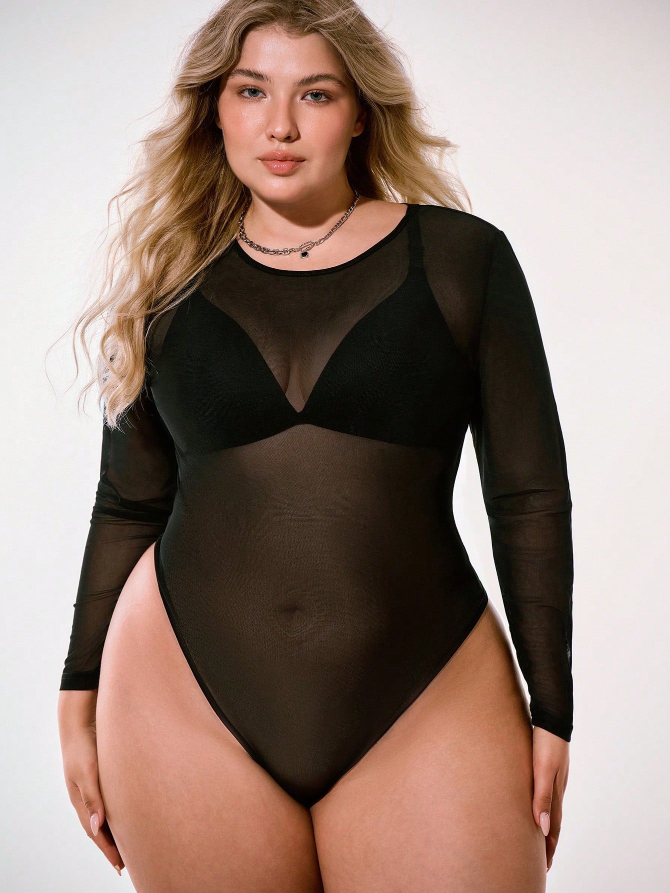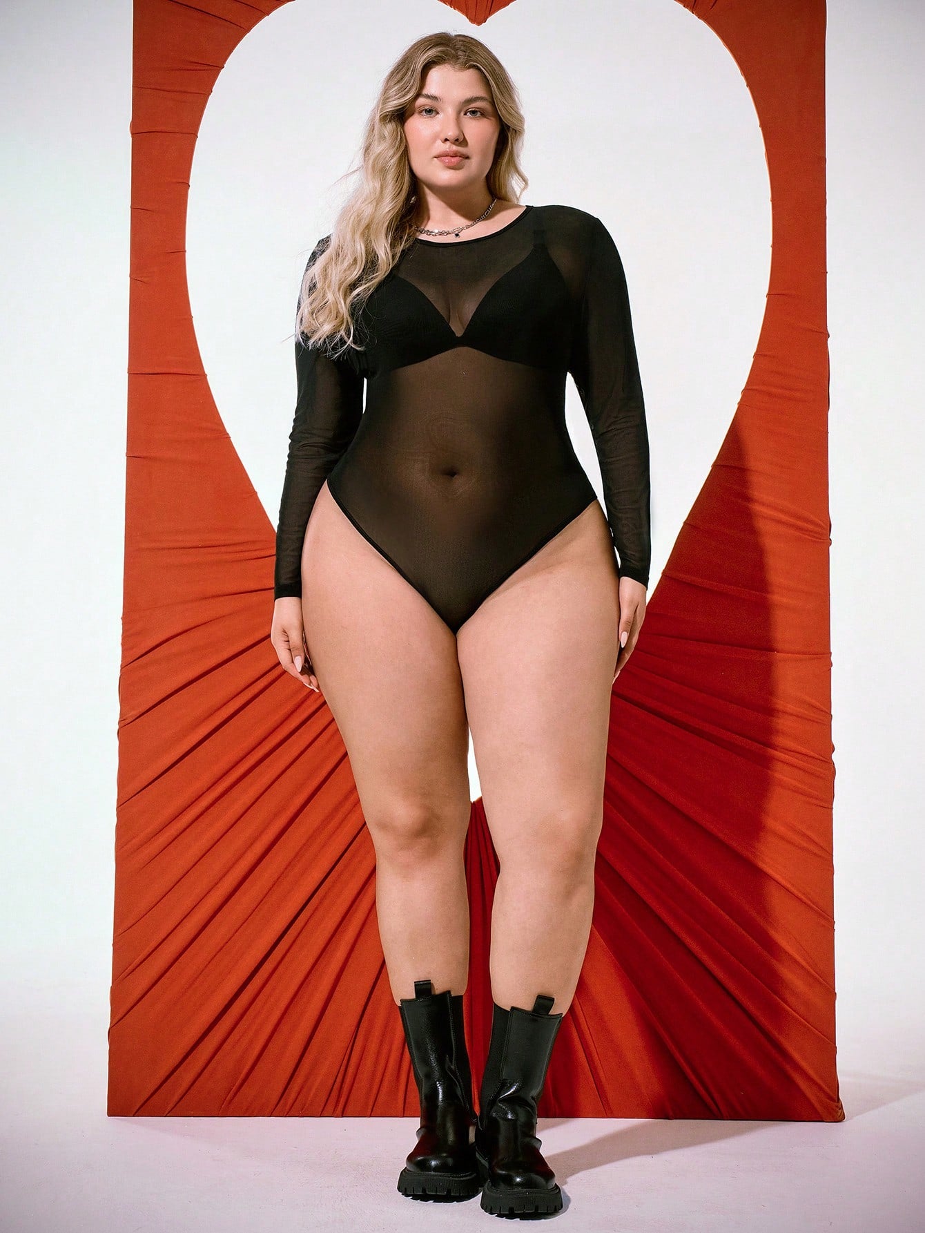 Plus Size Sexy Mesh Sheer Long Sleeve Black Bodysuit