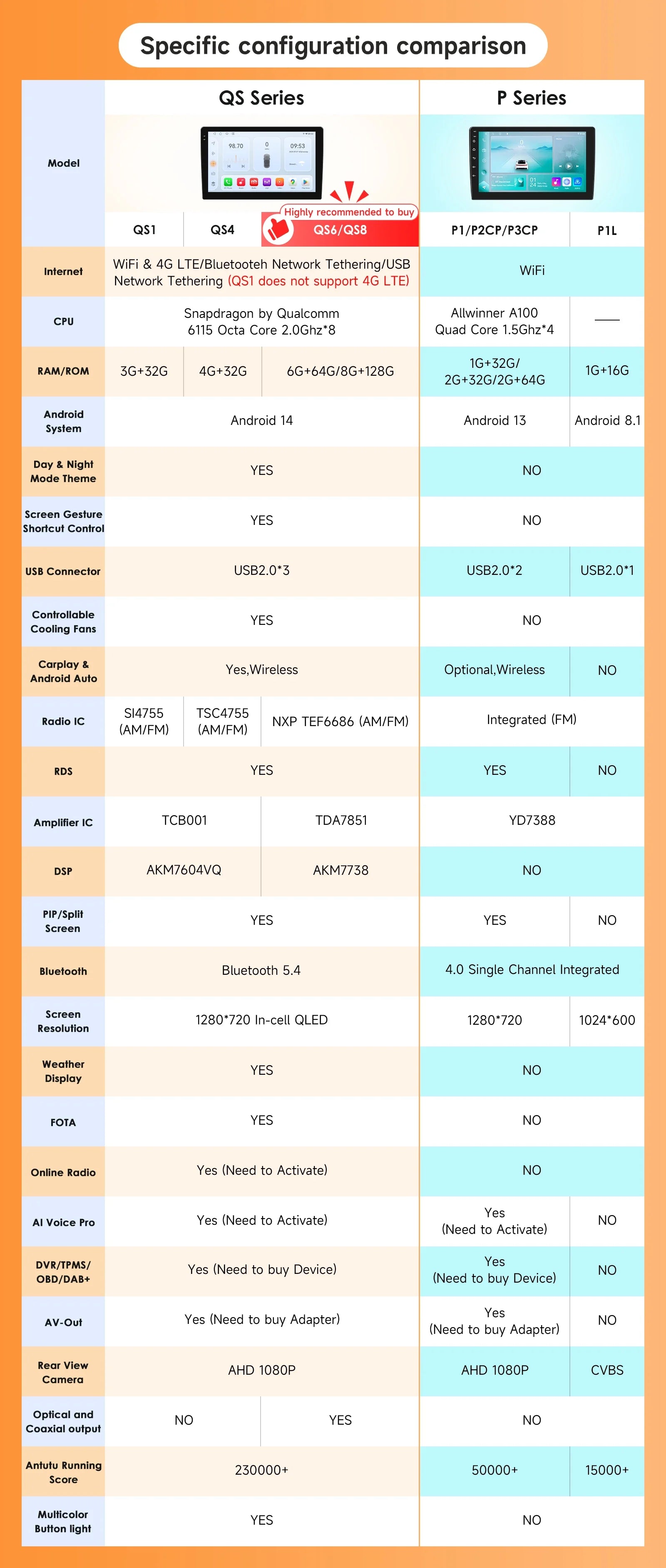 2) Built-in Carplay/ Android Auto: P2-CP/P3-CP/W1/QS1/QS4/QS6/QS8 version supporting, just use your phone cable connect it, stable and easy to use;