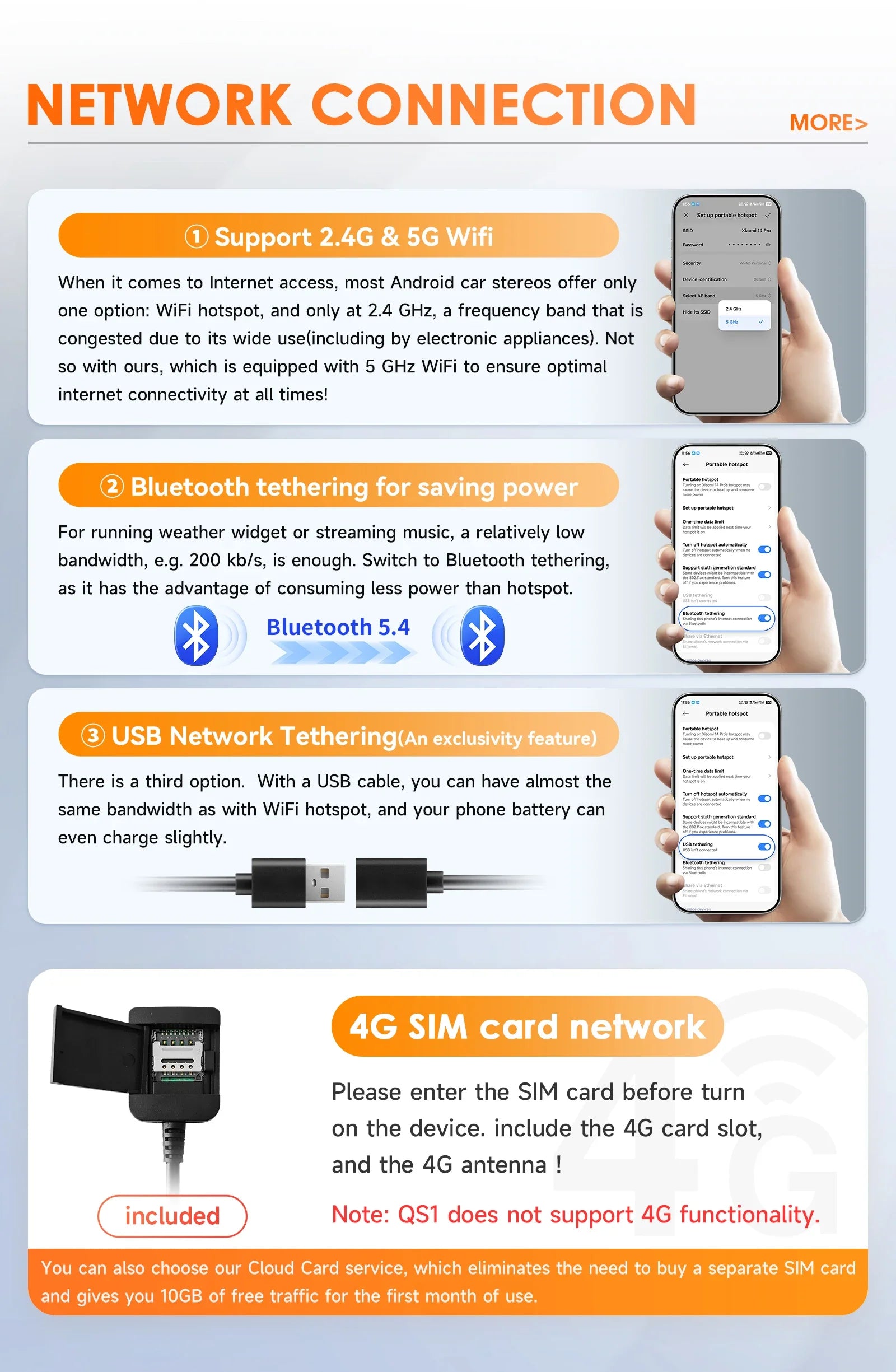 ① Support 2.4G & 5G WifiWhen it comes to lnternet access,most Android car stereos offer only one option: WiFi hotspot,and only at 2.4 GHz, a frequency band that is congested due to its wide use(including by electronic appliances). Not so with ours, which is equipped with 5 GHz WiFi to ensure optimal internet connectivity at all times!