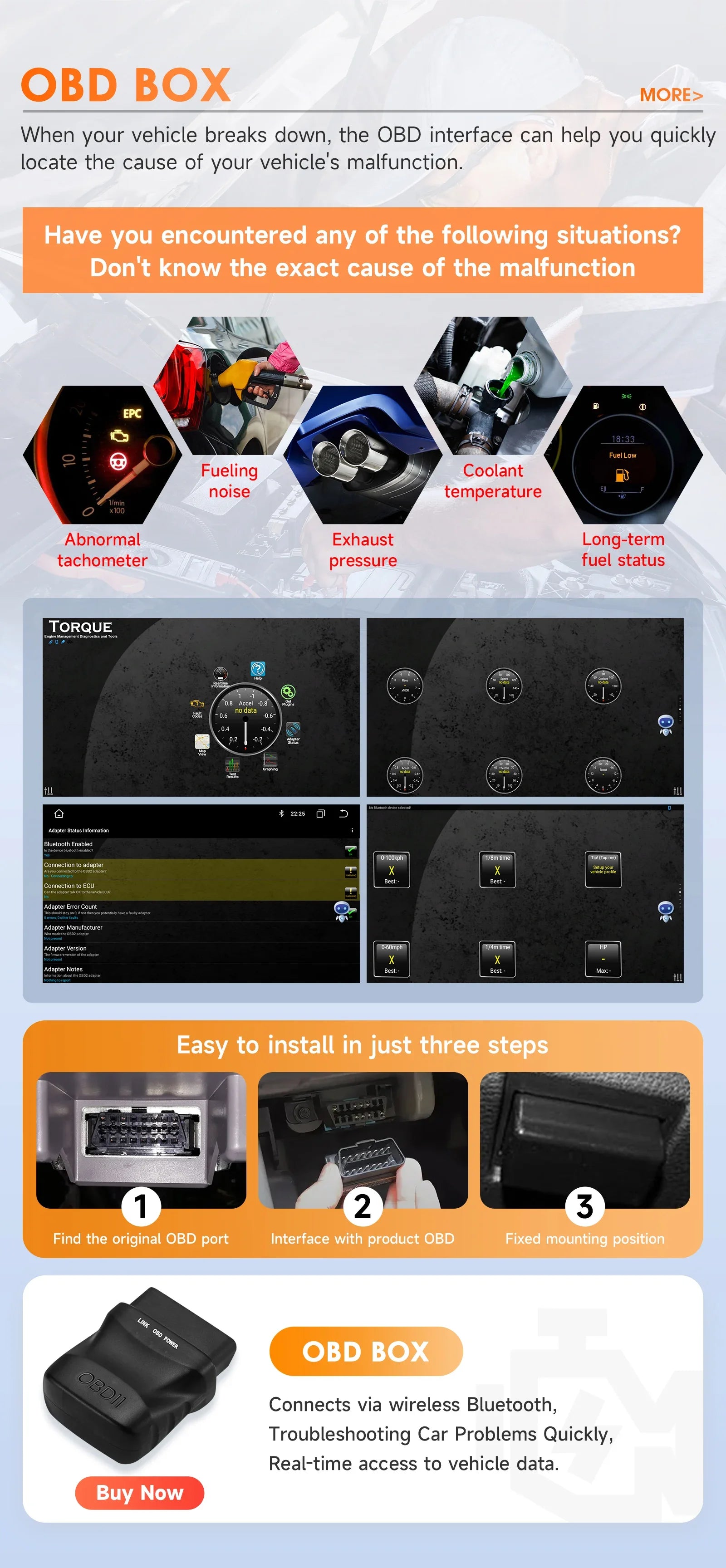 When your vehicle breaks down,the OBD interface can help you quickly locate the cause of your vehicle's malfunction.