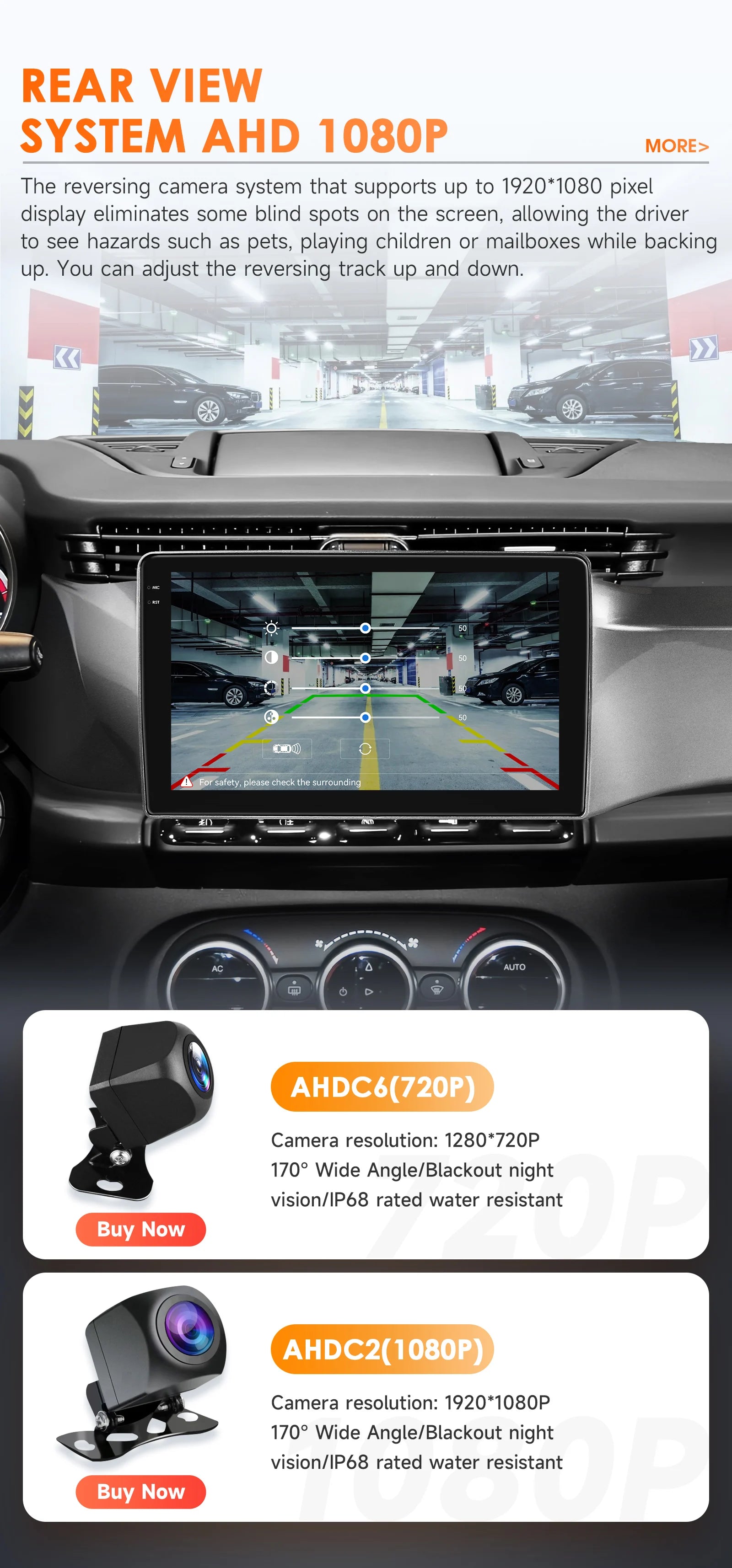 The reversing camera system that supports up to 1920*1080 pixel display eliminates some blind spots on the screen,allowing the driver to see hazards such as pets,playing children or mailboxes while backing up. You can adjust the reversing track up and down.