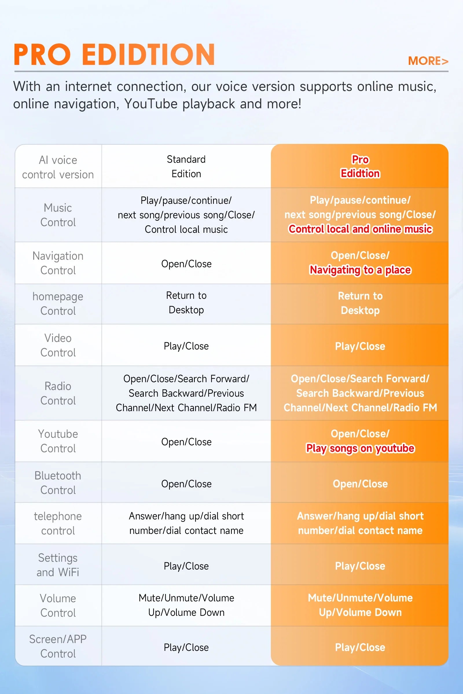 With an internet connection,our voice version supports online music,online navigation,YouTube playback and more!