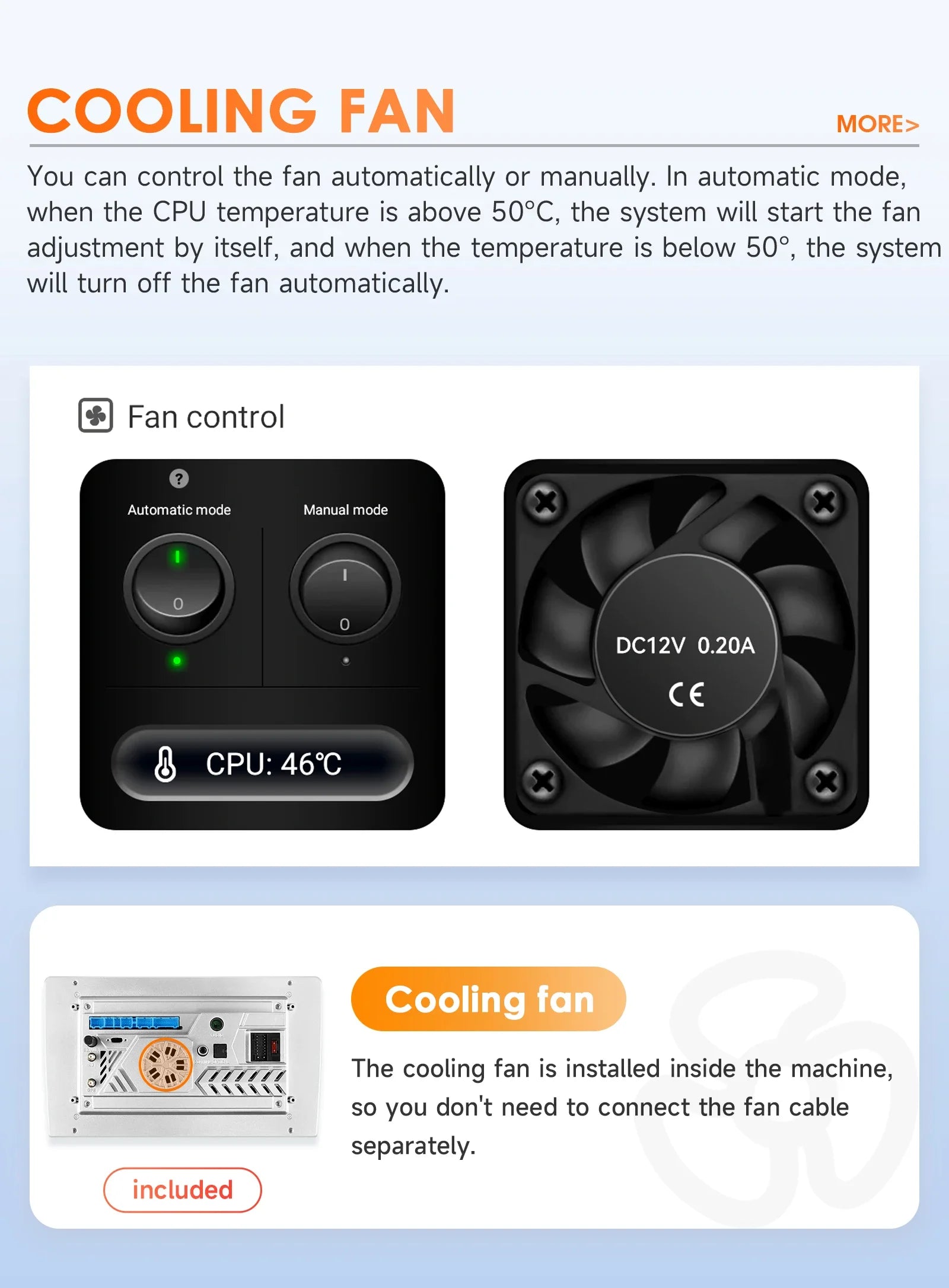 You can control the fan automatically or manually. In automatic mode,when the CPU temperature is above 50℃, the system will start the fan adjustment by itself,and when the temperature is below 50°, the system will turn off the fan automatically. Rear View System and 1080P