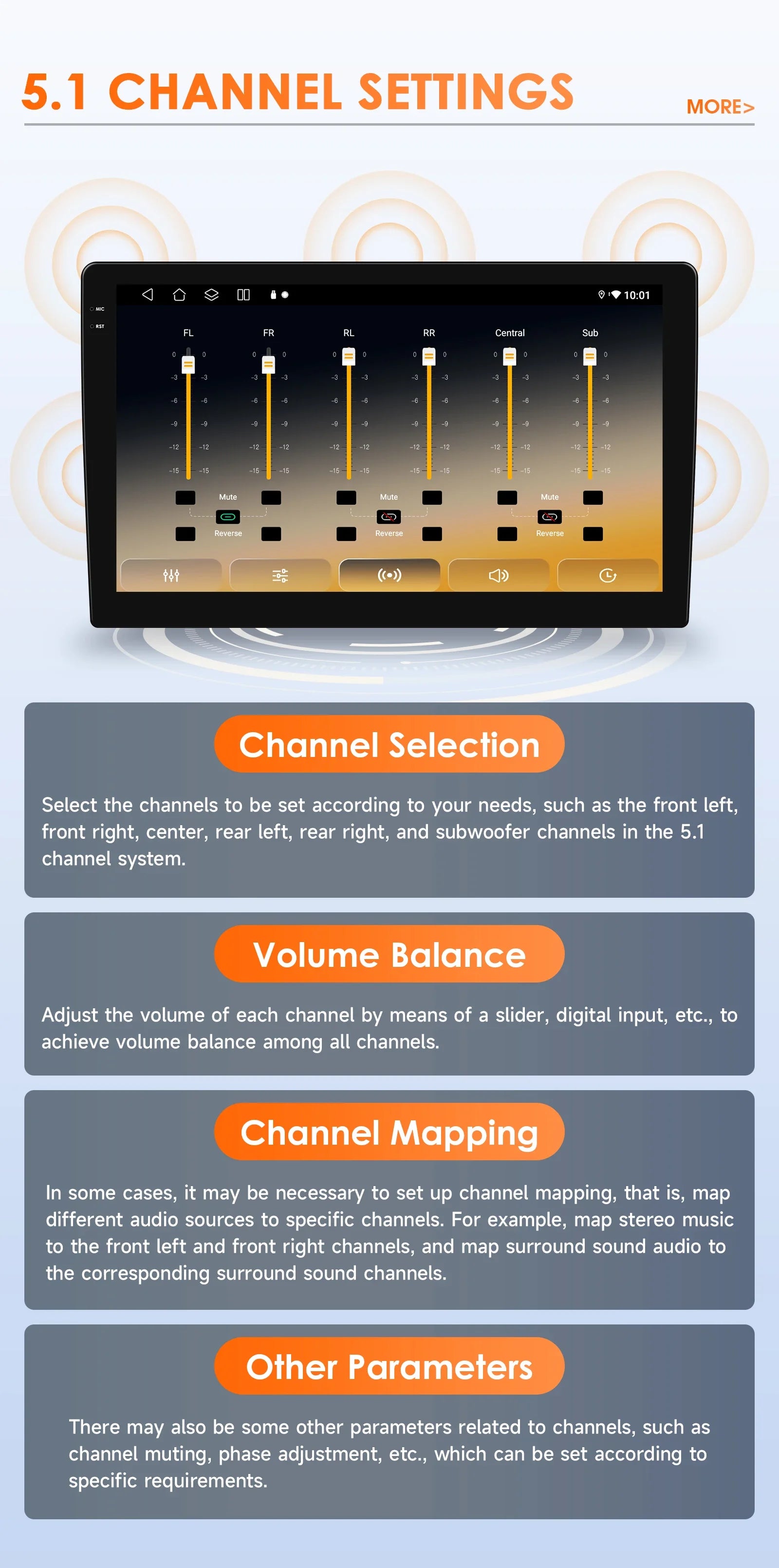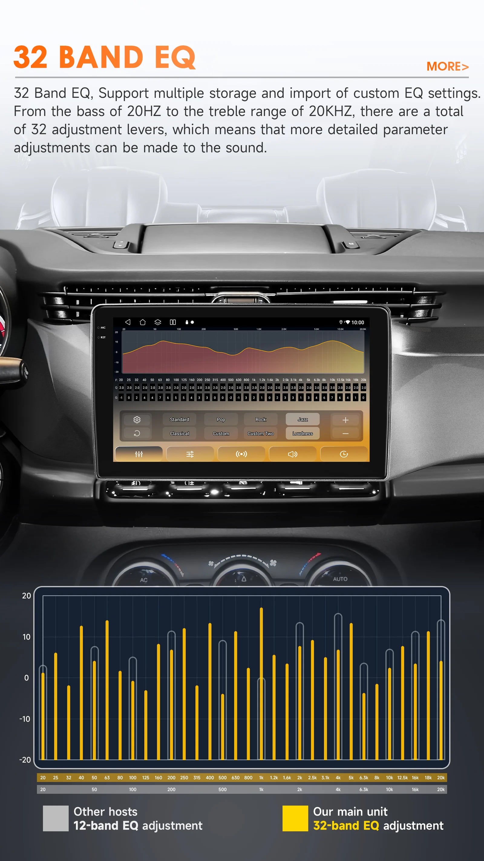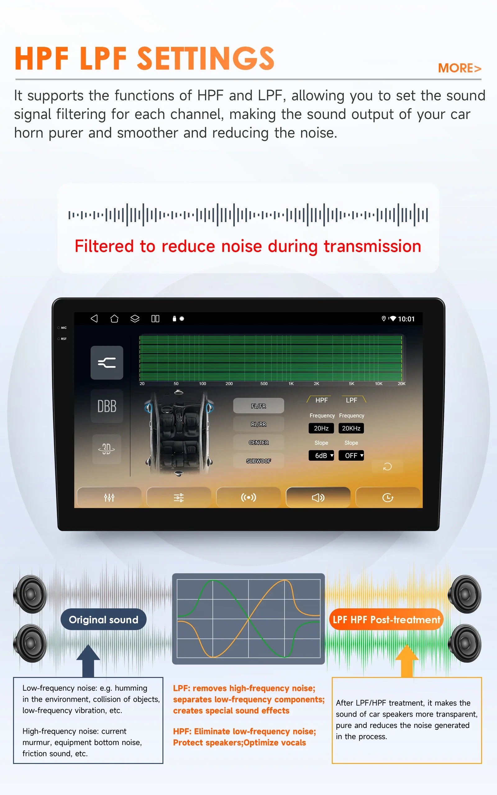 32 Band EQ,Support multiple storage and import of custom EQ settings.From the bass of 20HZ to the treble range of 20KHZ, there are a total of 32 adjustment levers, which means that more detailed parameter adjustments can be made to the sound. 5.1 Channel Settings HPF LPF Settings