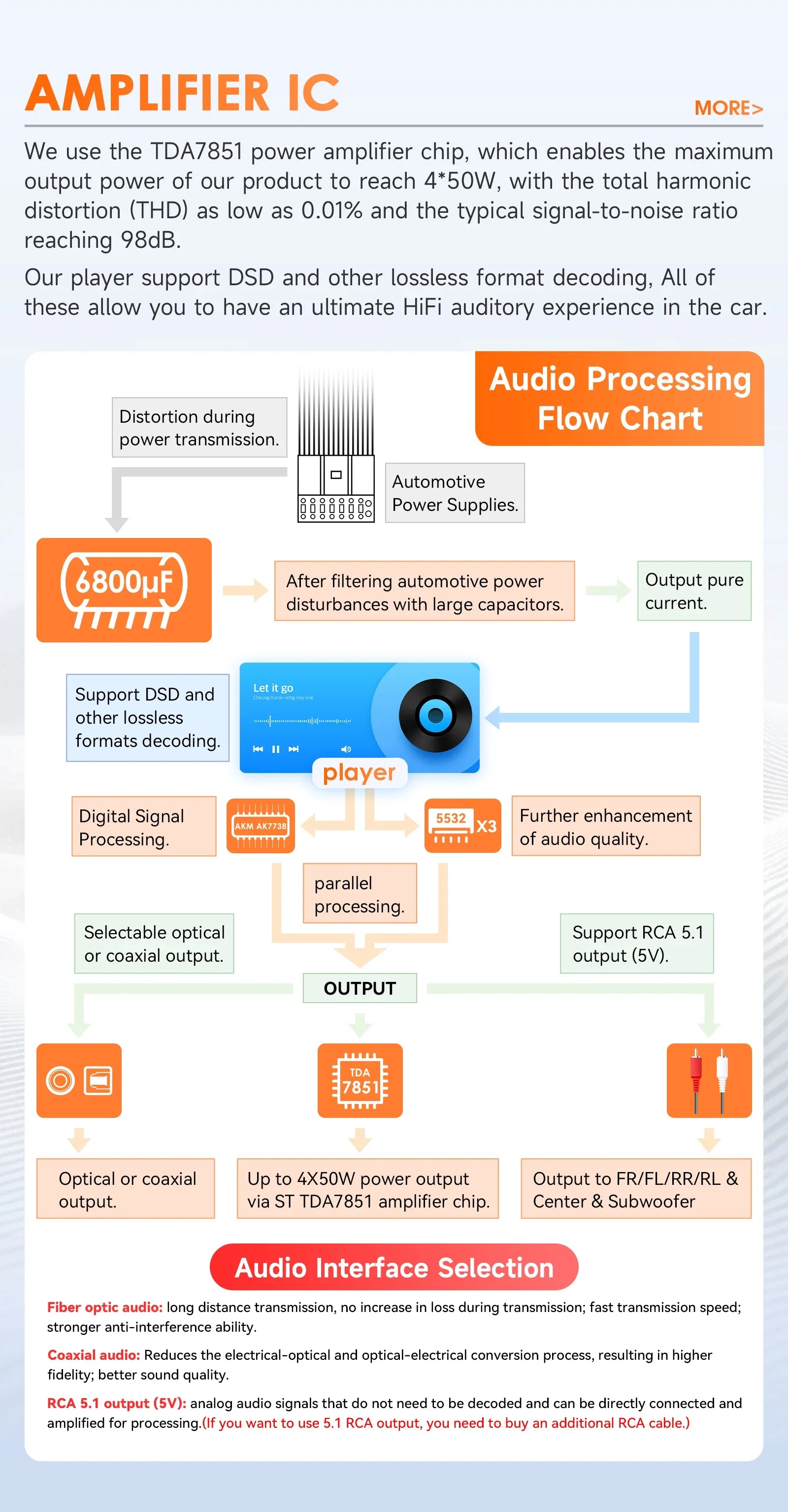 We use the TDA7851 power amplifier chip, which enables the maximum output power of our product to reach 4*50W, with the total harmonic distortion (THD) as low as 0.01% and the typical signal-to-noise ratioreaching 98dB.Our player support DSD and other lossless format decoding,All of these allow you to have an ultimate HiFi auditory experience in the car. Optical/Coaxial