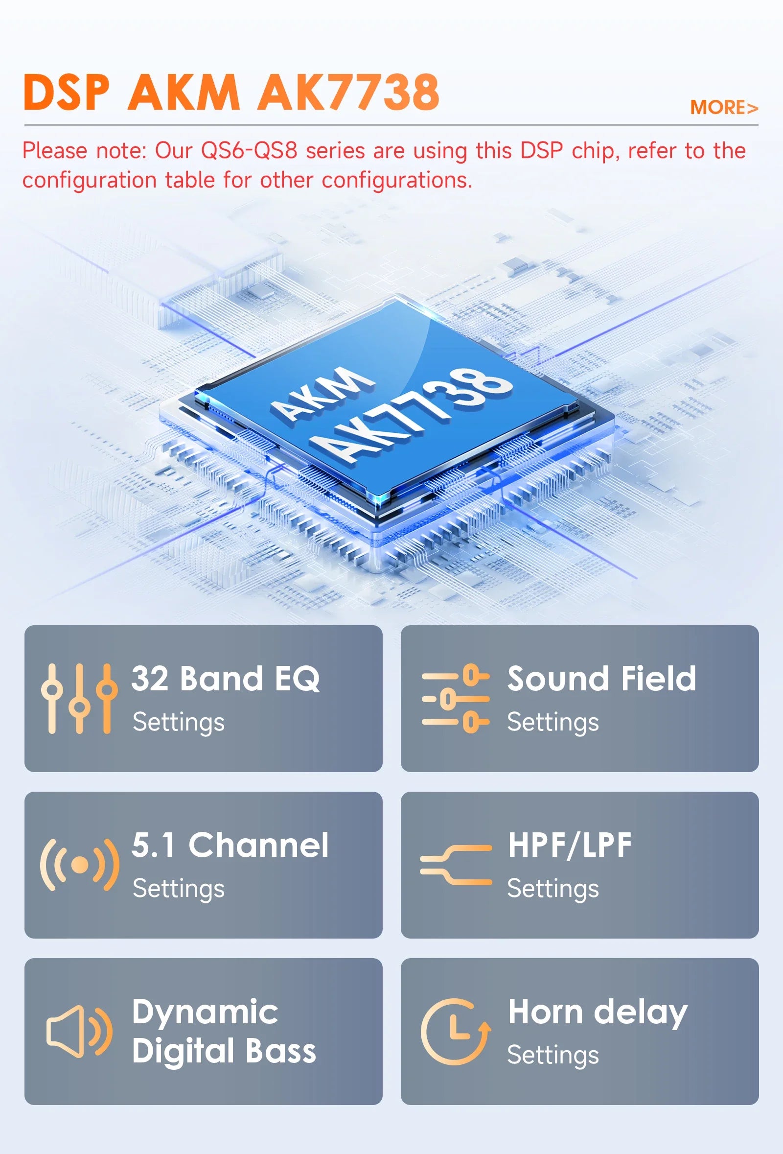 Please note: Our QS6-QS8 series are using this DSP chip, refer to the configuration table for other configurations. 32 BAND EQ