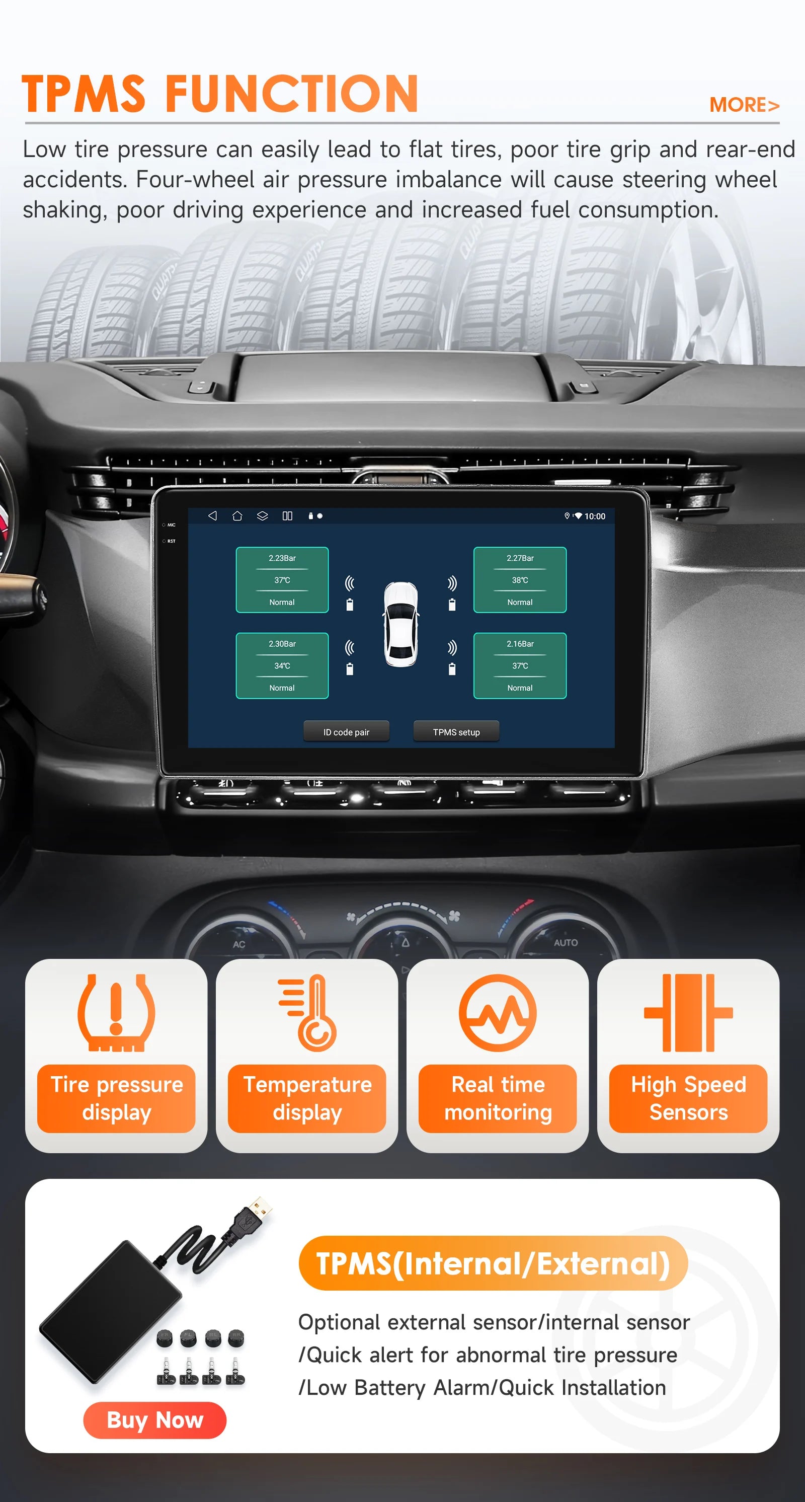 Low tire pressure can easily lead to flat tires, poor tire grip and rear-endaccidents. Four-wheel air pressure imbalance will cause steering wheelshaking,poor driving experience and increased fuel consumption.