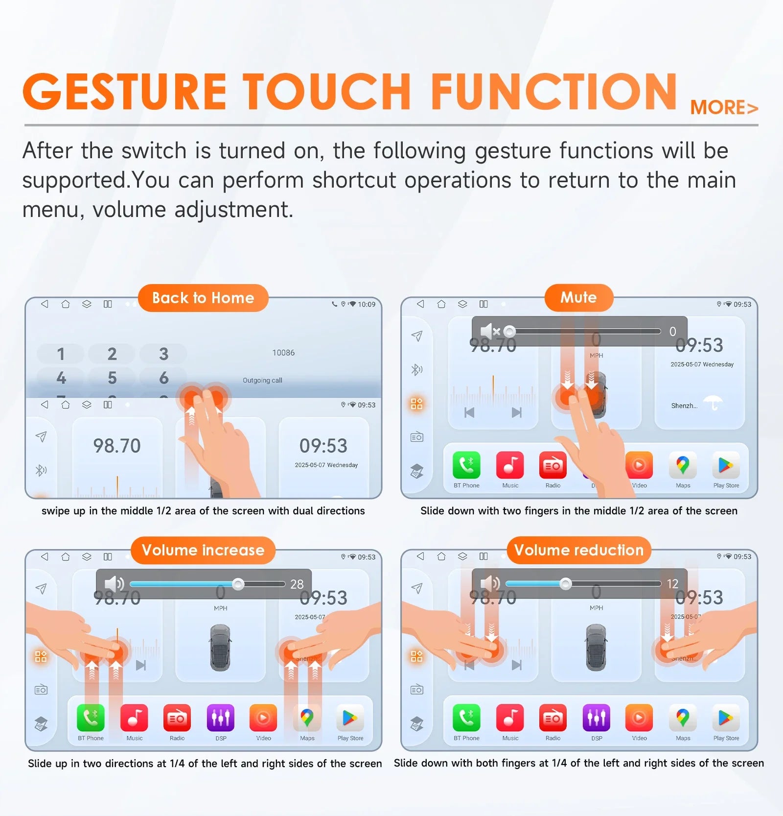 After the switch is turned on,the following gesture functions will be supported.You can perform shortcut operations to return to the main menu, volume adjustment.