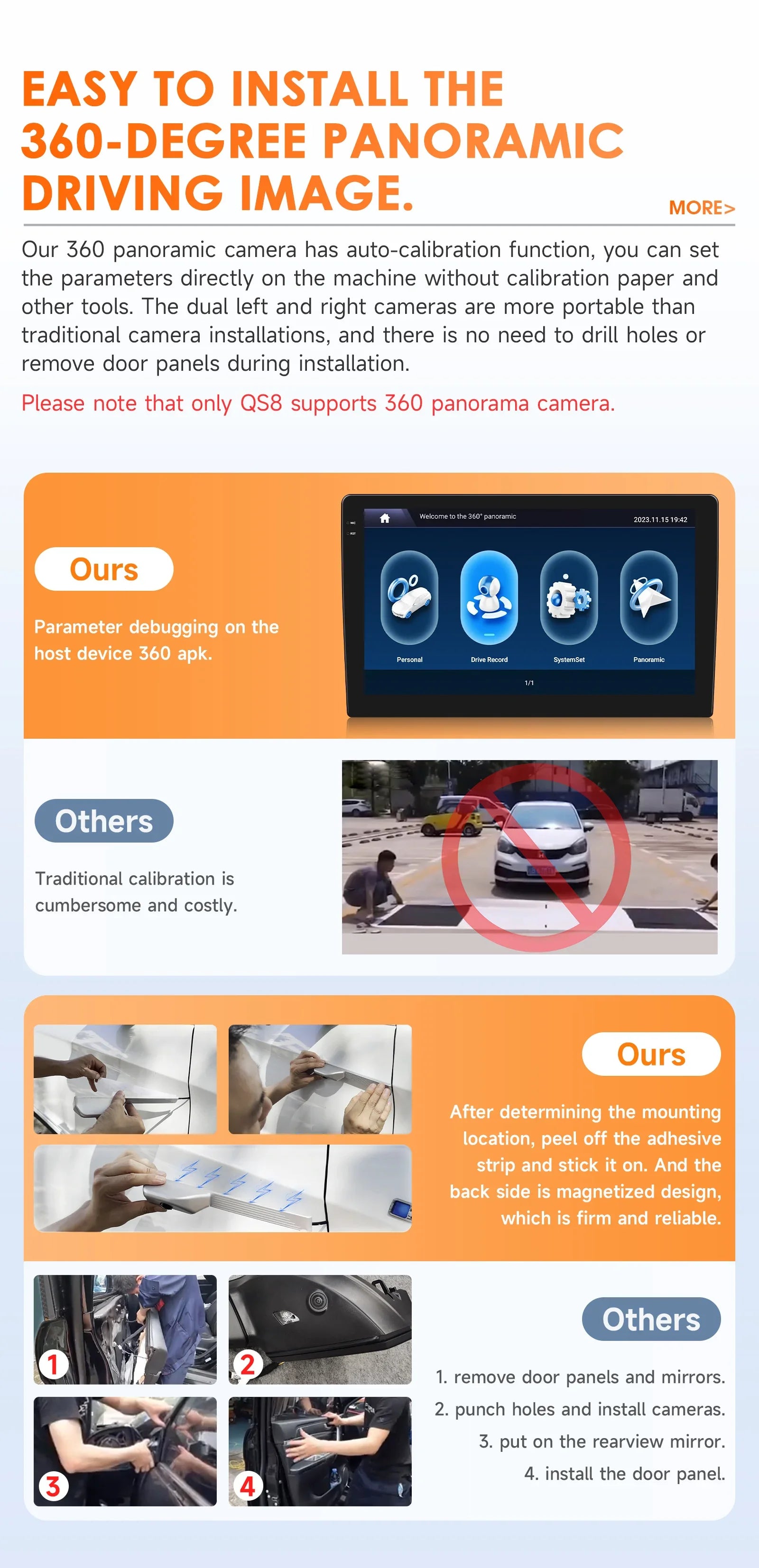 Our 360 panoramic camera has auto-calibration function, you can setthe parameters directly on the machine without calibration paper and other tools.The dual left and right cameras are more portable than traditional camera installations,and there is no need to drill holes or remove door panels during installation.