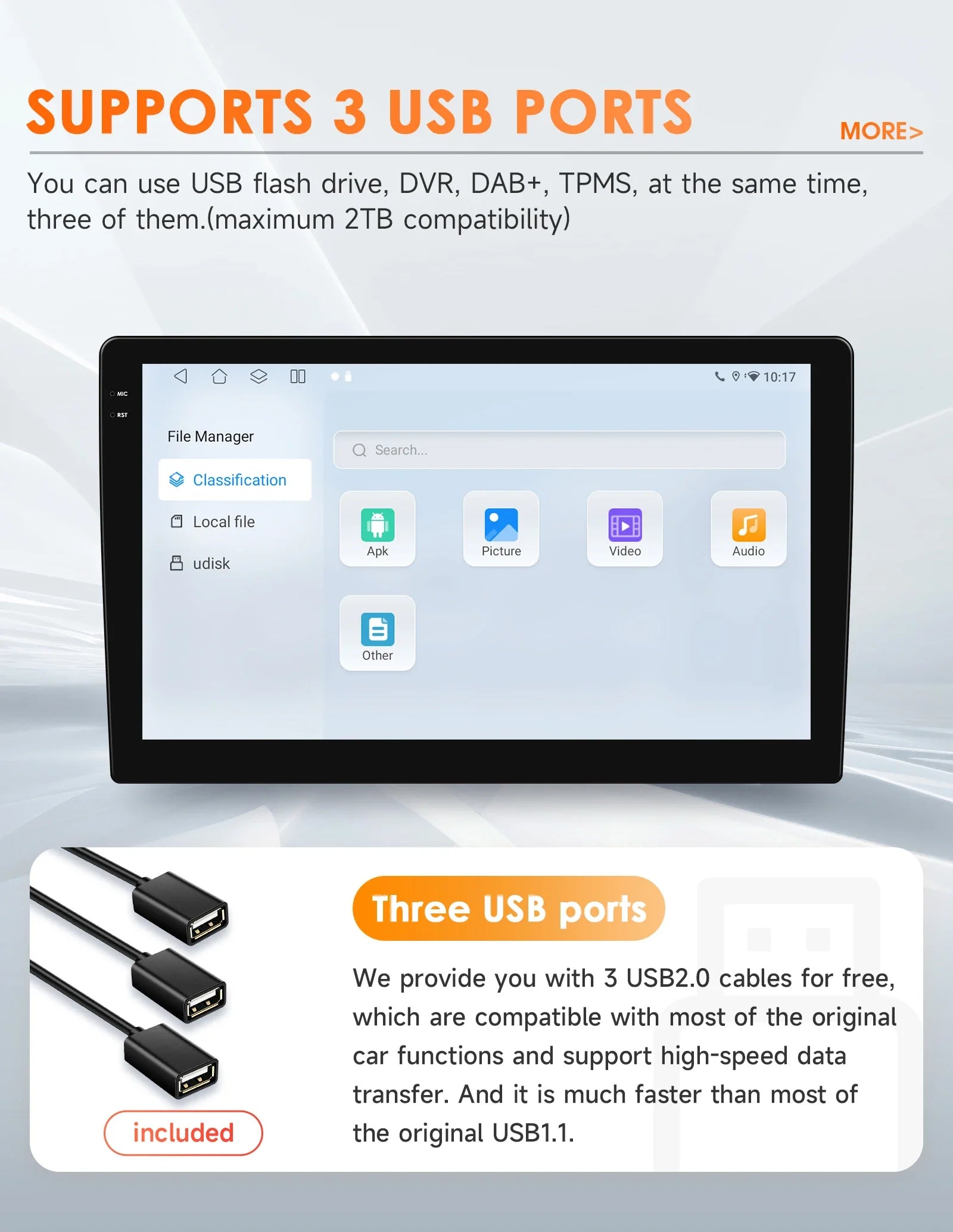 You can use USB flash drive,DVR,DAB+,TPMS,at the same time,three of them.(maximum 2TB compatibility)