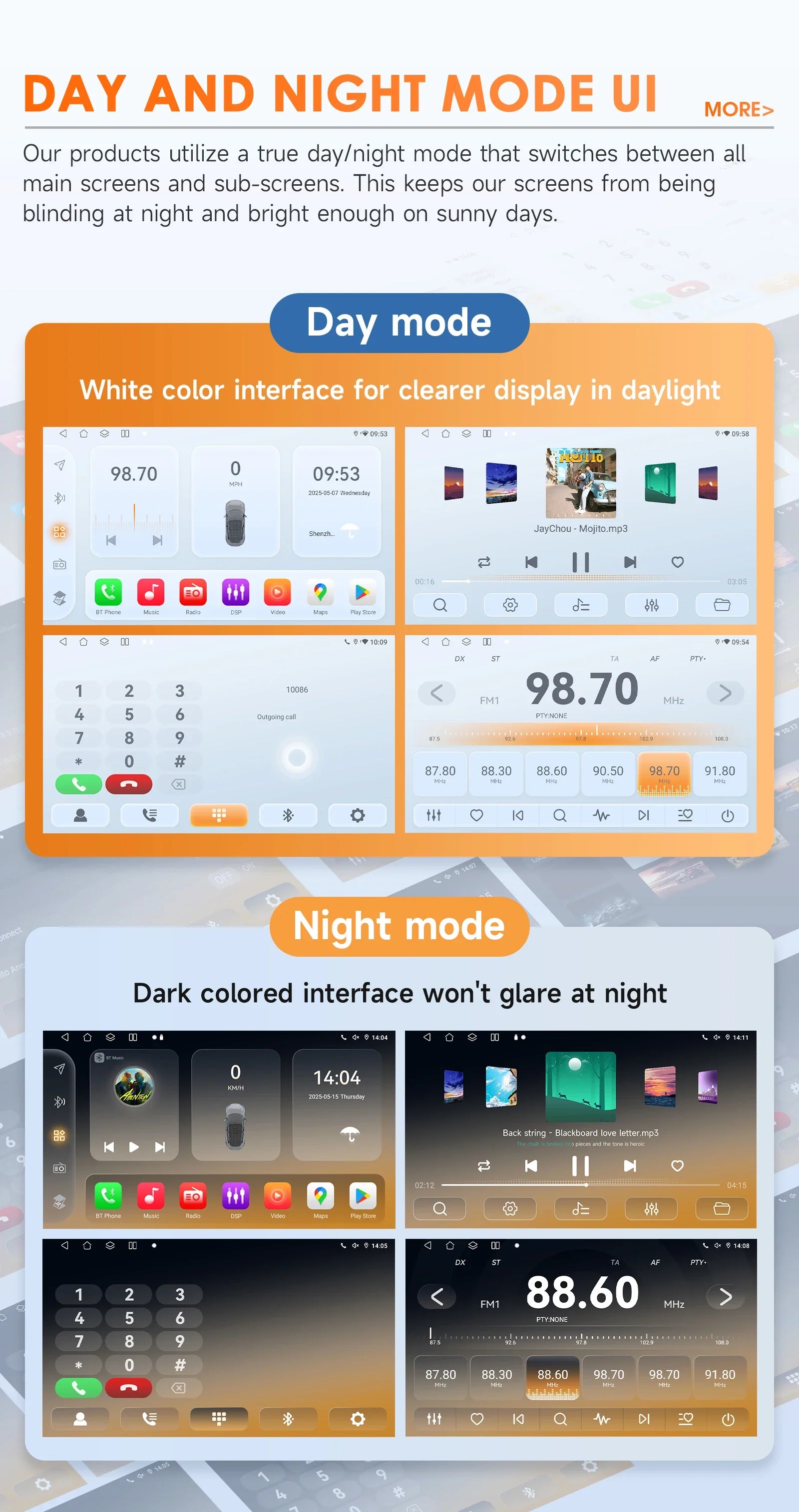 Our products utilize a true day/night mode that switches between all main screens and sub-screens.This keeps our screens from being blinding at night and bright enough on sunny days.