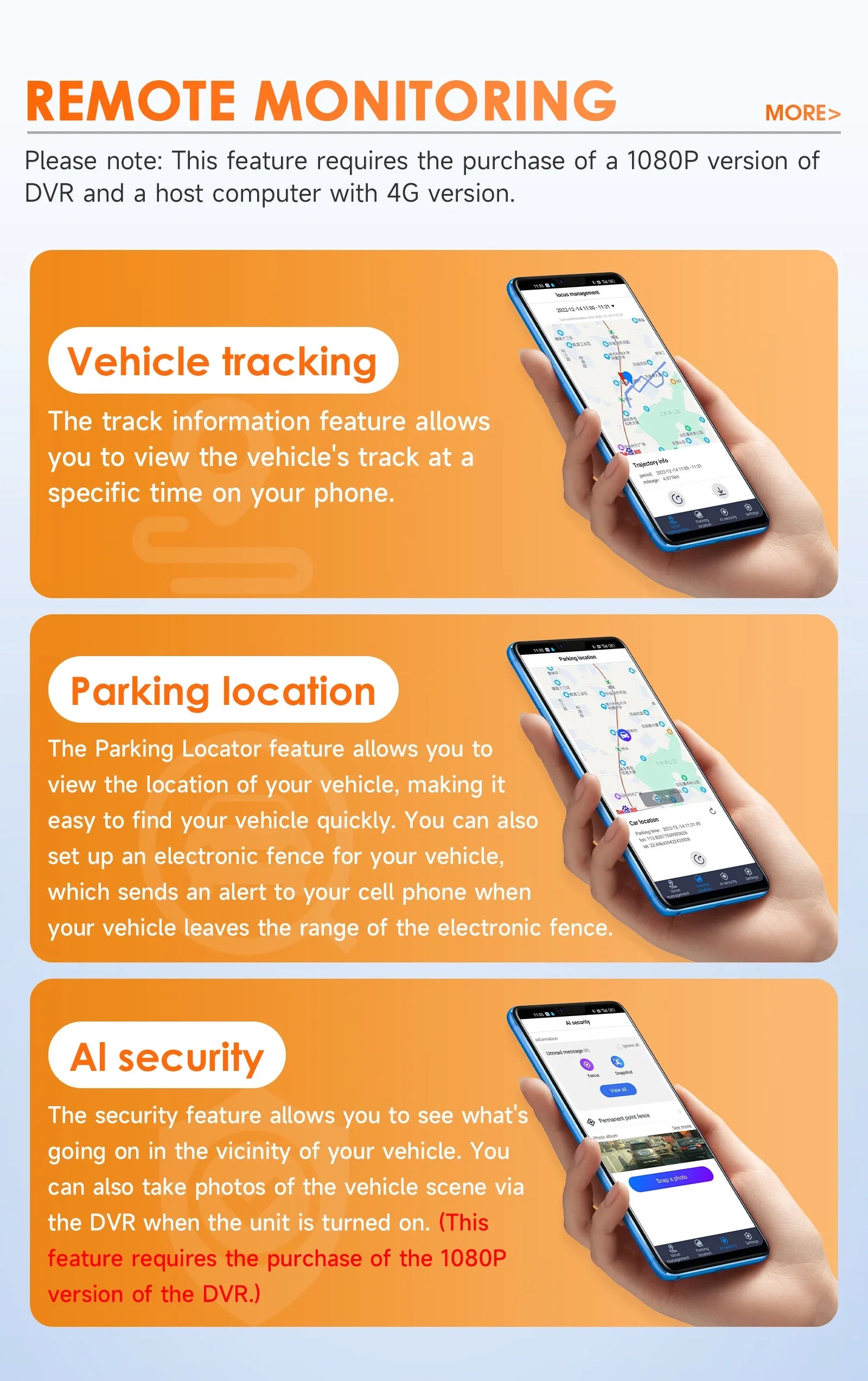 3.Al security:The security feature allows you to see what's going on in the vicinity of your vehicle.You can also take photos of the vehicle scene via the DVR when the unit is turned on.