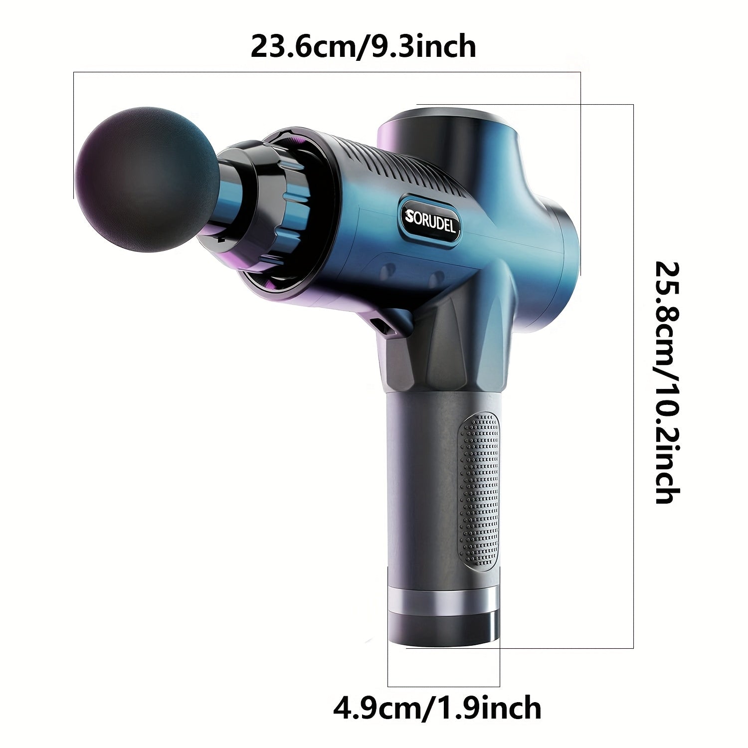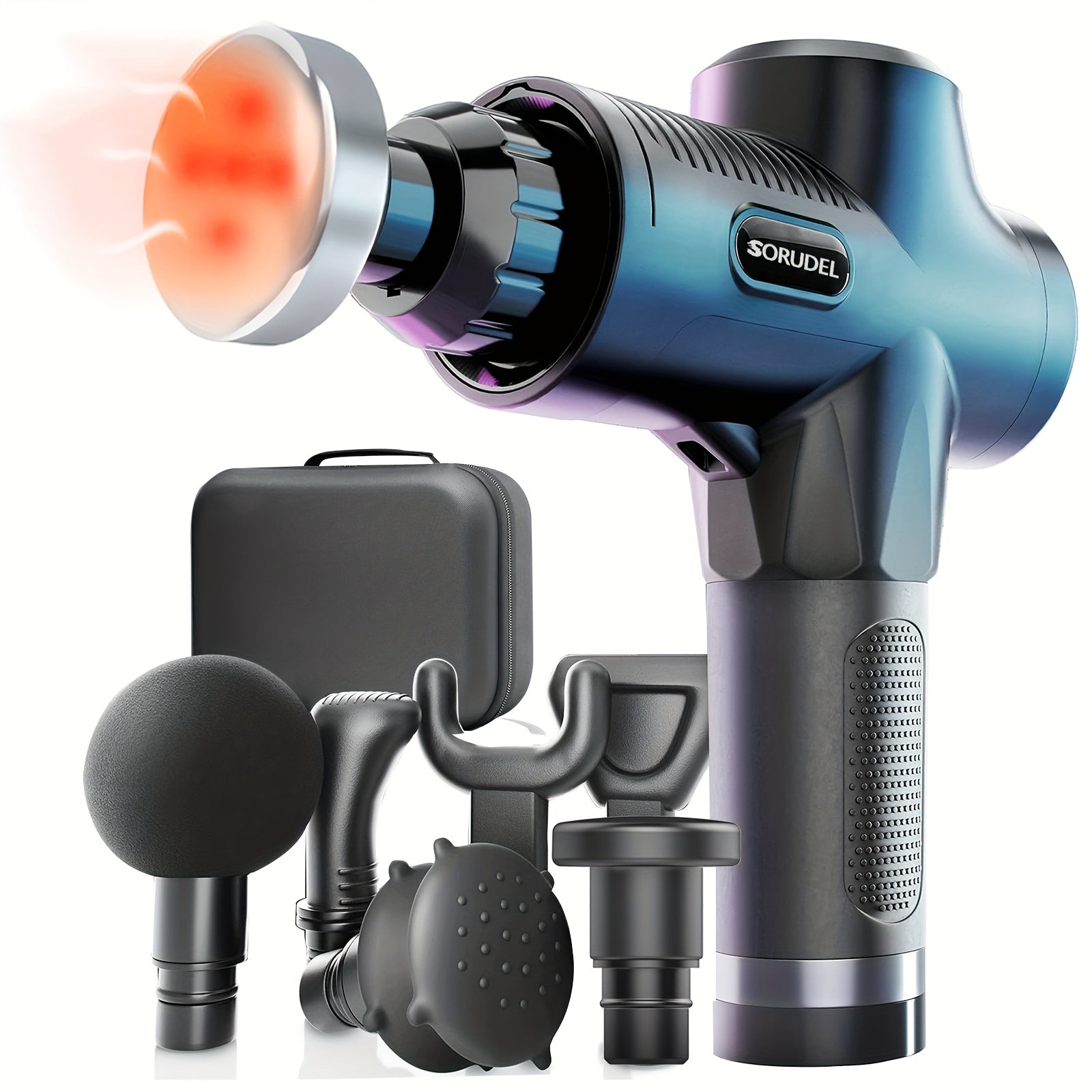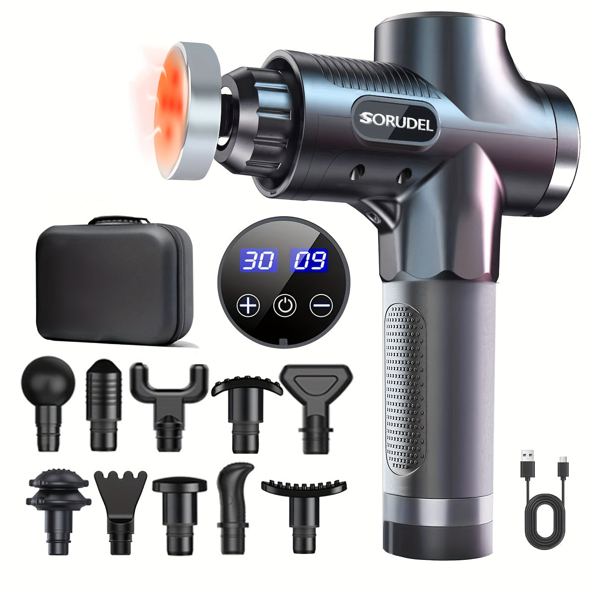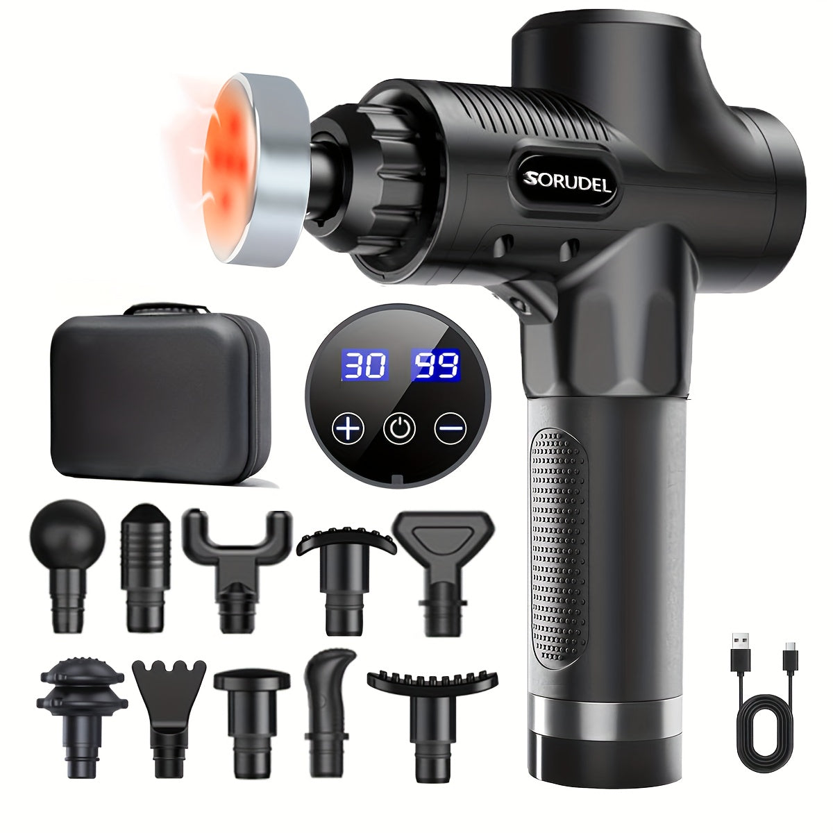 SORUDEL Pistola Massaggiante Riscaldante, Stimolatore Muscolare Elettrico Portatile con 11 Testine di Massaggio, Fascia Gun ad Alta Potenza, Motore Senza Spazzole, Ricarica Rapida USB, Include Borsa per il Trasporto, Adatto per l'Allenamento delle Gambe