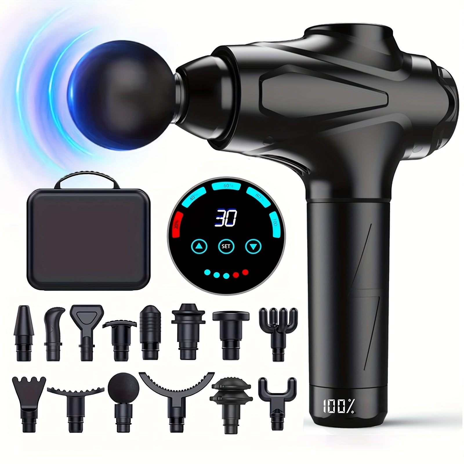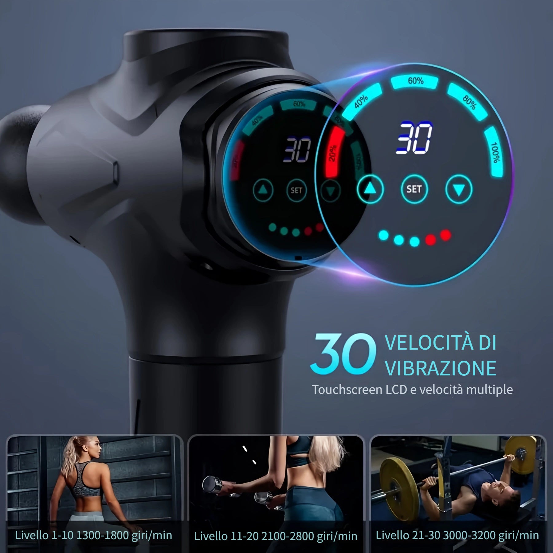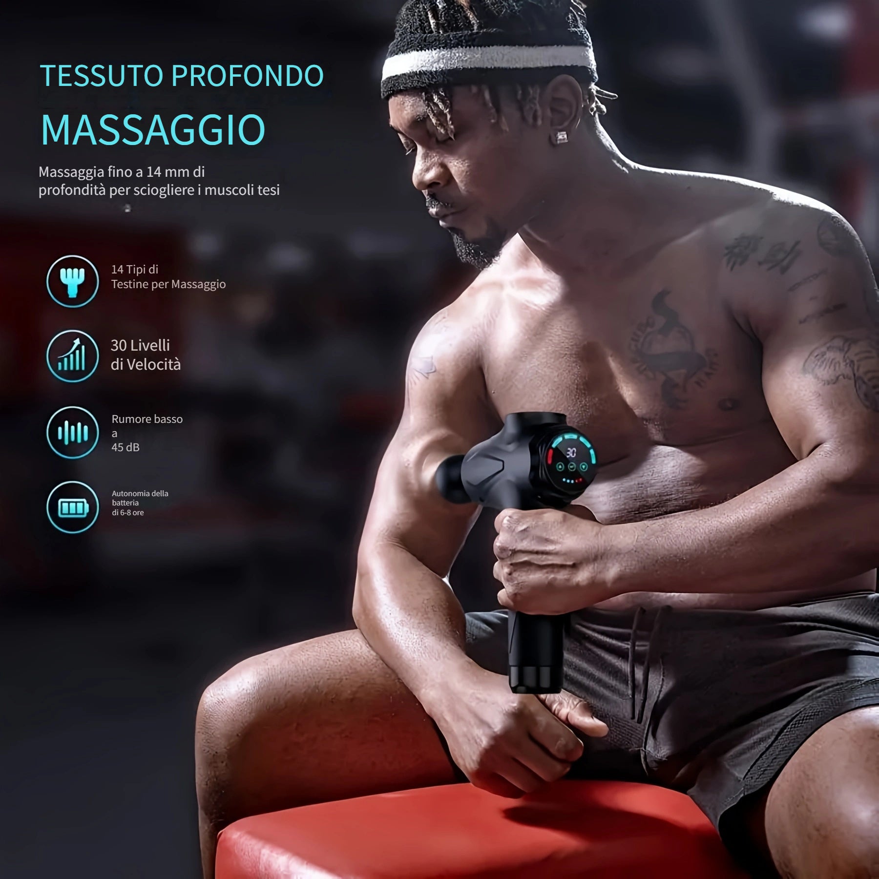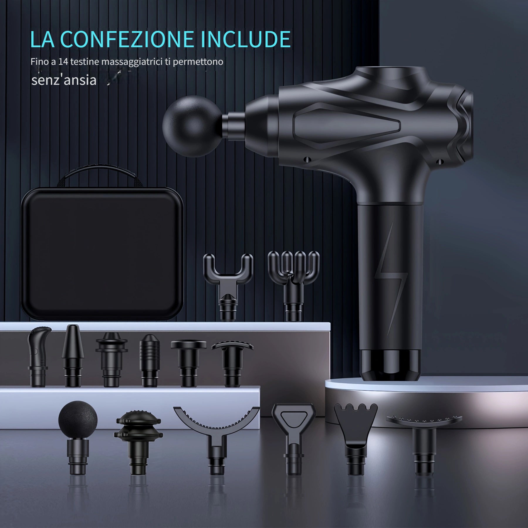SORUDEL Pistola Massaggiatrice Professionale per Tessuti Profondi con 14 Testine, Motore ad Alta Potenza, Ricarica USB, Schermo Touch LCD, Ideale per Atleti e Allenamento Fitness, Include Borsa da Trasporto