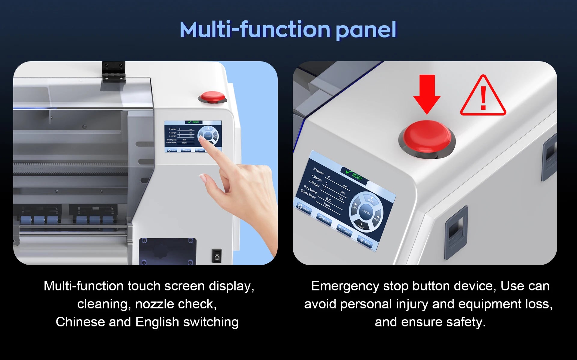 5. Display touch screen visivo multifunzione: basta fare clic sullo schermo per regolare la velocità di stampa, il controllo dell'ugello, l'impostazione della lingua e anche la pulizia automatica ecc., facile da usare.