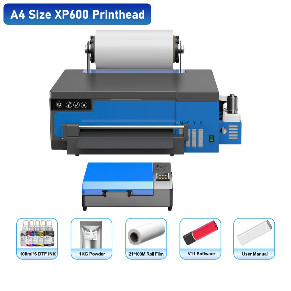 Stampante XP600 DTF + 250 ml *5 inchiostro + 1 kg di polvere + pellicola in rotolo da 100 m + software di stampa RFID + istruzioni video + portarotolo