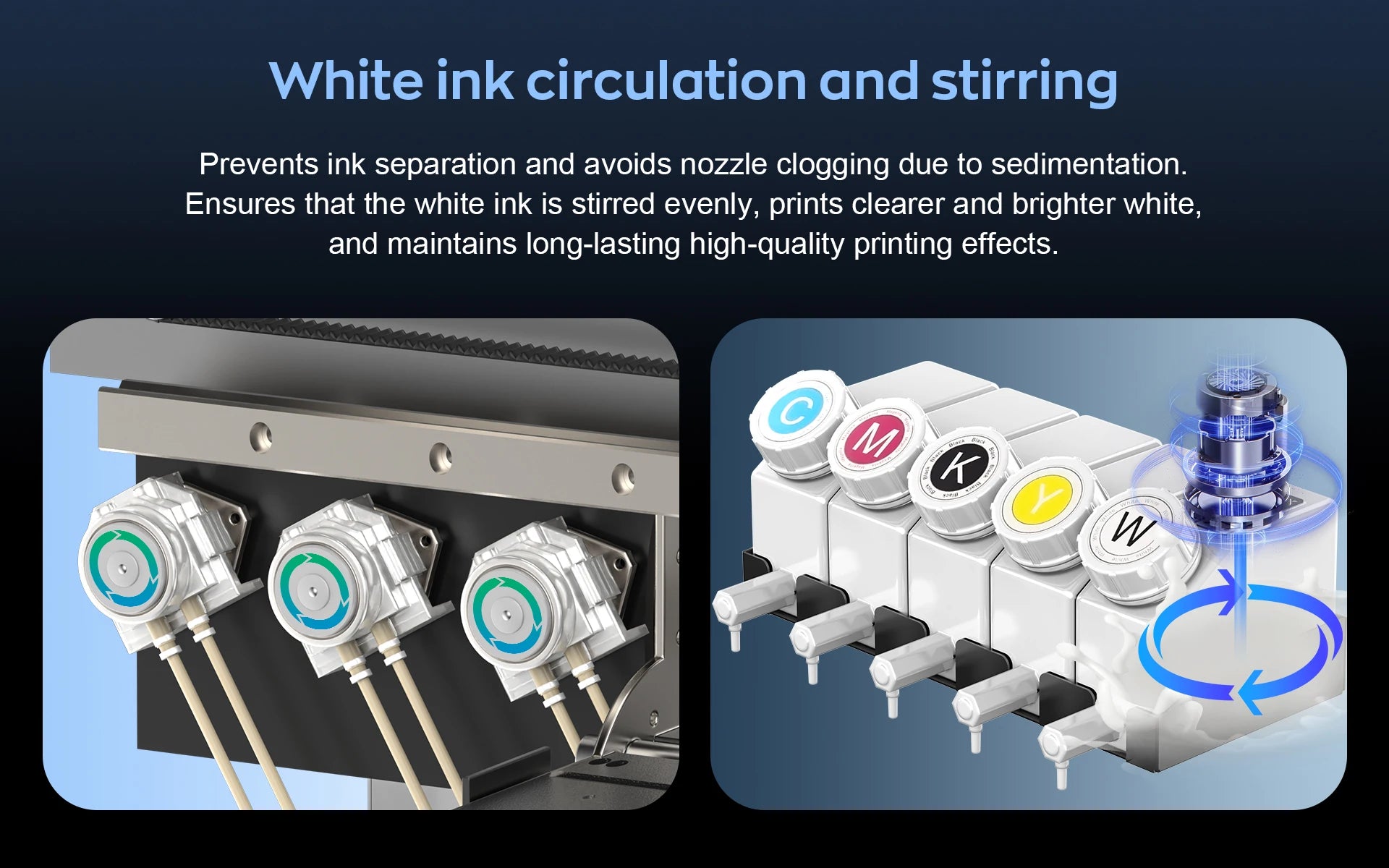 1. Agitazione dell'inchiostro bianco/circolazione dell'inchiostro bianco: per evitare l'intasamento dell'inchiostro bianco e impedire la precipitazione dell'inchiostro bianco