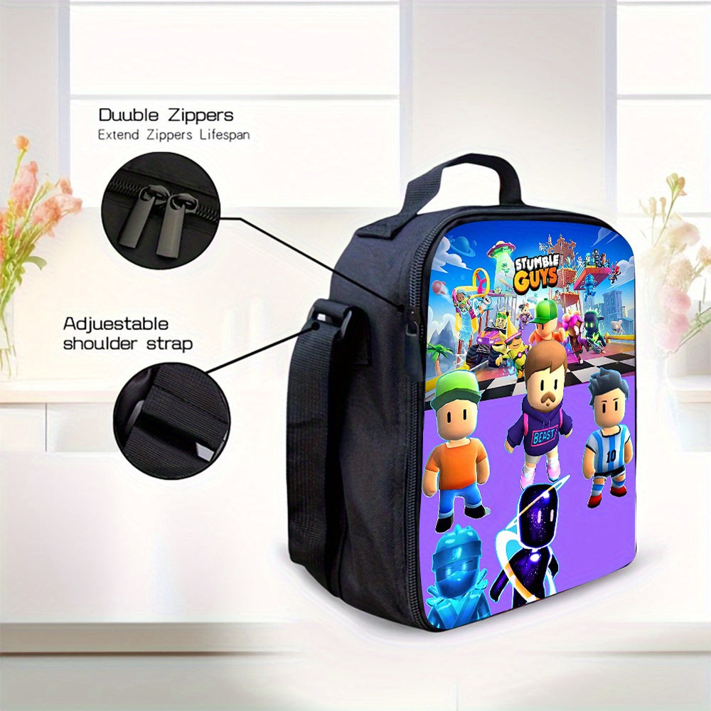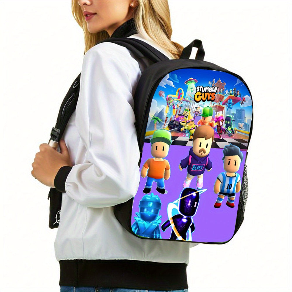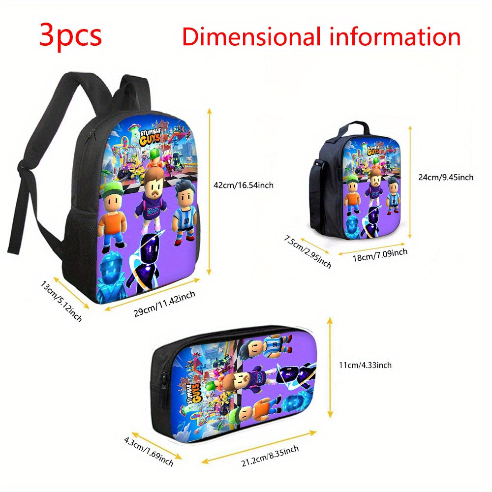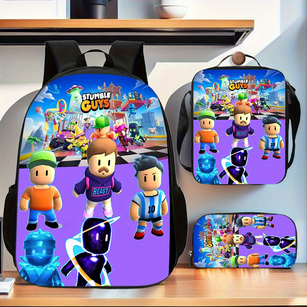 Stumble Guys 3pezzo Set di zaini con motivo a cartoni animati per studenti, leggero e pieghevole con cinghie regolabili, include un zaino casual a doppia spalla di grande capacità, una borsa per matite e un contenitore per il pranzo per la scuola, regalo