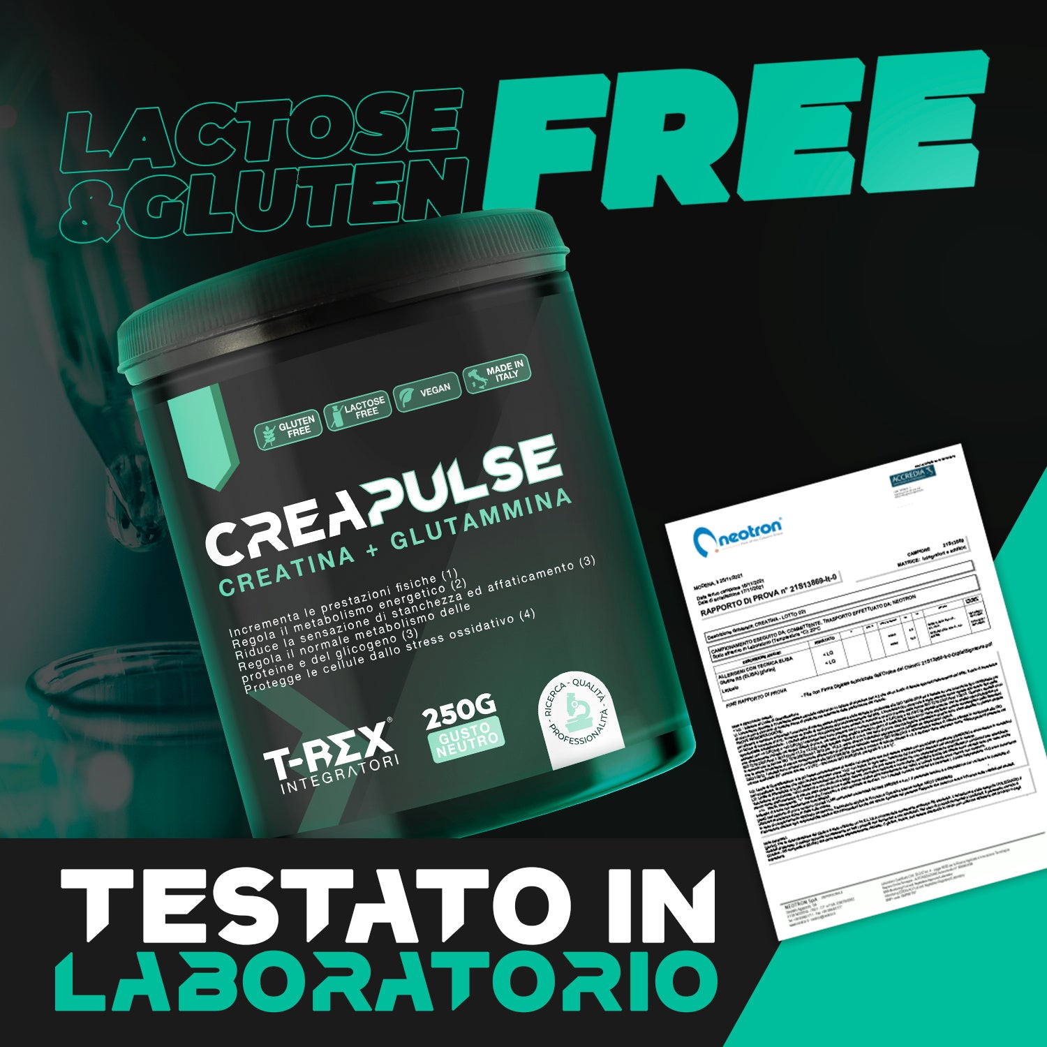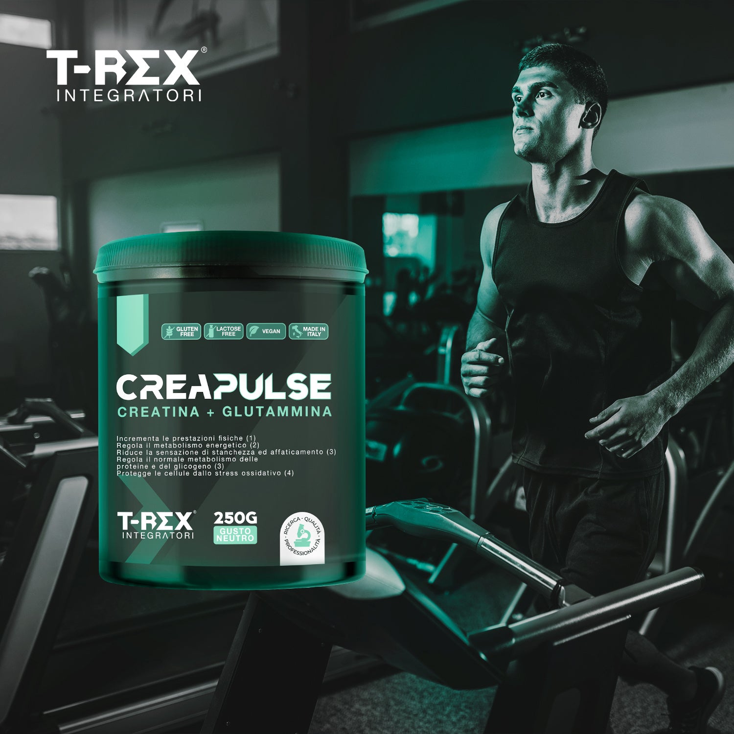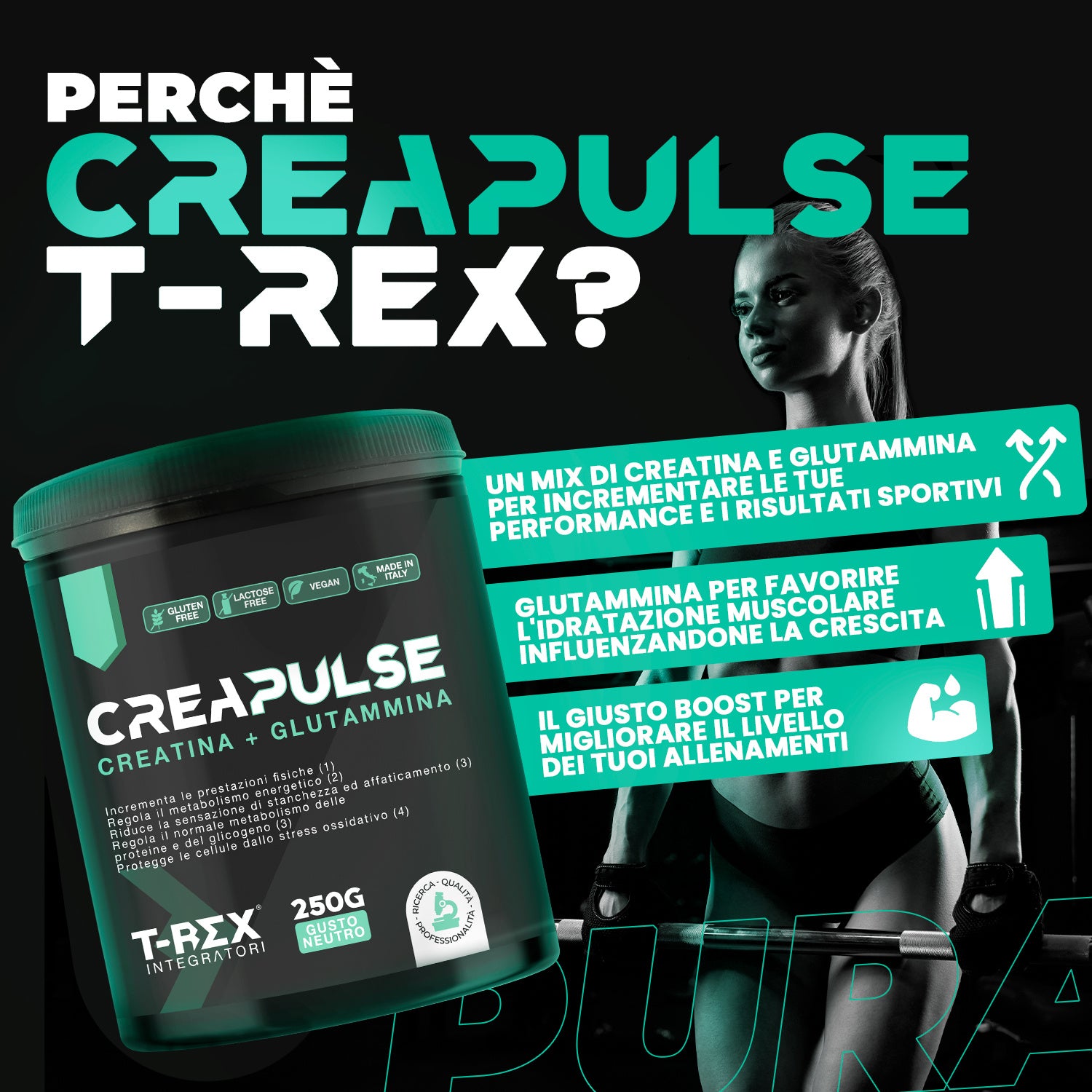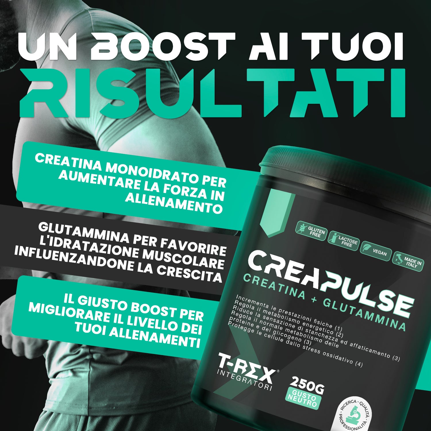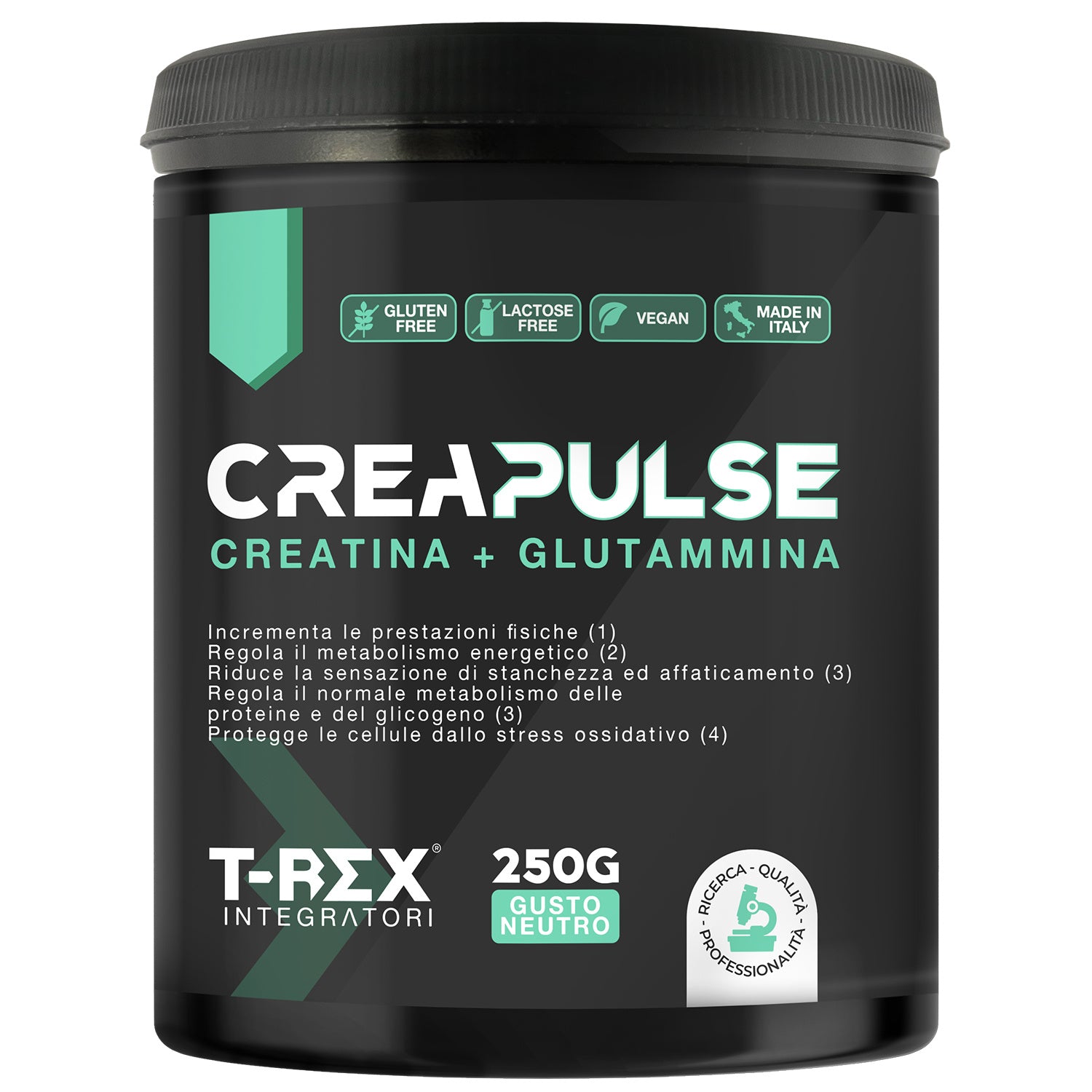 T-Rex Integratori, Creatina Monoidrata + Glutammina CreaPulse - Integratore alimentare per massa muscolare, definizione e boost energetico pre workout 250 g Polvere