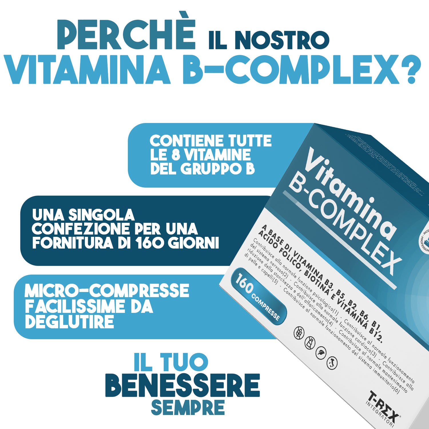 T-Rex Integratori, Vitamina B Complex 160 Compresse Vegan (5 Mesi di Fornitura) - Alto Dosaggio di Vitamina B12, Acido Folico, Biotina, Niacinamide - Difese Immunitarie Per Uomo, Donna e Ragazzi