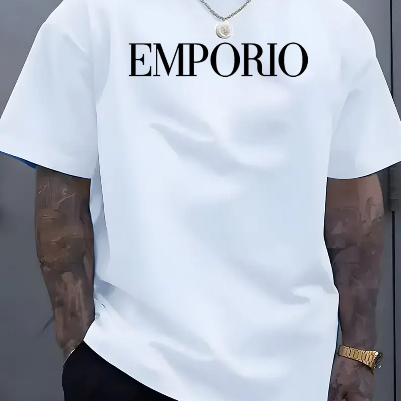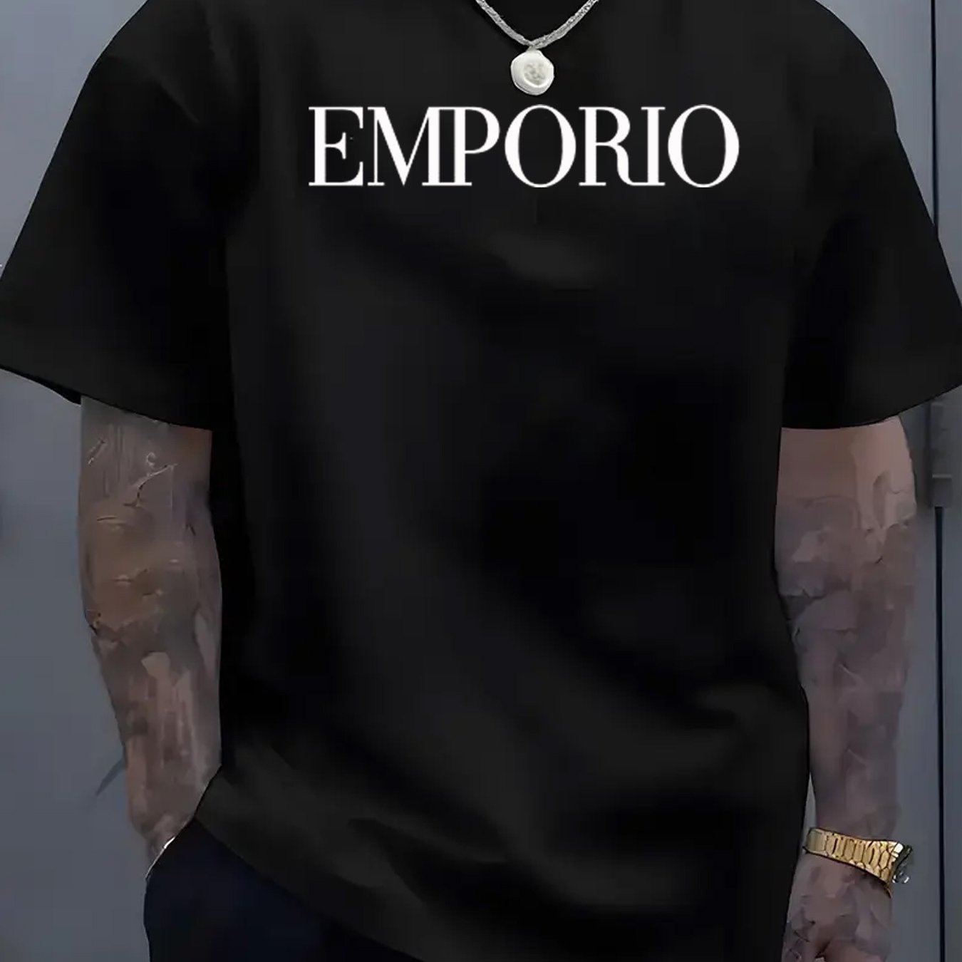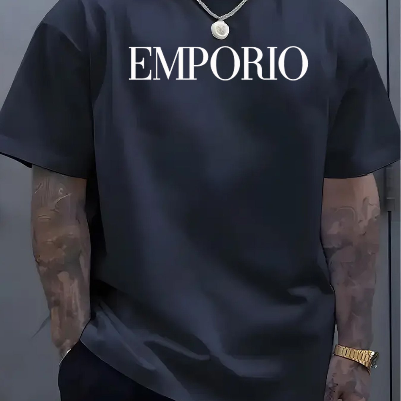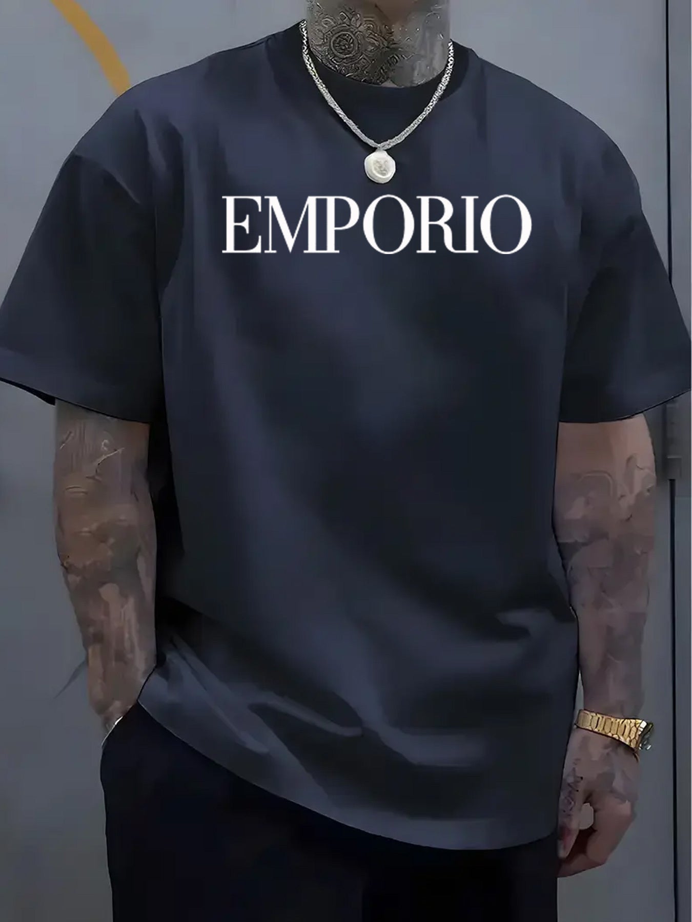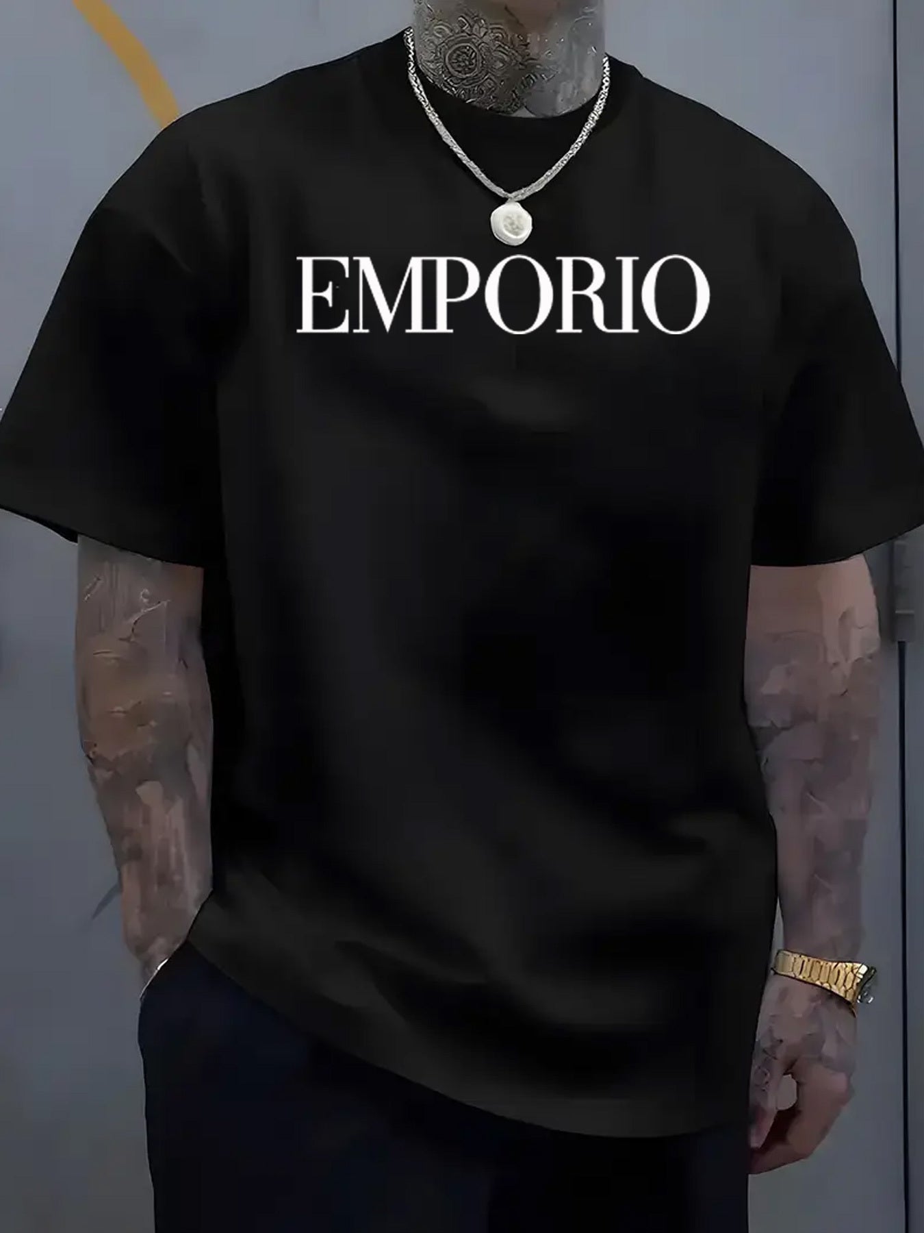 T-shirt casual da uomo con maniche corte - Stampa "EMPORIO", nero, scollo rotondo, leggero misto di poliestere, perfetto per attività all'aperto, abbigliamento casual all'aperto | T-shirt con grafica audace | Aderenza comoda