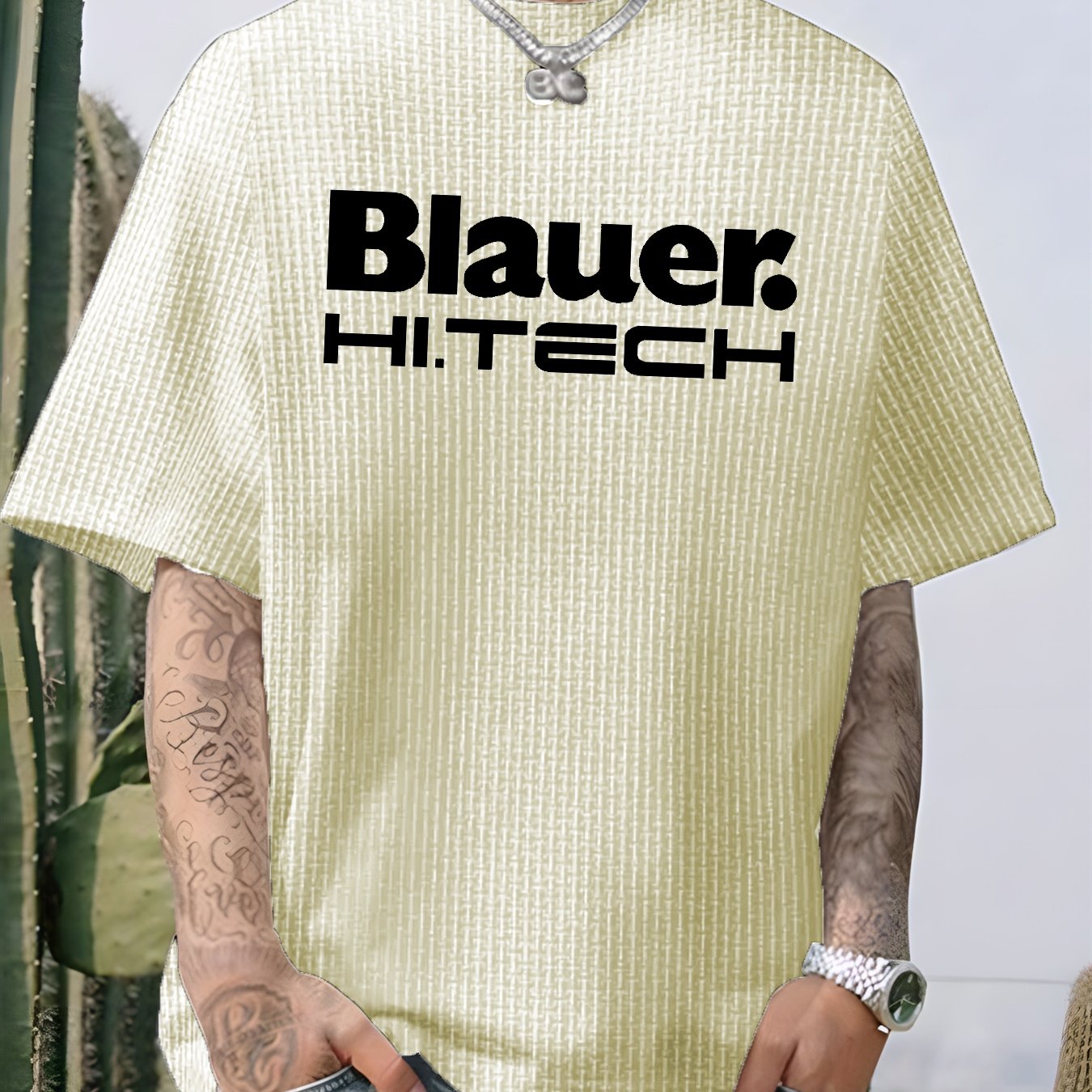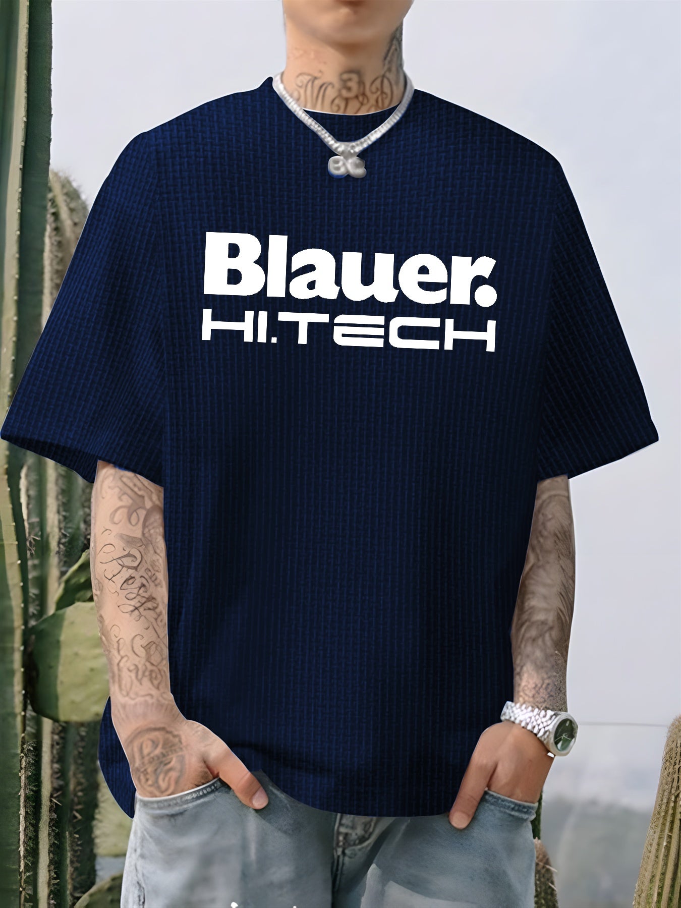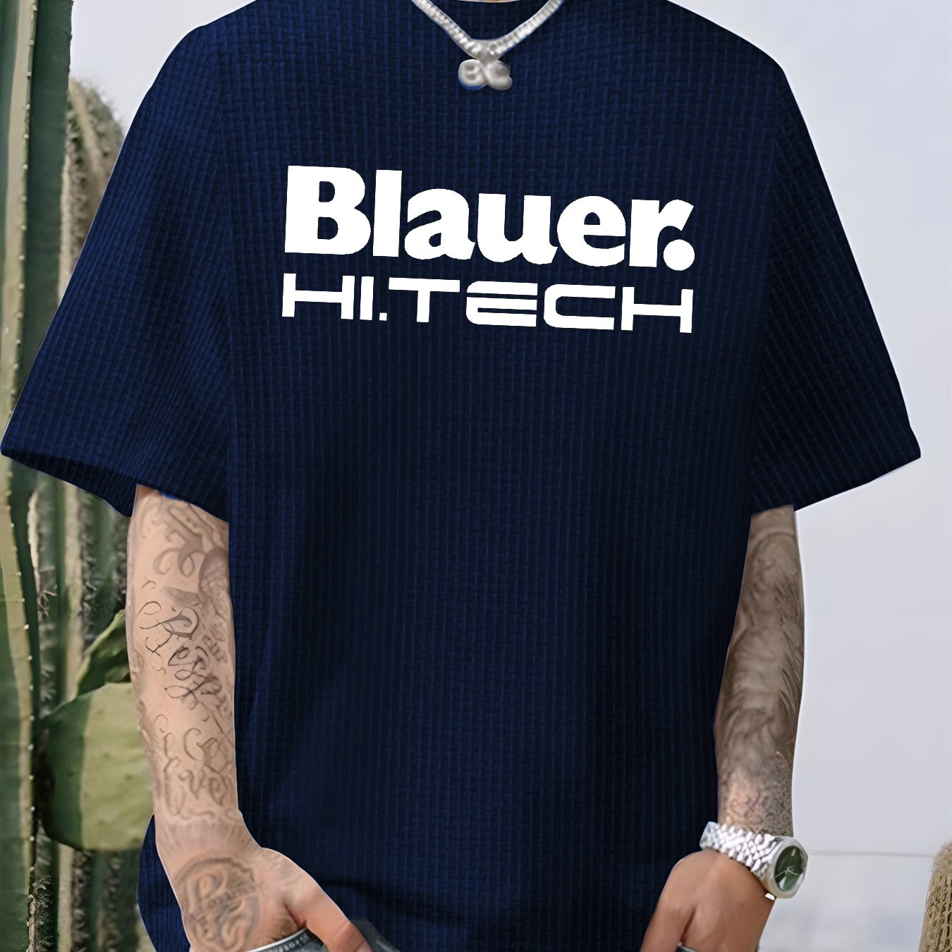 T-shirt grafica "Blauer Hitch" da uomo - Tessuto a waffle blu navy, T-shirt casual estivo a maniche corte con stampa di lettere audaci, traspirante e confortevole per abbigliamento casual, T-shirt da tutti i giorni | T-shirt con stampa grafica | Tessuto t