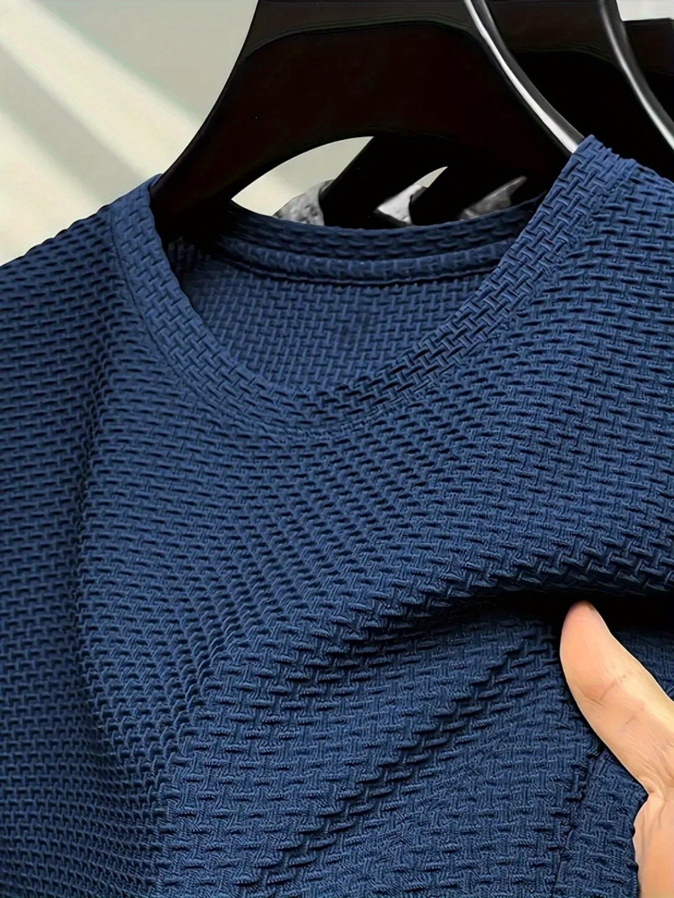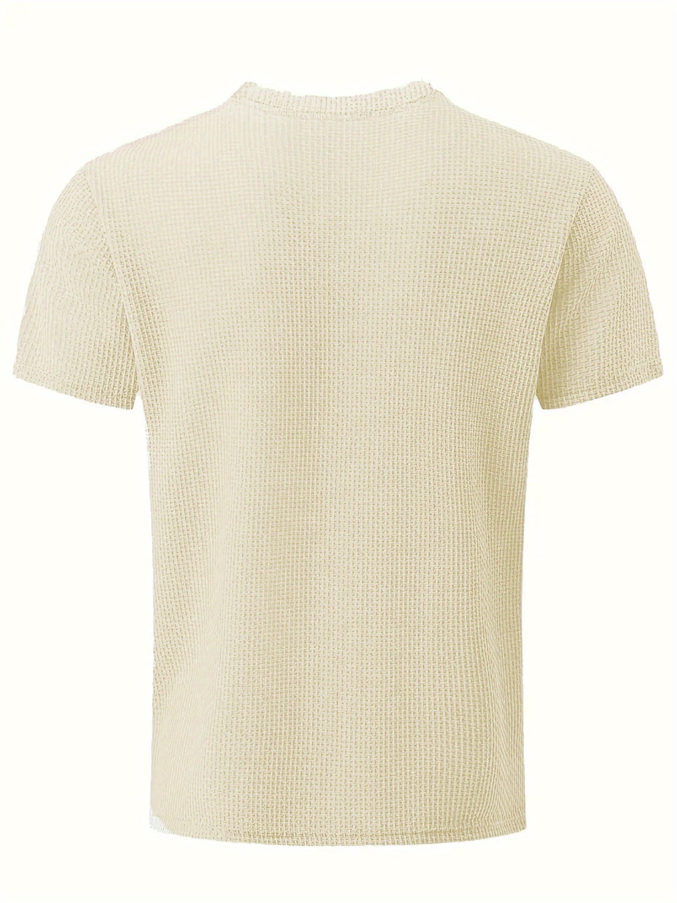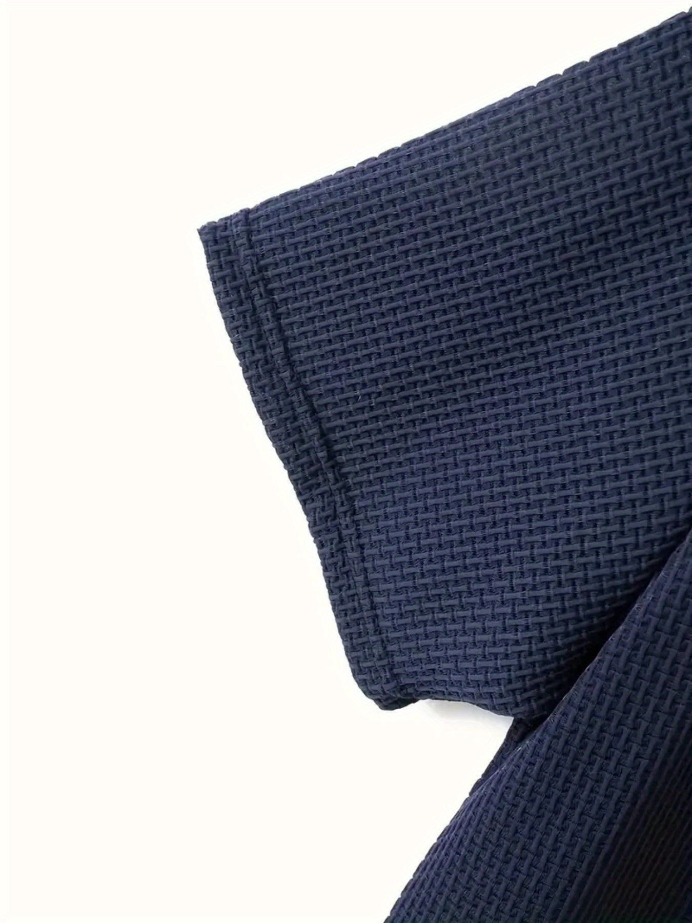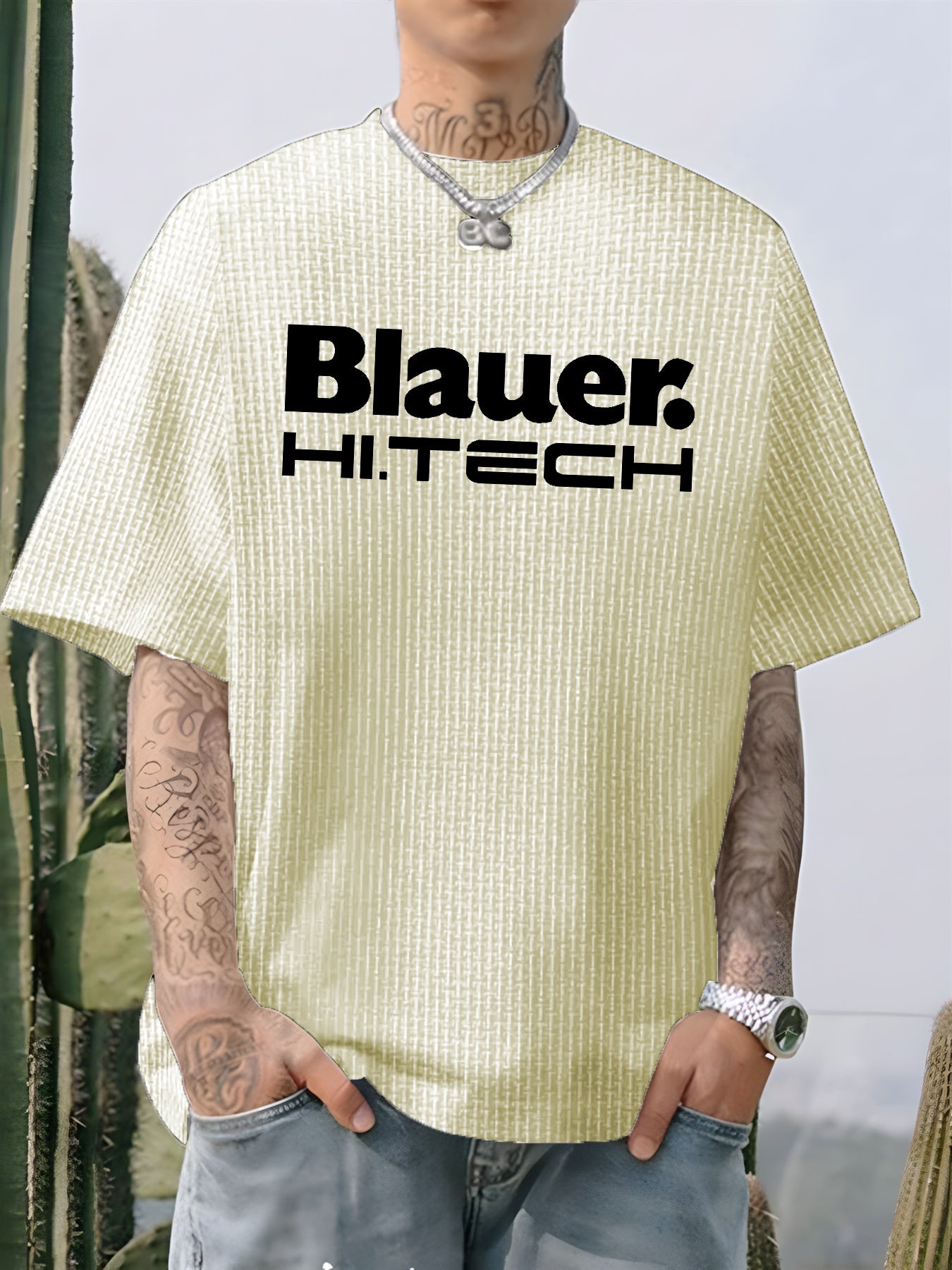 T-shirt grafica "Blauer Hitch" da uomo - Tessuto a waffle blu navy, T-shirt casual estivo a maniche corte con stampa di lettere audaci, traspirante e confortevole per abbigliamento casual, T-shirt da tutti i giorni | T-shirt con stampa grafica | Tessuto t