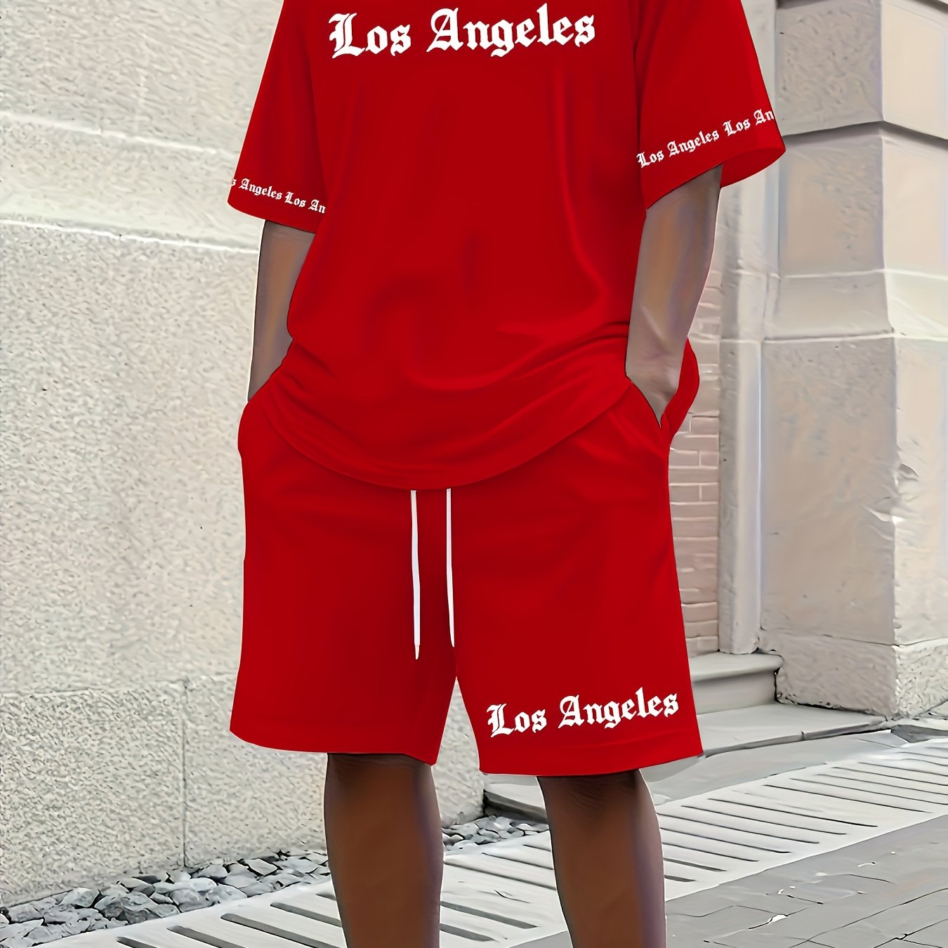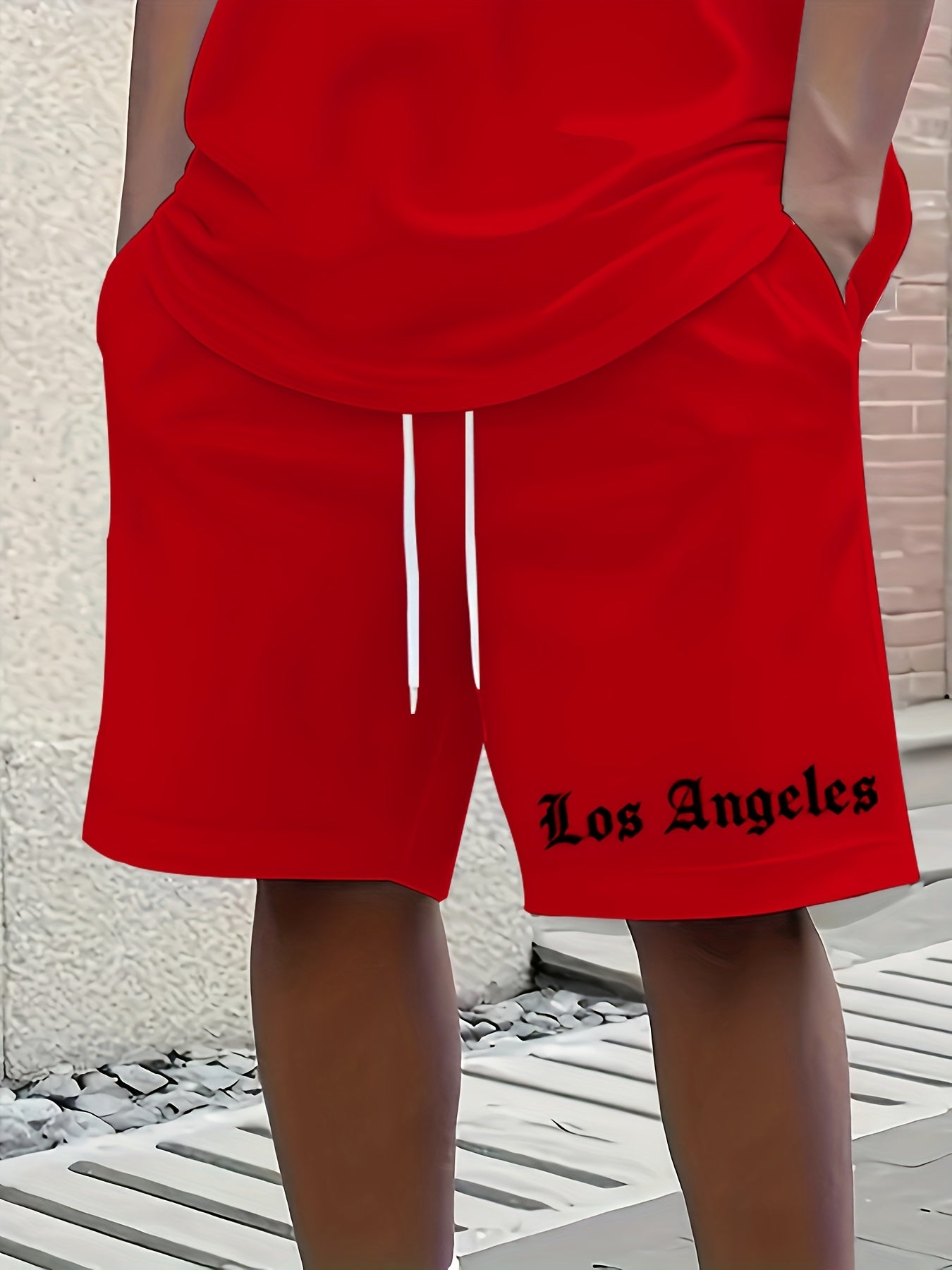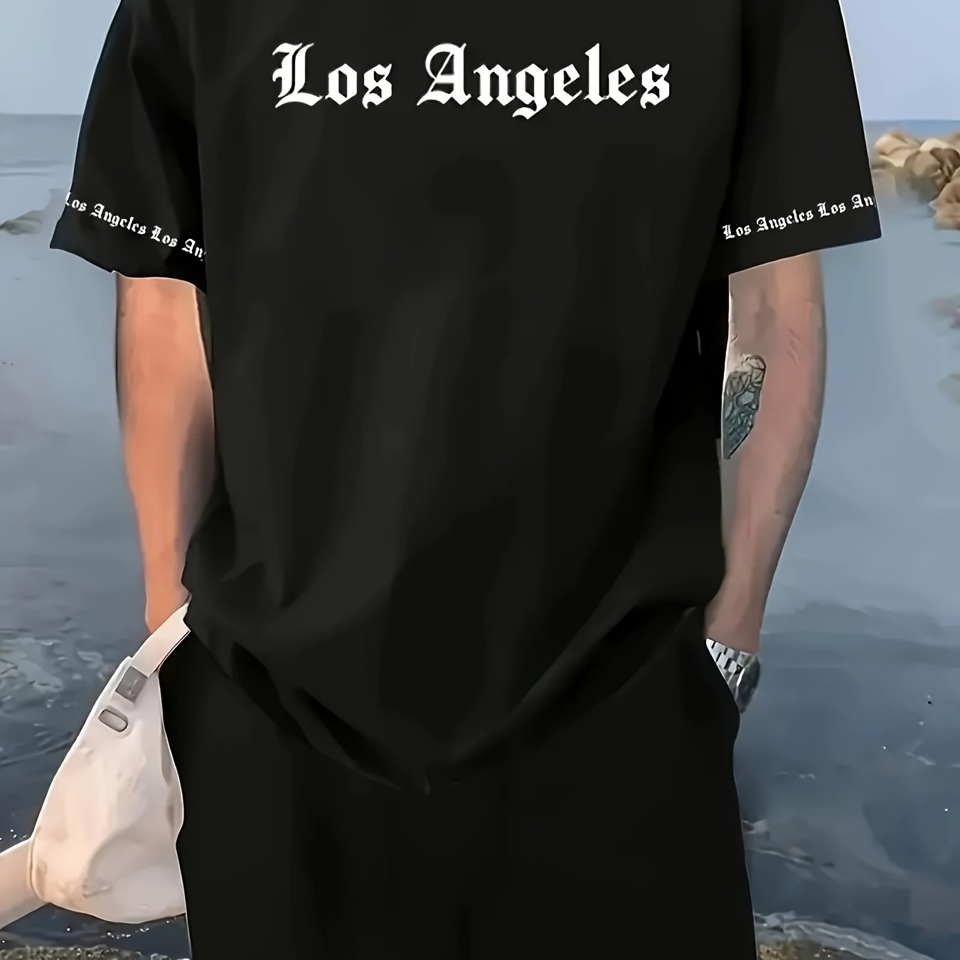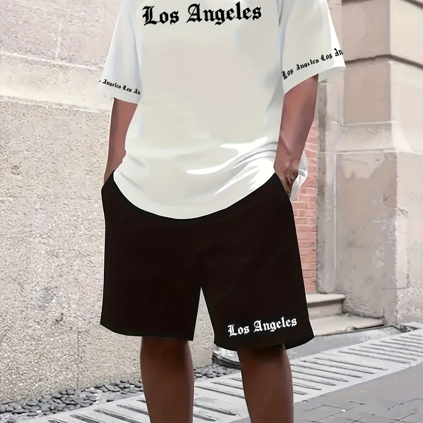 T-shirt grafica casual da uomo con stampa 3D "Los Angeles" - morbida e traspirante, con pantaloncini con coulisse e tasche, abbigliamento estivo casual|T-shirt grafica|Abito comodo, abbigliamento Los Angeles